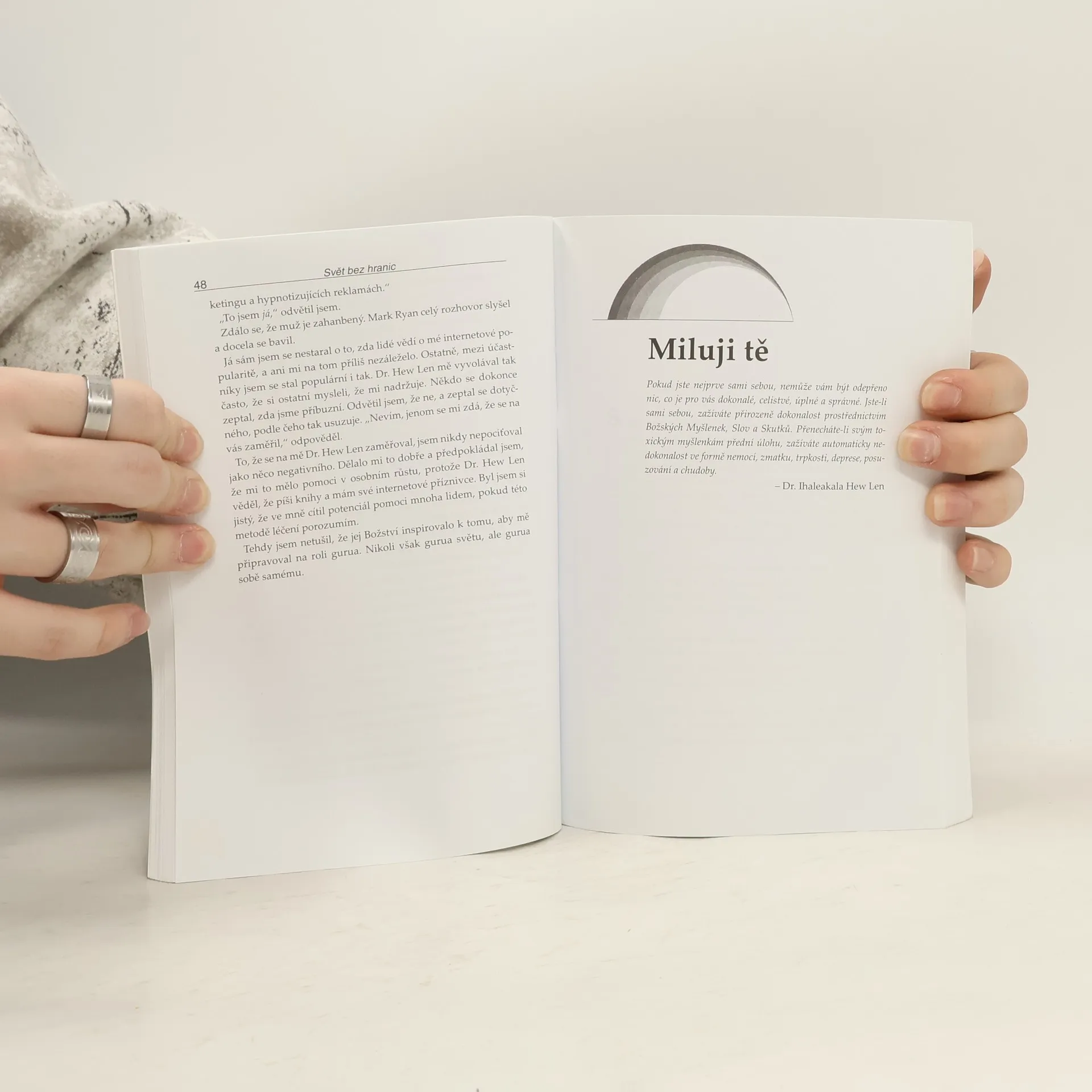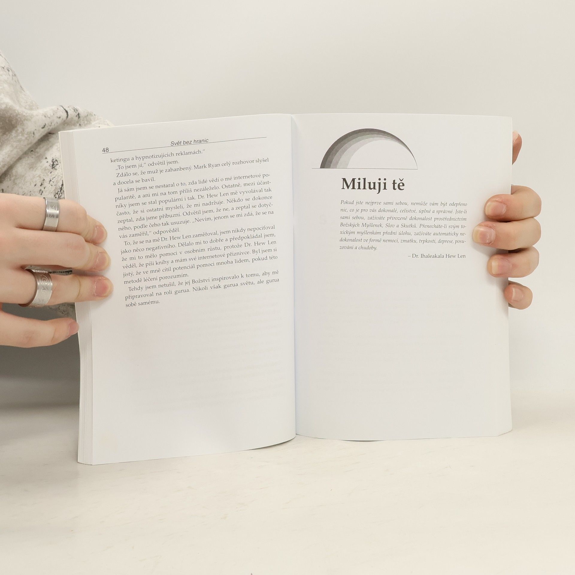 Joe Vitale, autor světového bestselleru Síla přitažlivosti, ve své další knize Svět bez hranic vypráví neobyčejný příběh Dr. Ihaleakala Hew Lena, terapeuta, který vyléčil celé oddělení mentálně postižených recidivistů, aniž by kteréhokoliv z nich viděl. Kniha popisuje jeho metodu. Popisuje skutečnou příčinu všeho, co se vám přihodí a jak "očistit" negativitu, abyste se mohli znovu spojit s Božskou podstatou. "Dr. Hew Len mi vysvětlil, že přijmout absolutní zodpovědnost za svůj život, tedy za vše, co se v mém životě objeví, znamená uznat, že vše kolem mne je mým vlastním výtvorem." Vím, že to je obtížné to pochopit, natož to přijmout nebo podle toho opravdu žít. Vinit druhé nebo své okolí je mnohem snažší, než přijmout naprostou zodpovědnost. Během rozhovoru s Hew Lenem jsem začal chápat, že léčení z jeho pohledu a v duchu ho'oponopono znamená milovat sám sebe. Chcete-li zlepšit svůj život, musíte jej vyléčit. Chcete-li někoho uzdravit, a může jít klidně o mentálně chorého vězně, musíte nejprve vyléčit sebe." Joe Vitale Kniha Svět bez hranic je jednou z nejúchvatnějších knih, která kdy vůbec byla napsána.