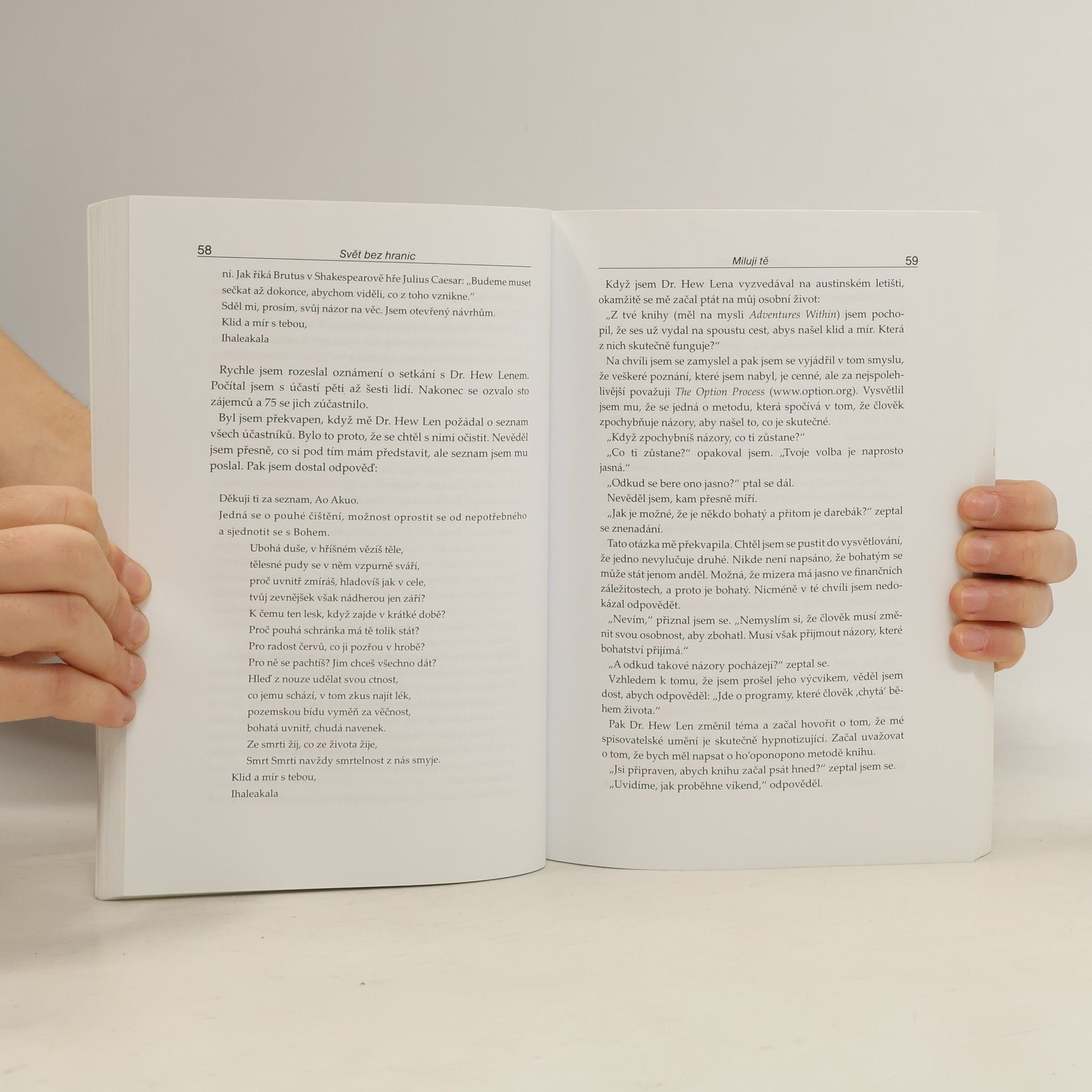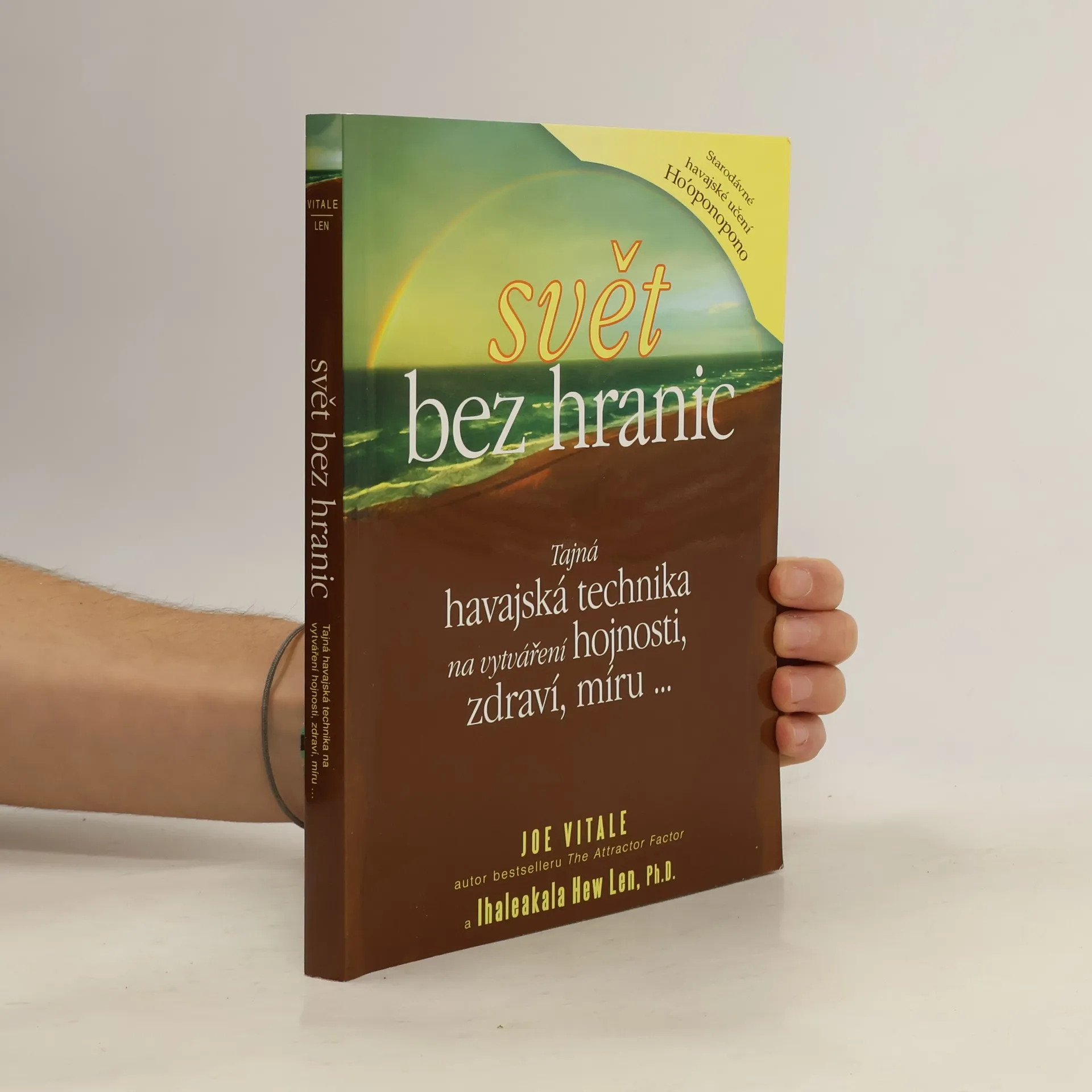 Joe Vitale, autor světového bestselleru Síla přitažlivosti, ve své další knize Svět bez hranic vypráví neobyčejný příběh Dr. Ihaleakala Hew Lena, terapeuta, který vyléčil celé oddělení mentálně postižených recidivistů, aniž by kteréhokoliv z nich viděl. Kniha popisuje jeho metodu. Popisuje skutečnou příčinu všeho, co se vám přihodí a jak "očistit" negativitu, abyste se mohli znovu spojit s Božskou podstatou. "Dr. Hew Len mi vysvětlil, že přijmout absolutní zodpovědnost za svůj život, tedy za vše, co se v mém životě objeví, znamená uznat, že vše kolem mne je mým vlastním výtvorem." Vím, že to je obtížné to pochopit, natož to přijmout nebo podle toho opravdu žít. Vinit druhé nebo své okolí je mnohem snažší, než přijmout naprostou zodpovědnost. Během rozhovoru s Hew Lenem jsem začal chápat, že léčení z jeho pohledu a v duchu ho'oponopono znamená milovat sám sebe. Chcete-li zlepšit svůj život, musíte jej vyléčit. Chcete-li někoho uzdravit, a může jít klidně o mentálně chorého vězně, musíte nejprve vyléčit sebe." Joe Vitale Kniha Svět bez hranic je jednou z nejúchvatnějších knih, která kdy vůbec byla napsána.