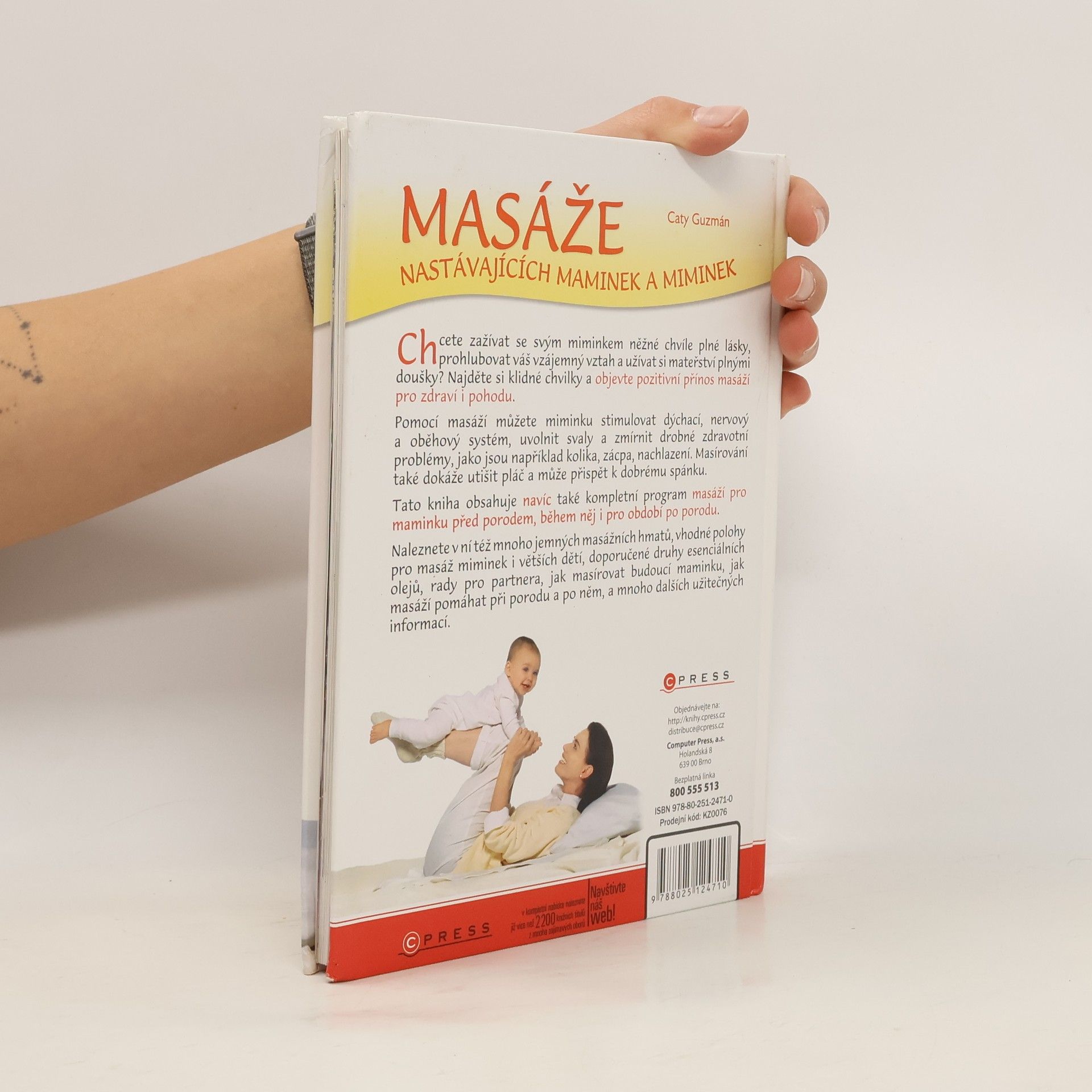 Chcete zažívat se svým miminkem něžné chvíle plné lásky, prohlubovat váš vzájemný vztah a užívat si mateřství plnými doušky? Najděte si klidné chvilky a objevte pozitivní přínos masáží pro zdraví i pohodu. Pomocí masáží můžete miminku stimulovat dýchací, nervový a oběhový systém, uvolnit svaly a zmírnit drobné zdravotní problémy, jako jsou například kolika, zácpa, nachlazení. Masírování také dokáže utišit pláč a může přispět k dobrému spánku. Tato kniha obsahuje navíc také kompletní program masáží pro maminku před porodem, během něj i pro období po porodu. Naleznete v ní též mnoho jemných masážních hmatů, vhodné polohy pro masáž miminek i větších dětí, doporučené druhy esenciálních olejů, rady pro partnera, jak masírovat budoucí maminku, jak masáží pomáhat při porodu a po něm, a mnoho dalších užitečných informací.