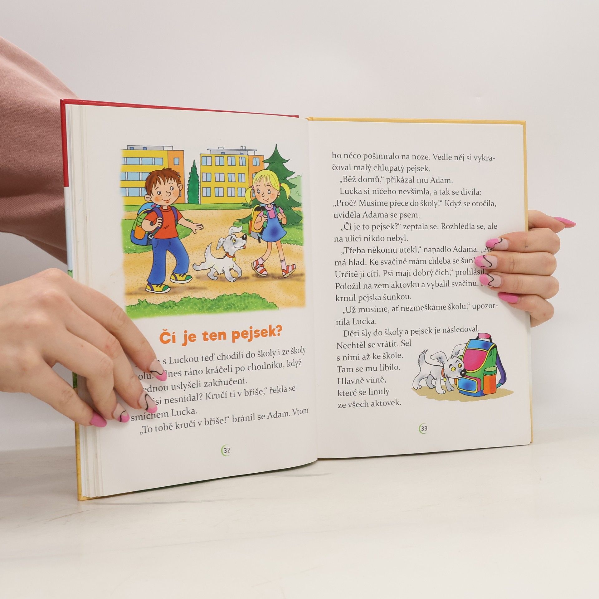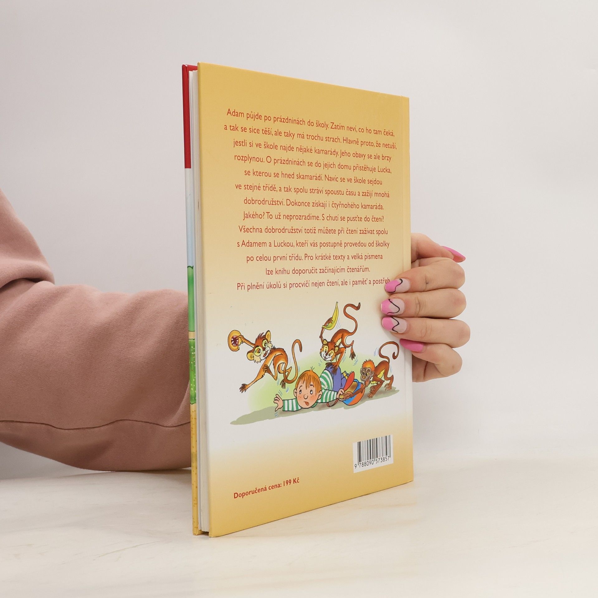 Adam půjde po prázdninách do školy. Zatím neví, co ho tam čeká, a tak se sice těší, ale taky má trochu strach. Hlavně proto, že netuší, jestli si ve škole najde nějaké kamarády. Jeho obavy se ale brzy rozplynou. O prázdninách se do jejich domu přistěhuje Lucka, se kterou se hned skamarádí. Navíc se ve škole sejdou ve stejné třídě, a tak spolu stráví spoustu času a zažijí mnohá dobrodružství. Dokonce získají i čtyřnohého kamaráda. Jakého? To už neprozradíme. S chutí se pusťte do čtení! Všechna dobrodružství totiž můžete při čtení zažívat spolu s Adamem a Luckou, kteří vás postupně provedou od školky po celou první třídu. Pro krátké texty a velká písmena lze knihu doporučit začínajícím čtenářům. Při plnění úkolů si procvičí nejen čtení, ale i paměť a postřeh