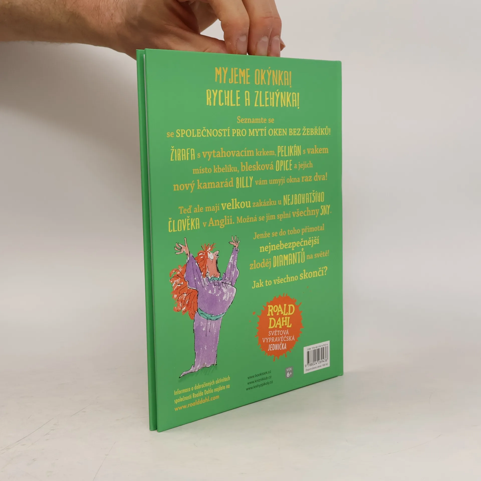 Billy sní o tom, že promění kouzelný starý dům v překrásný obchod s cukrovinkami. Bude až po strop naplněný pralinkami, karamelkami, lentilkami, žvýkačkami, lízátkama a spoustou dalších skvělých dobrot. Ale jak, když se mu do něj nastěhovali žirafa, pelikán a opice a zřídili si v něm BČO? Bezžebříkové čistění oken! „Všechno dáme do parády, žirafa, pelikán a já“, volají na Billyho svůj slogan. Brzy se s nimi skamarádí, a když společně narazí na nejbohatšího muže Anglie, vévodu z Hampshiru, Billyho smělý a úžasný sen se možná i splní. Kniha je určena pro děti od 6 let.