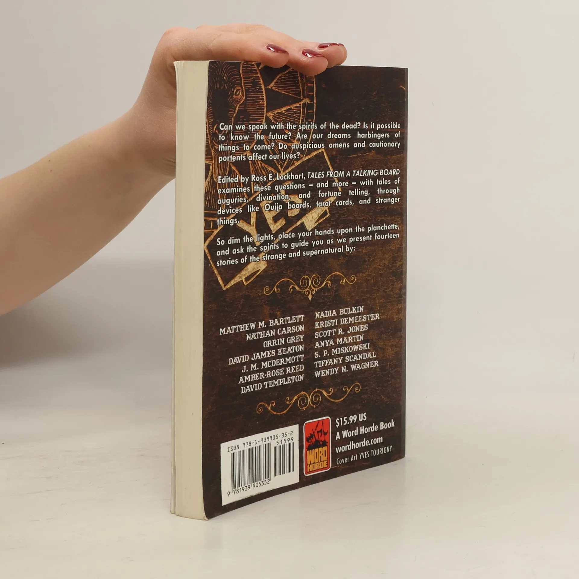 Can we speak with the spirits of the dead? Is it possible to know the future? Are our dreams harbingers of things to come? Do auspicious omens and cautionary portents effect our lives? Edited by Ross E. Lockhart, Tales from a Talking Board examines these questions--and more--with tales of auguries, divination, and fortune telling, through devices like Ouija boards, tarot cards, and stranger things. So dim the lights, place your hands upon the planchette, and ask the spirits to guide you as we present fourteen stories of the strange and supernatural by Matthew M. Bartlett, Nadia Bulkin, Nathan Carson, Kristi DeMeester, Orrin Grey, Scott R. Jones, David James Keaton, Anya Martin, J. M. McDermott, S.P. Miskowski, Amber-Rose Reed, Tiffany Scandal, David Templeton, and Wendy N. Wagner.