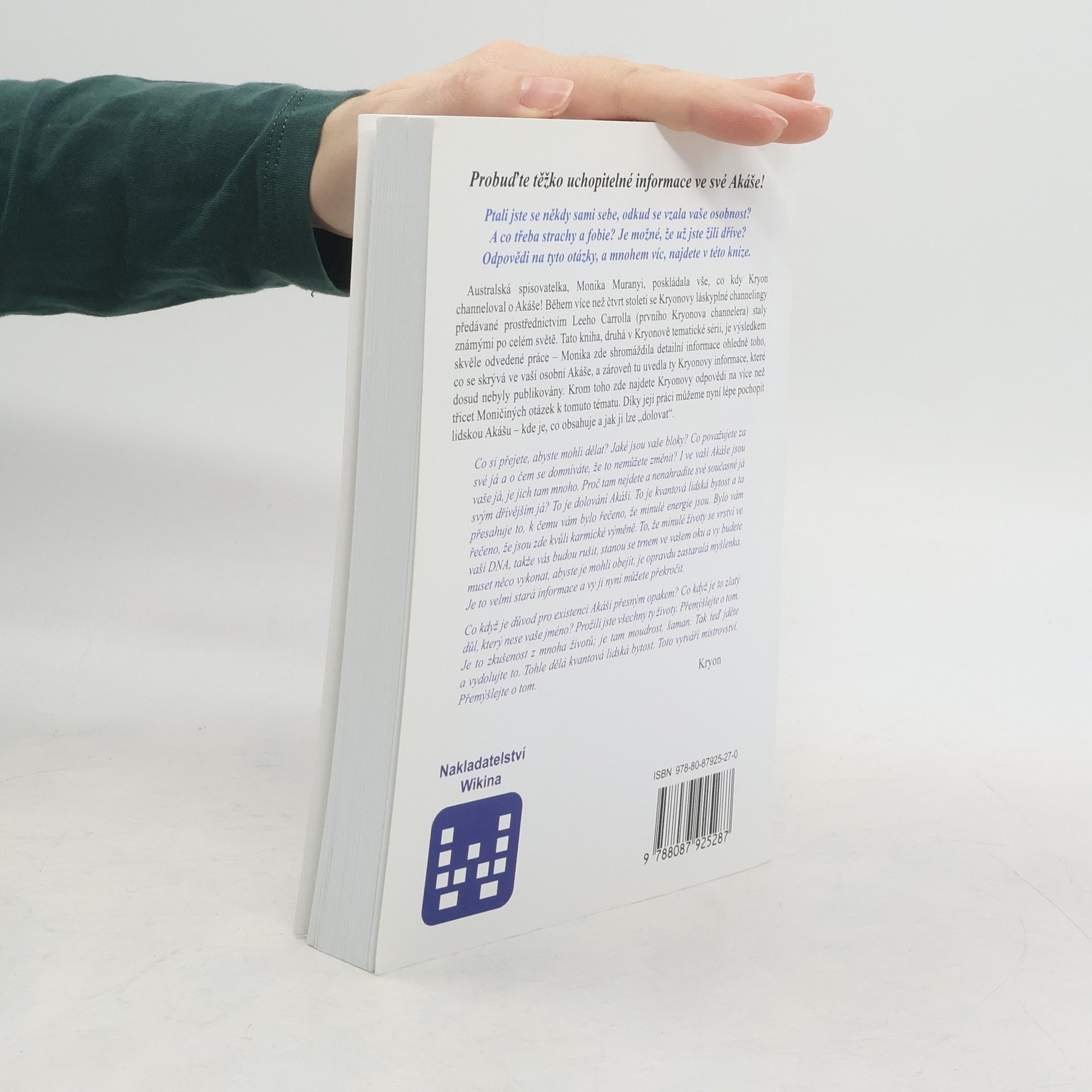 Ptali jste se někdy sami sebe, odkud se vzala vaše osobnost? A co třeba strachy a fobie? Je možné, že už jste žili dříve? Odpovědi na tyto otázky, a mnohem víc, naleznete v této knize. Australská spisovatelka, Monika Muranyi, poskládala vše, co kdy Kryon channeloval o Akáše! Během více než čtvrt století se Kryonovy láskyplné channelingy předávané prostřednictvím Leeho Carrolla (prvního Kryonova channelera) staly známými po celém světě. Tato kniha, druhá v Kryonově tematické sérii, je výsledkem skvěle odvedené práce Monika zde shromáždila detailní informace ohledně toho, co se skrývá ve vaší osobní Akáše, a zároveň tu uvedla ty Kryonovy informace, které dosud nebyly publikovány. Krom toho zde najdete Kryonovy odpovědi na více než 30 Moničiných otázek k tomuto tématu. Díky její práci můžeme nyní lépe pochopit lidskou Akášu kde je, co obsahuje a jak ji lze dolovat.