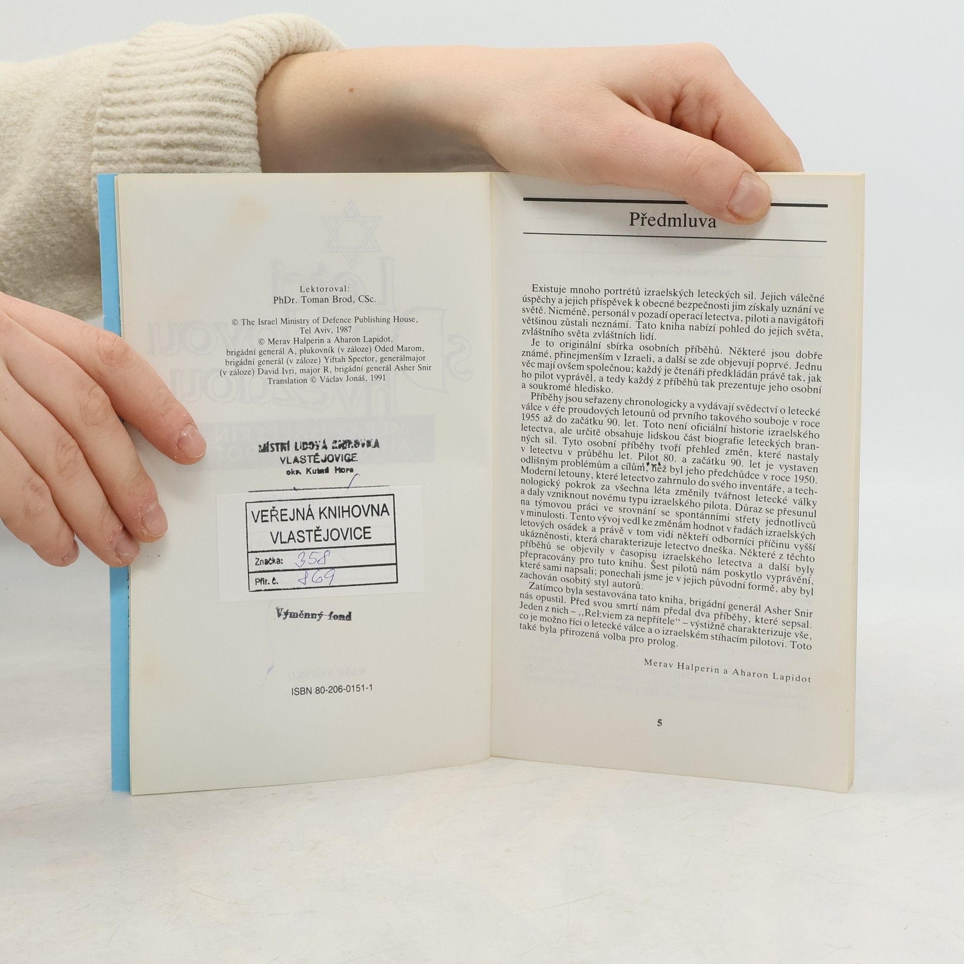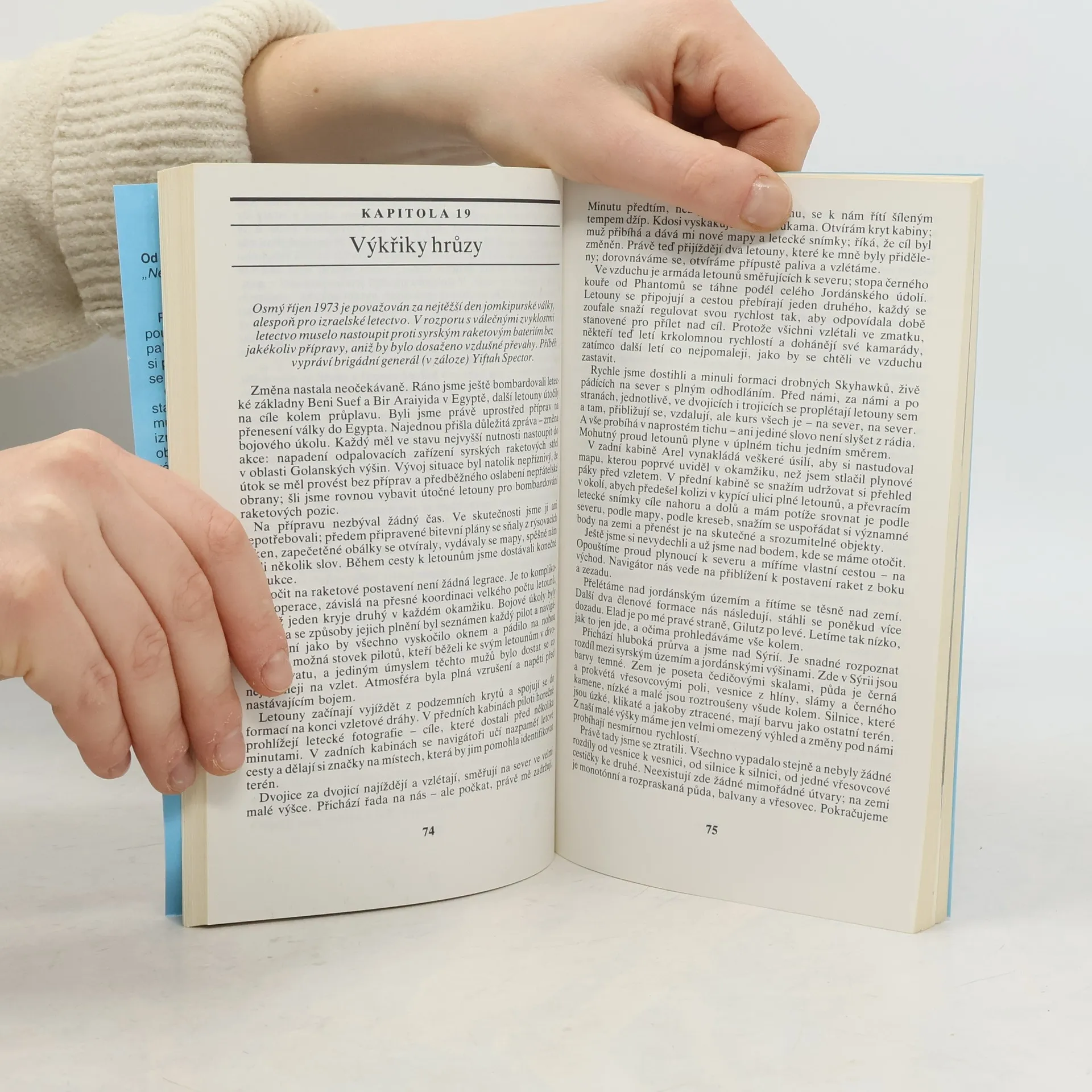 Ve vzduchu je armáda letounů směřujících k severu, stopa černého kouře od Phantomů se táhne podél celého Jordánského údolí. Letouny se připojují a cestou přebírají jeden druhého, každý se zoufale snaží regulovat svou rychlost tak, aby odpovídala době stanovené pro přílet nad cíl. Protože všichni vzlétli ve zmatku, někteří teď letí krkolomnou rychlostí a dohánějí své kamarády, zatím co další letci letí co nejpomaleji, jako by se chtěli ve vzduchu zastavit. Rychle jsme dostihli a minuli formaci drobných Skyhawků, živě pádících na sever s plným odhodláním... Autentické vzpomínky izraelských letců Merava Halperina a Aharona Lapidota na válečné konflikty v 50. – 70. letech dvacátého století mezi židovským státem Izraelem a arabskými státy Egyptem, Jordánskem a Sýrií. Kniha je doplněna bohatou obrazovou přílohou izraelského letectva.