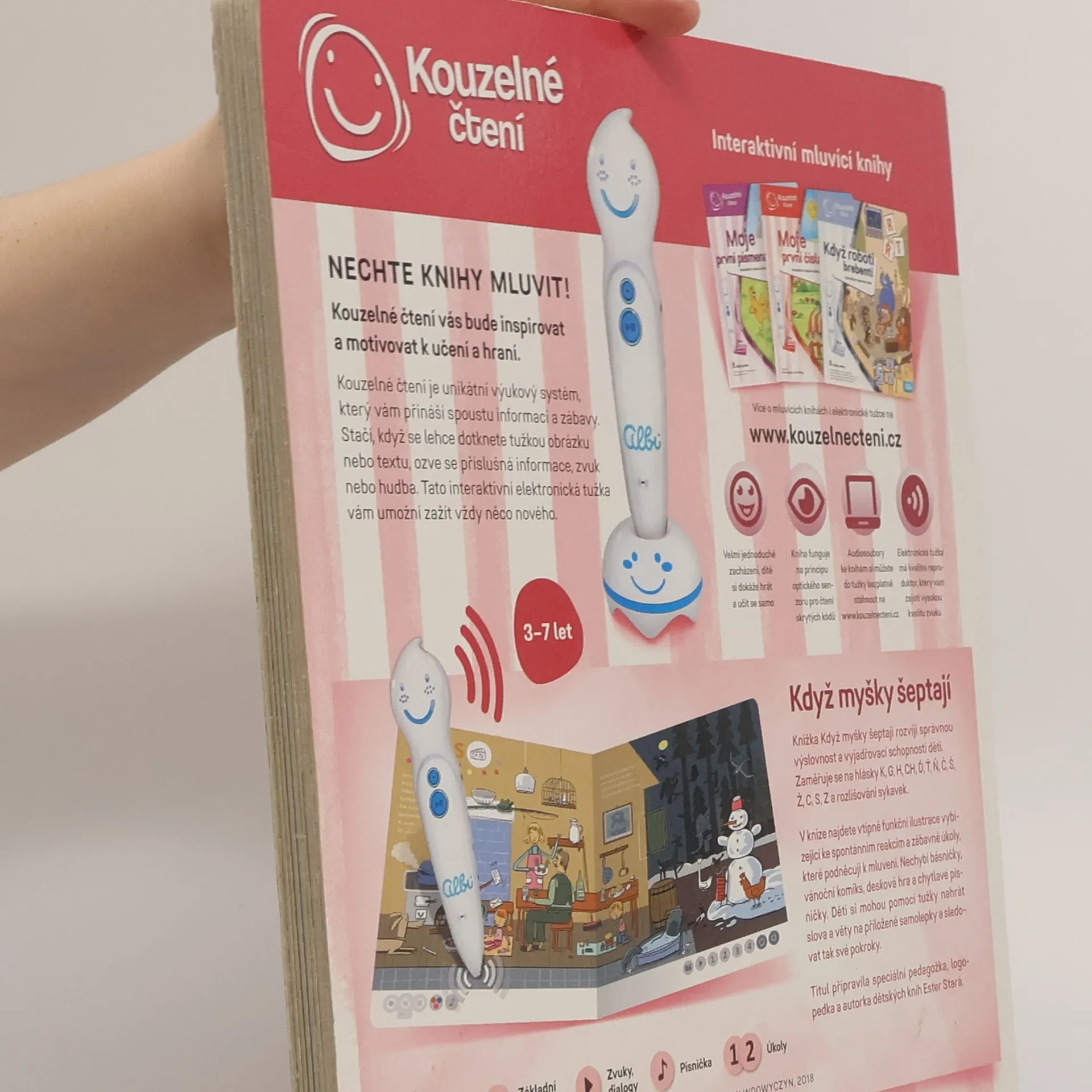 Tato mluvící knížka je zde od toho, aby dětem pomohla rozvázat jejich někdy neposlušné jazyky. Najdete v ní nejen myšky, ale i kouzelníka a plno dalších roztomilých ilustrací. K nim stačí přiložit elektronickou tužku od Albi a začne se přehrávat čtený text. Kromě poslouchání je však k dispozici také spousta dalších interaktivních módů, které dětem zábavnou a veselou formou pomáhají naučit se správně vyslovovat hlásky K, G, H, CH, Ď, Ť, Ň, Č, Š, Ž, C, S a Z, ale například i slabiky bě, pě a vě. Celá tato knížka z edice Kouzelné čtení obsahuje více než 1400 zvuků a textů. Elektronická Albi tužka není součástí knihy. Prodává se samostatně.