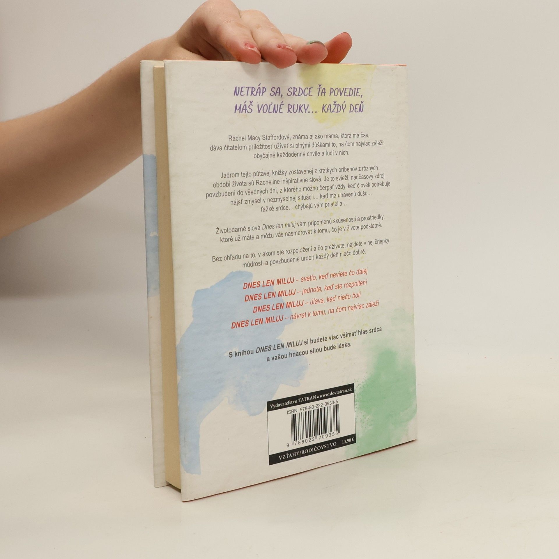 Rachel Macy Staffordová, úspešná blogerka a autorka článkov v mienkotvorných médiách, v knižke Dnes len miluj povzbudzuje čitateľa, aby si život a svojich blízkych užíval plnými dúškami. Pre naplnený život je dôležité prosté každodenné prežívanie a radosť z prítomného dňa, čomu mnohí z nás v návale pracovného stresu neprikladajú až takú dôležitosť. Autorka radí čitateľom, aby sa zamerali na to, na čom im najviac záleží. Dnešná doba vyžaduje od každého jedinca perfekcionizmus, neustále náhlenie a schopnosť robiť takmer desať vecí naraz. Vyberáme si výkonnosť, rozptýlenie a efektivitu na úkor emócií, budovania vzťahov, osobného rastu a starostlivosti. Rachel zdôrazňuje, že netreba plytvať časom a neuvážene brať na svoje plecia požiadavky iných. Treba odmietať vyčerpávajúce spoločenské stretnutia a prestať sa zaoberať nepríjemnými ľuďmi. Pomôže nám to zbaviť sa prílišnej zaneprázdnenosti, večnej únavy, nadmerného stresu a roztržitosti. Dnes len miluj – tieto tri slová majú silu oživiť srdce... váš domov... vzťah... vaše sny... i tento vzácny deň, deň od Boha – deň, čo máte pred sebou. Opakujte si tieto slová, keď vám vnútorná bolesť bráni milovať dnešný deň a seba samých, pretože sebakritizujúca a zahanbujúca taktika vás nijako neposúva vpred. Máte príliš veľkú cenu a hodnotu, aby ste boli na poslednom mieste v zozname vlastných priorít.