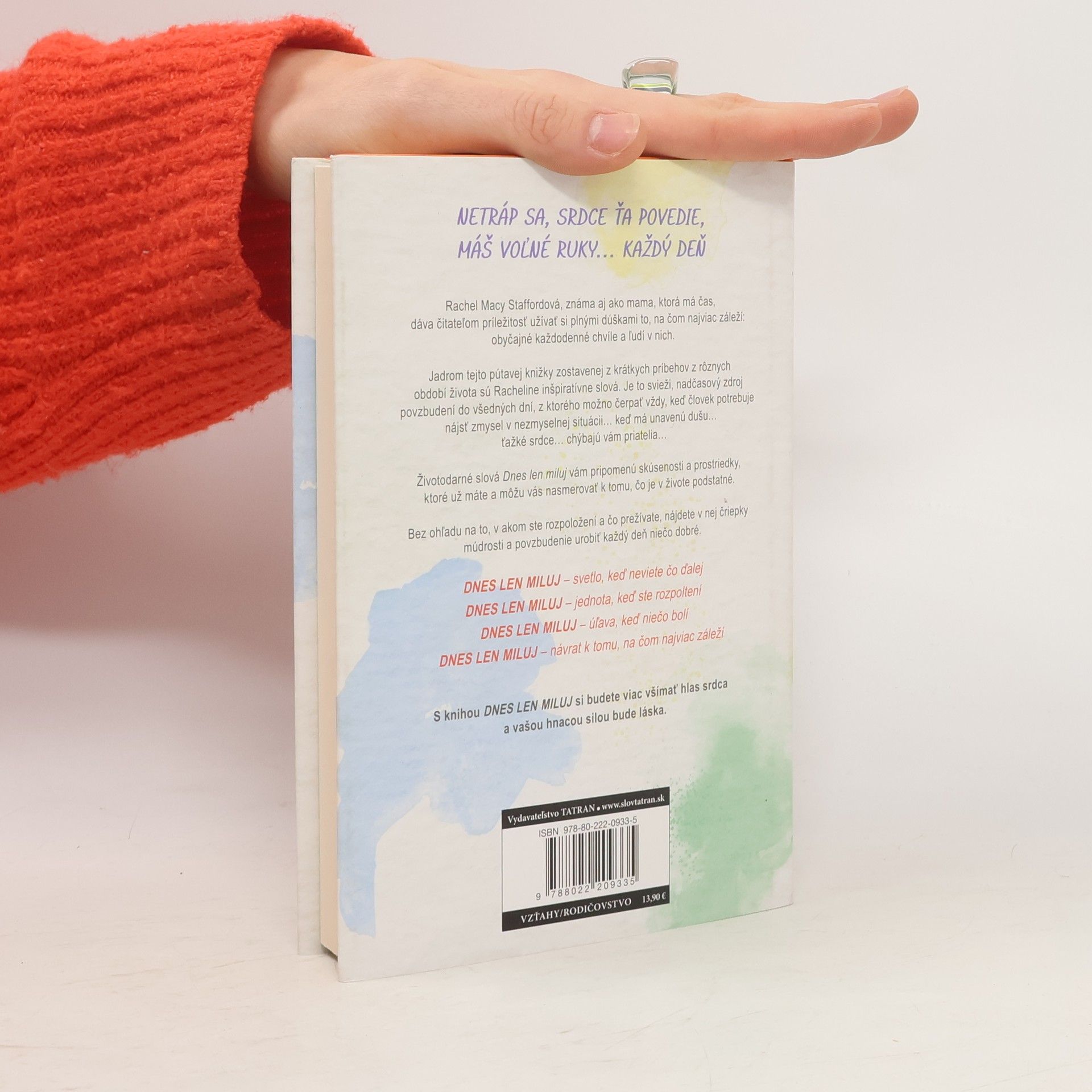 Rachel Macy Staffordová, úspešná blogerka a autorka článkov v mienkotvorných médiách, v knižke Dnes len miluj povzbudzuje čitateľa, aby si život a svojich blízkych užíval plnými dúškami. Pre naplnený život je dôležité prosté každodenné prežívanie a radosť z prítomného dňa, čomu mnohí z nás v návale pracovného stresu neprikladajú až takú dôležitosť. Autorka radí čitateľom, aby sa zamerali na to, na čom im najviac záleží. Dnešná doba vyžaduje od každého jedinca perfekcionizmus, neustále náhlenie a schopnosť robiť takmer desať vecí naraz. Vyberáme si výkonnosť, rozptýlenie a efektivitu na úkor emócií, budovania vzťahov, osobného rastu a starostlivosti. Rachel zdôrazňuje, že netreba plytvať časom a neuvážene brať na svoje plecia požiadavky iných. Treba odmietať vyčerpávajúce spoločenské stretnutia a prestať sa zaoberať nepríjemnými ľuďmi. Pomôže nám to zbaviť sa prílišnej zaneprázdnenosti, večnej únavy, nadmerného stresu a roztržitosti. Dnes len miluj – tieto tri slová majú silu oživiť srdce... váš domov... vzťah... vaše sny... i tento vzácny deň, deň od Boha – deň, čo máte pred sebou. Opakujte si tieto slová, keď vám vnútorná bolesť bráni milovať dnešný deň a seba samých, pretože sebakritizujúca a zahanbujúca taktika vás nijako neposúva vpred. Máte príliš veľkú cenu a hodnotu, aby ste boli na poslednom mieste v zozname vlastných priorít.