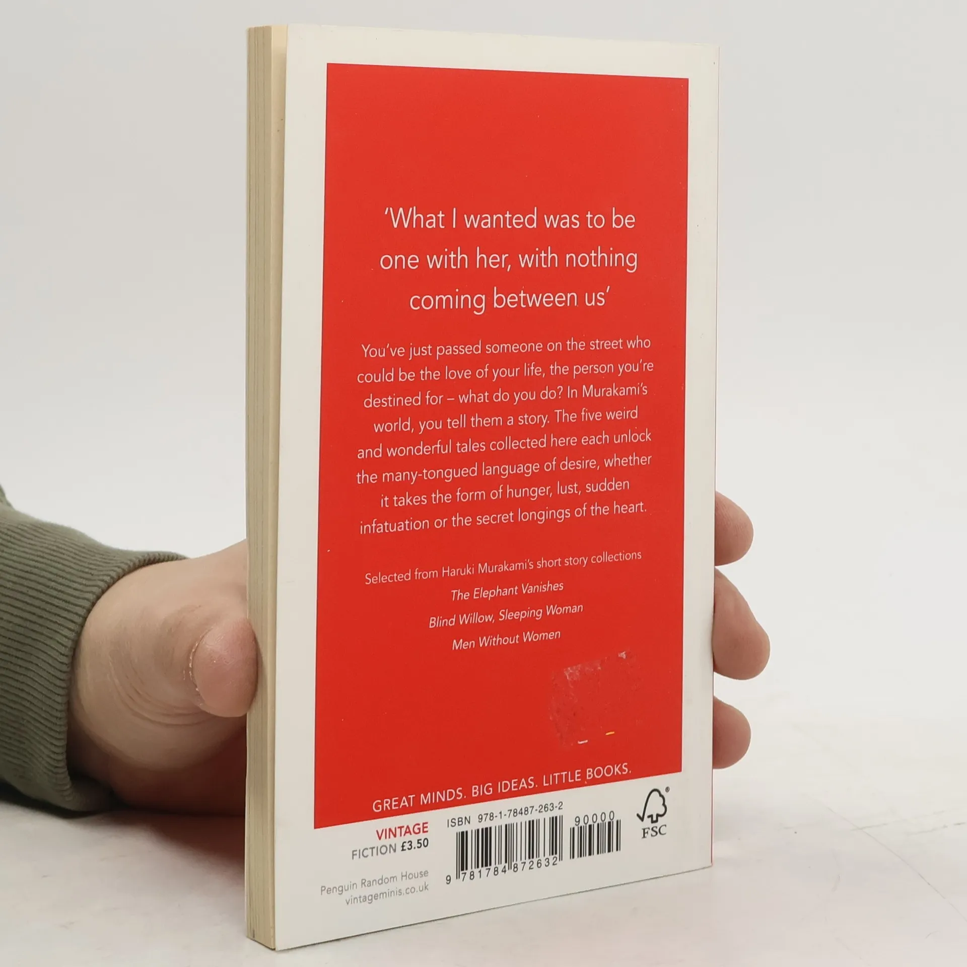 You've just passed someone on the street who could be the love of your life, the person you're destined for - what do you do? In Murakami's world, you tell them a story. The five weird and wonderful tales collected here each unlock the many-tongued language of desire, whether it takes the form of hunger, lust, sudden infatuation or the secret longings of the heart. Selected from Haruki's Murakami's short story collections The Elephant Vanishes, Blind Willow Sleeping Woman, Men Without Women VINTAGE MINIS- GREAT MINDS. BIG IDEAS. LITTLE BOOKS. A series of short books by the world's greatest writers on the experiences that make us human Also in the Vintage Minis series- Love by Jeanette Winterson Psychedelics by Aldous Huxley Eating by Nigella Lawson Summer by Laurie Lee