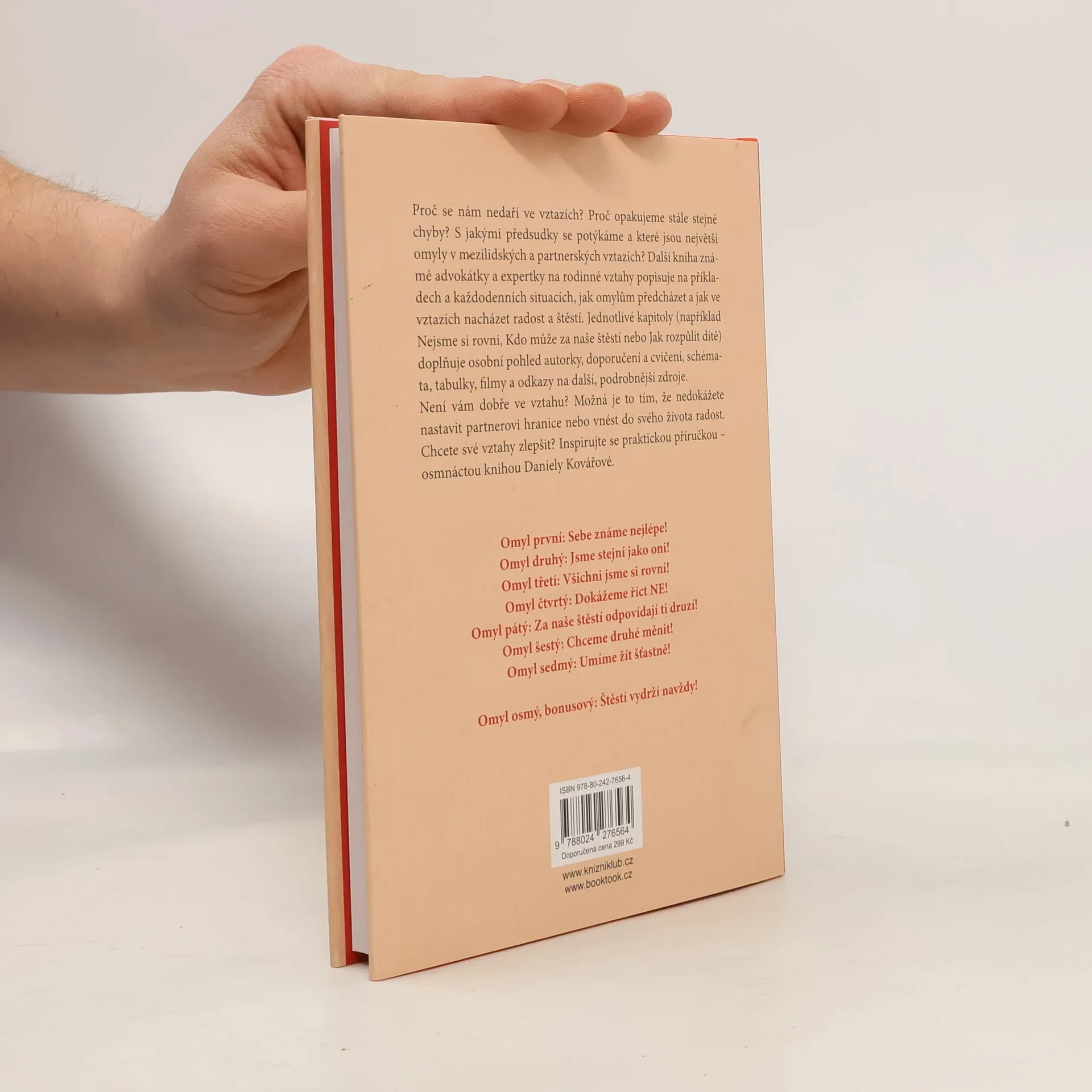 Proč se nám nedaří ve vztazích? Proč opakujeme stále stejné chyby? S jakými předsudky se potýkáme a které jsou největší omyly v mezilidských a partnerských vztazích? Další kniha známé advokátky a expertky na rodinné vztahy popisuje na příkladech a každodenních situacích, jak omylům předcházet a jak ve svých vztazích nacházet radost a štěstí. Jednotlivé kapitoly (například Nejsme si rovni, Kdo může za naše štěstí nebo Jak rozpůlit dítě) doplňuje osobní pohled autorky, doporučení a cvičení, schémata, tabulky, filmy a odkazy na další, podrobnější zdroje. Není vám dobře ve vztahu? Možná je to tím, že nedokážete nastavit partnerovi hranice nebo vnést do svého života radost. Chcete své vztahy zlepšit? Inspirujte se praktickou příručkou – osmnáctou knihou Daniely Kovářové.