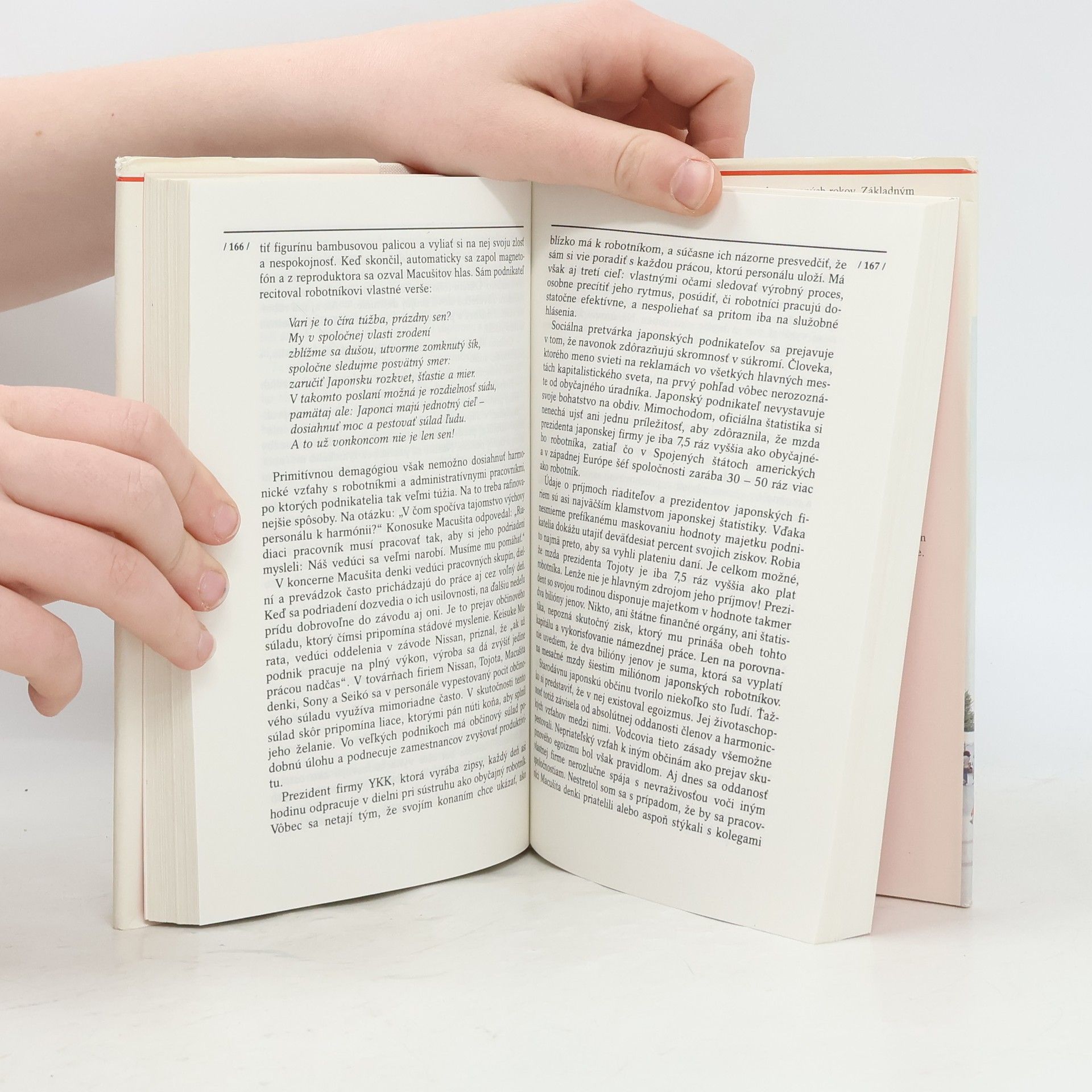Opierajúc sa o vlastné zážitky a znalosť všeobecnej histórie, autor odhaľuje základy japonskej expanzie na svetový trh, analyzuje špecifiká hospodárskeho mechanizmu a snaží sa pochopiť japonský pragmatizmus. Na početných príkladoch ilustruje japonský systém riadenia, charakteristický koexistenciou prežitkov feudalizmu a moderným buržoáznym managementom.
