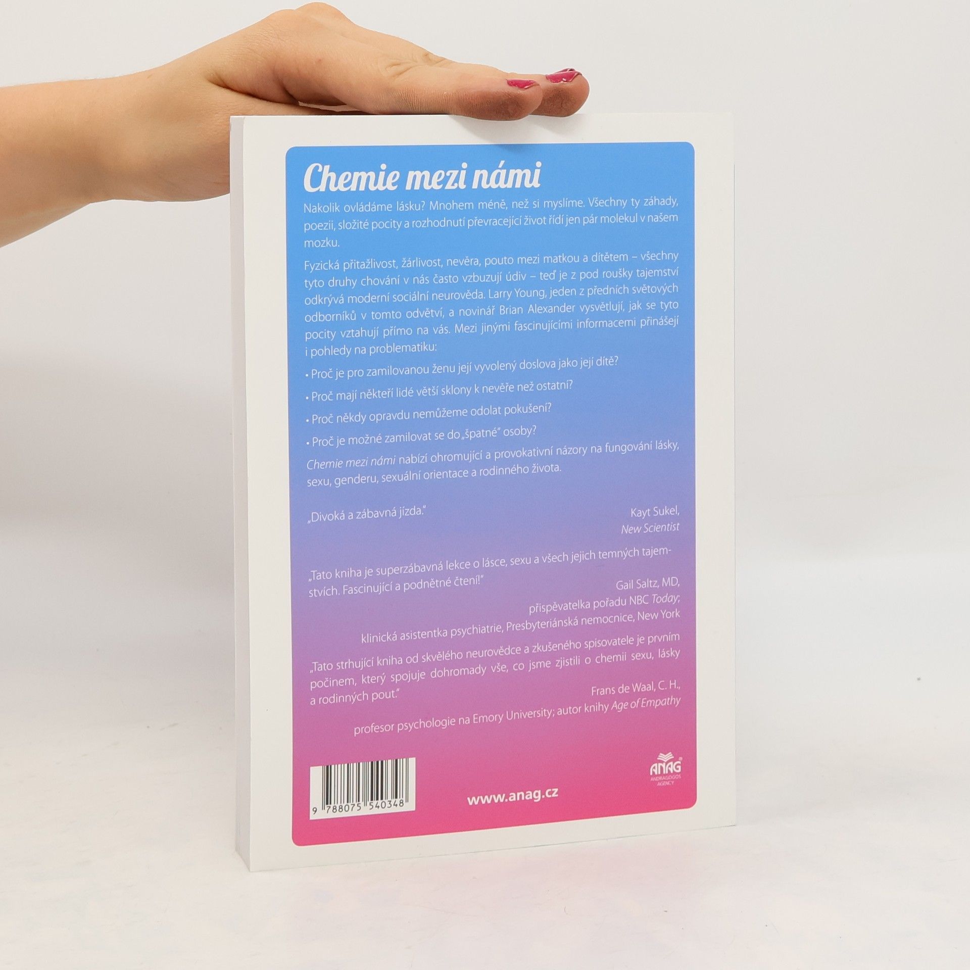 Jak začíná láska? Jak mohou dva cizí lidé dospět k závěru, že by nebylo pouze příjemné podělit se o své životy, ale že je musí sdílet? Jak může muž říct, že miluje svou ženu, a přesto ji podvádět? Proč někteří lidé zůstávají ve vztazích i po vypršení lásky (romantiky)? Jak je možné zamilovat se do „špatné“ osoby? Jak lidé přijdou na to, že je někdo jejich „typ“? Velká teorie lásky Na základě skutečných příběhů a výzkumů z laboratoří po celém světě je kniha Chemie mezi námi odvážným pokusem o vytvoření „velké sjednocené teorie“ lásky. K některým z ohromujících postřehů patří: • Láska nás může ovládat, protože to je, doslova, závislost. • Pro zamilovanou ženu je muž jako její dítě. • Proč je špatné říci, že společnost utváří pohlaví, a jak je možné mít tělo jednoho pohlaví a mozek jiného. • Proč je u některých lidí pravděpodobnější, že budou podvádět, než u ostatních. • Proč někdy opravdu nemůžeme odolat pokušení. Láska v různých podobách Autoři zasazují svá odhalení do historických, politických a sociálních kontextů. Průběžně se pozastavují u všeho – od gay manželství až po otázku, proč matka-samoživitelka nemusí být dobrá pro společnost. Chemie mezi námi nabízí mocná nahlédnutí na lásku, sex, pohlaví, sexuální orientace a rodinný život, která se ukážou být poučnými, kontroverzními a podnětnými.