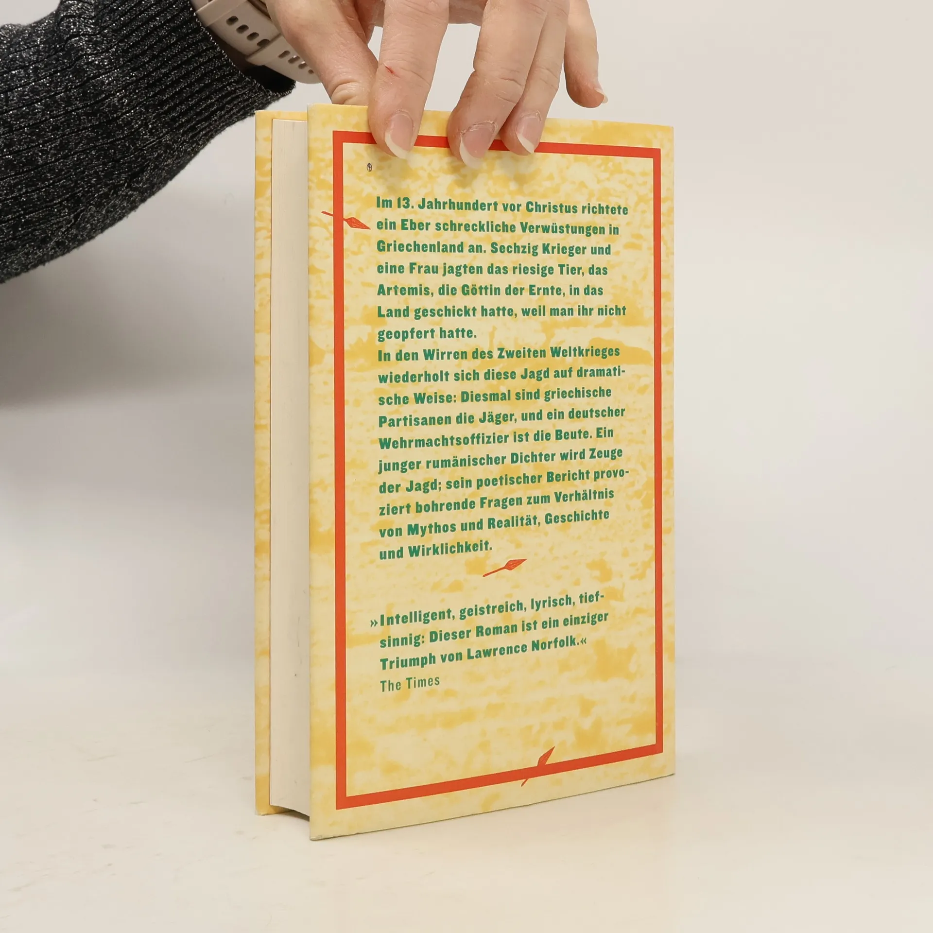 Seit seinem Welterfolg "Lemprière's Wörterbuch„ gilt der britische Autor Lawrence Norfolk als “Meister mystisch-vertrackter Historien" (Der Spiegel). In seinem neuen Roman greift er den Mythos von der kalydonischen Eberjagd auf. Im 13. Jahrhundert vor Christus richtete ein Eber schreckliche Verwüstungen an. Sechzig Krieger und eine Frau jagten das riesige Tier, das Artemis, die Göttin der Ernte, in das Land schickte, weil man ihr nicht gehuldigt hatte. In den Wirren des Zweiten Weltkriegs wiederholt sich diese Jagd auf dramatische Weise: Diesmal sind griechische Partisanen die Jäger, und eine deutscher Wehrmachtsoffizier ist die Beute. Ein junger rumänischer Dichter wird Zeuge dieser Jagd. In einem Versepos verarbeitet er später die Ereignisse und wird zum gefeierten Autor. Doch auch er muss sich den Fragen nach Mythos und Realität, Geschichte und Wirklichkeit stellen