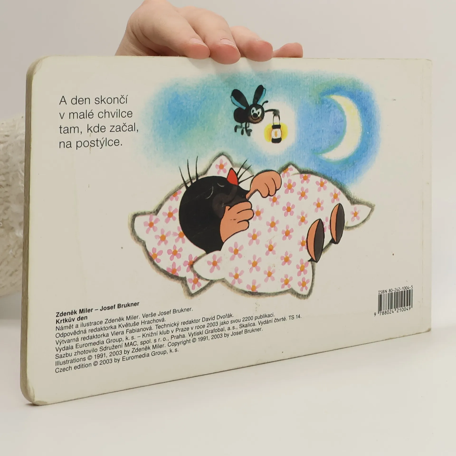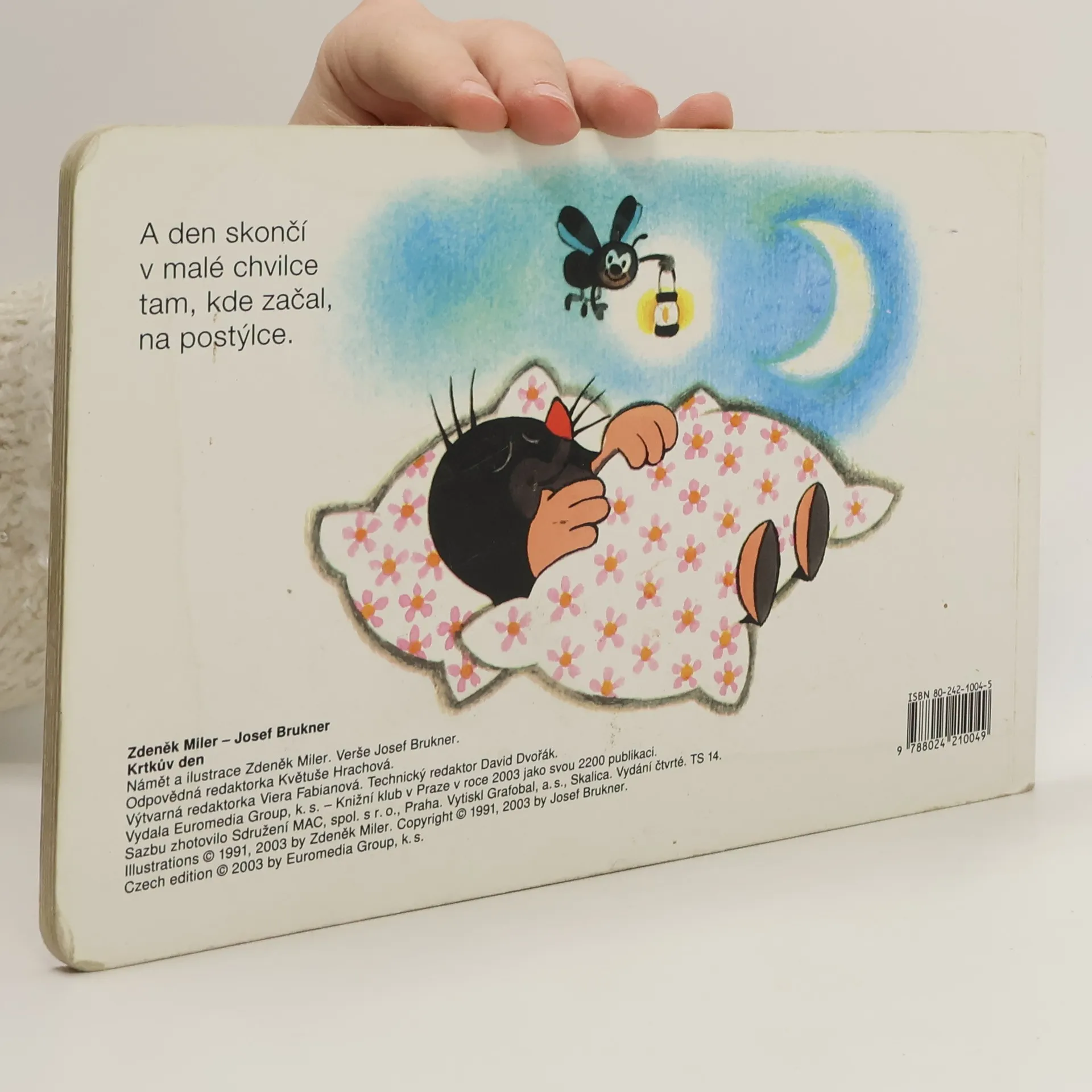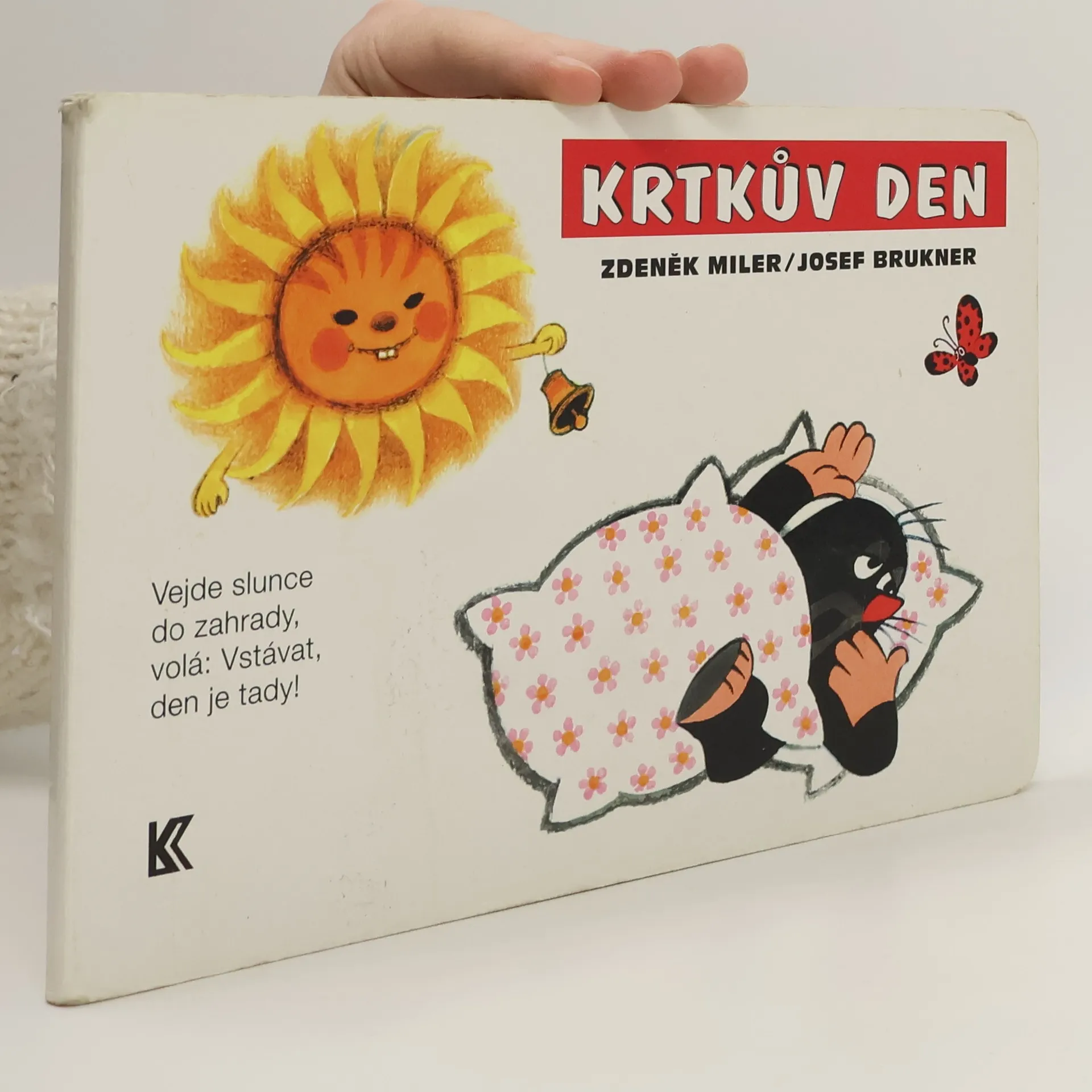 Krtka probudilo sluníčko. Bude pěkný den, a tak ho stráví na zahradě. Posnídá mrkvičku a do práce. Čekají na něj sladké jahůdky. Po dobrém obědě si odpočine, vykoupe se v rybníčku a večer znovu do postýlky. Klasické dvanáctistránkové leporelo pro nejmenší. Ilustrace Zdeňka Milera provázejí půvabné verše Josefa Bruknera.