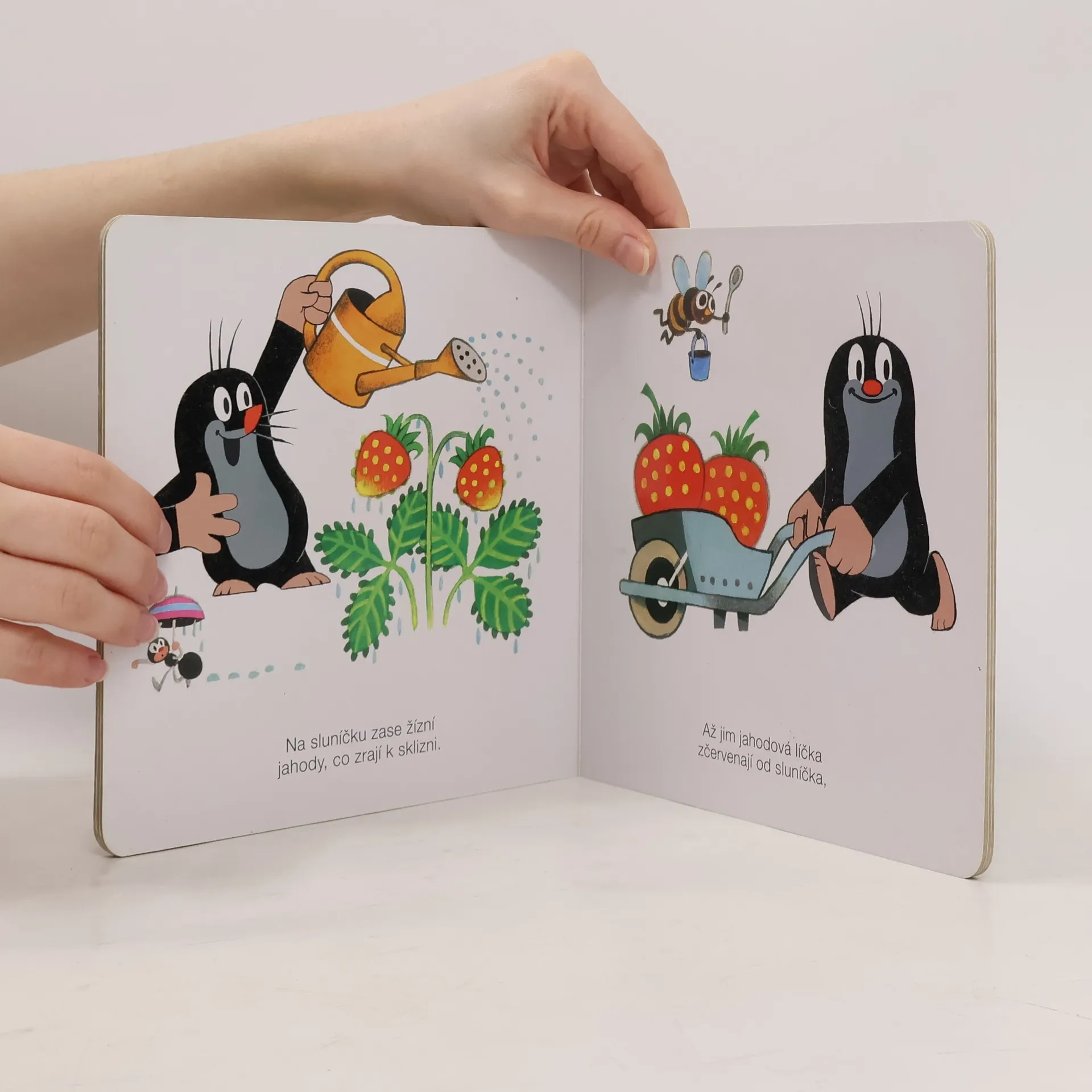 Krtka probudilo sluníčko. Bude pěkný den, a tak ho stráví na zahradě. Posnídá mrkvičku a do práce. Čekají na něj sladké jahůdky. Po dobrém obědě si odpočine, vykoupe se v rybníčku a večer znovu do postýlky. Klasické dvanáctistránkové leporelo pro nejmenší. Ilustrace Zdeňka Milera provázejí půvabné verše Josefa Bruknera.