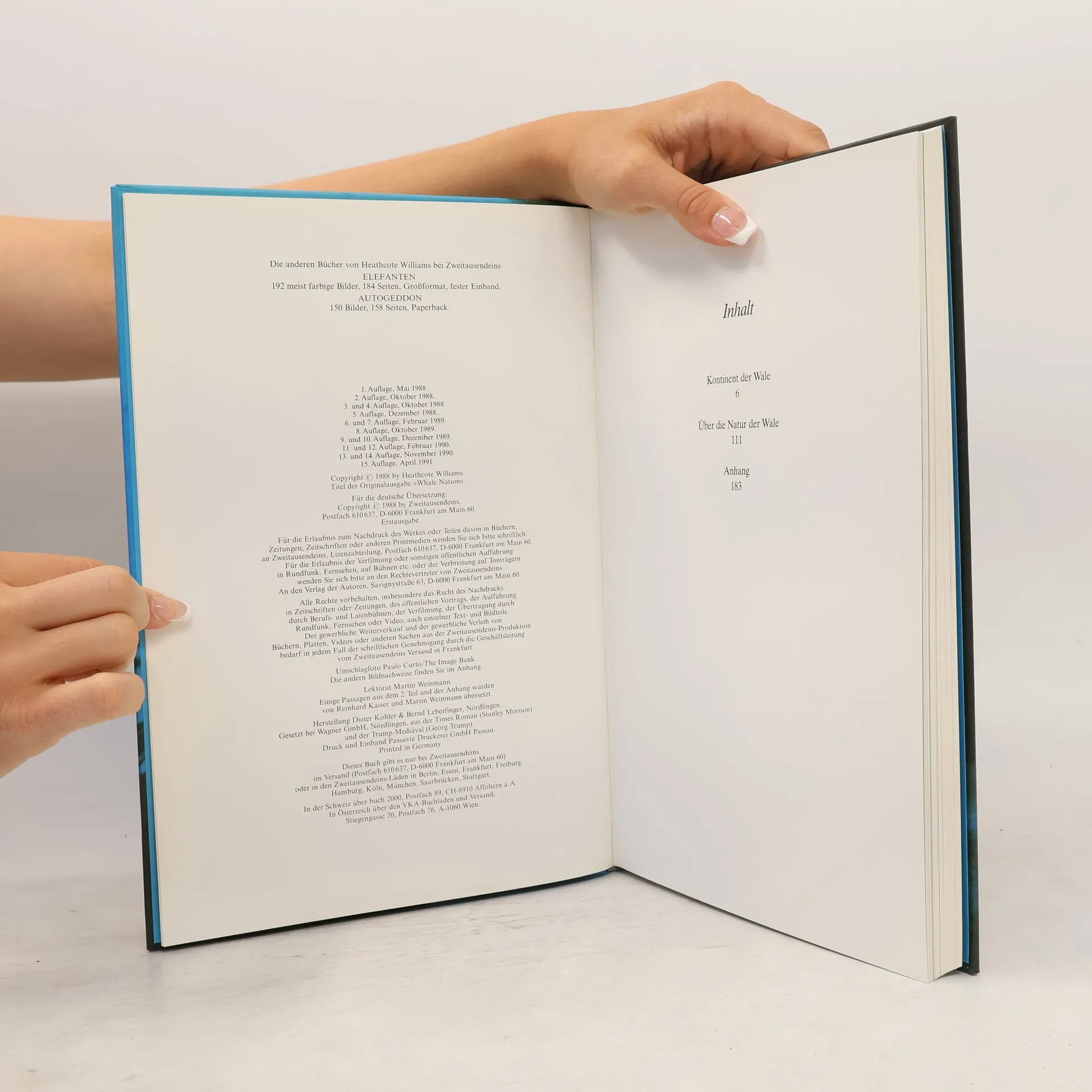 Ein Buch, das Ihre Seele berührt: Der Bildband von Heathcote Williams erscheint in 16 Ländern und wurde bereits verfilmt. Es ist ein Welterfolg, der nicht unberührt lässt. Petra Kelly beschreibt es als eine Aufforderung, nicht nur für das Überleben der sanften Riesen der Meere einzutreten, sondern auch von ihnen zu lernen. Andy Pohl hebt hervor, dass das Buch zu Tränen rührt und für den Menschen von unschätzbarem Wert ist. Die Zeit bezeichnet es als „unendlich schön und unendlich traurig“. Die Frankfurter Rundschau beschreibt es als eine Liebeserklärung an das größte lebende Tier, das uns in vielerlei Hinsicht überlegen ist. Williams’ Werk ist ein großes Gedicht, das von einer Fülle faszinierender Wal-Fotos begleitet wird. Das Buch thematisiert, wie Wale über Hunderte von Meilen kommunizieren, ihre Gesänge und Spiele, ihre Heilungskräfte und ihr Familienleben. Williams schildert eindrucksvoll, wie Wale ihre Nahrung spielerisch fangen, und reflektiert über die Beziehung zwischen Walen und Menschen. Er erinnert daran, dass Wale nur einen Menschen verschlungen haben: Jonas, den Propheten, und ihn schnell wieder ausgespien haben. Für alle, die Poesie und Wale lieben, ist dieses Buch ein Muss. Selbst jene, die Wale gleichgültig sind, sollten es lesen. Wer nach der Lektüre nicht für den Schutz der Wale eintritt, ist ein armer Mensch. Neben den eindrucksvollen Fotos enthält es auch Texte aus Wissenschaft und Literatur mit erstaunli