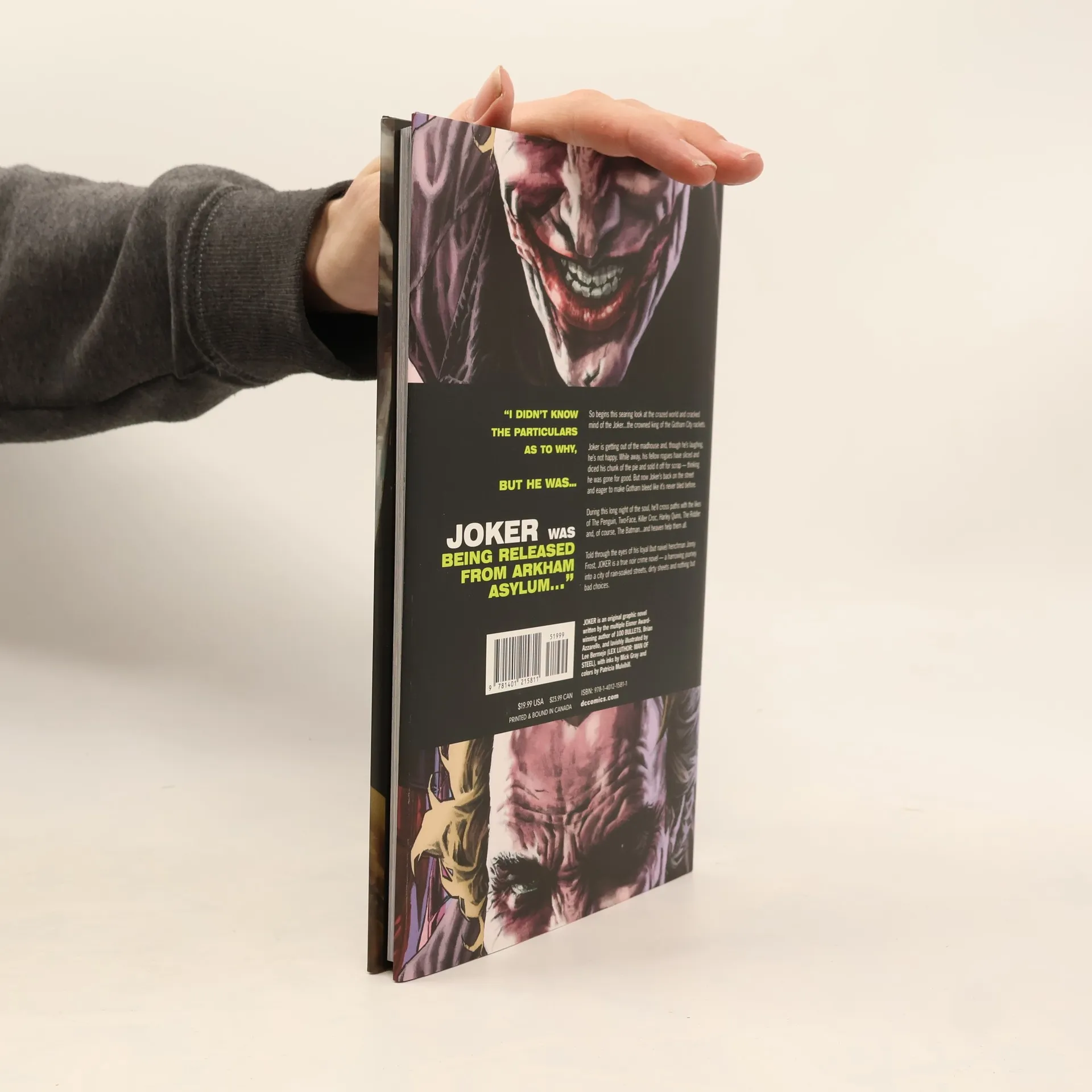 An original hardcover graphic novel that tells the story of one very dark night in Gotham City--from the creative team behind the graphic novel LEX MAN OF STEEL.The Joker has been mysteriously released from Arkham Asylum, and he's none to happy about what's happened to his Gotham City rackets while he's been "away." What follows is a harrowing night of revenge, murder and manic crime as only The Joker can deliver it, as he brutally takes back his stolen assets from The Penguin, The Riddler, Two-Face, Killer Croc and others.Brian Azzarello brings to THE JOKER all the visceral intensity and criminal insight that has made his Vertigo graphic novel series 100 BULLETS one of the most critically-acclaimed and award-winning series in all of comics.