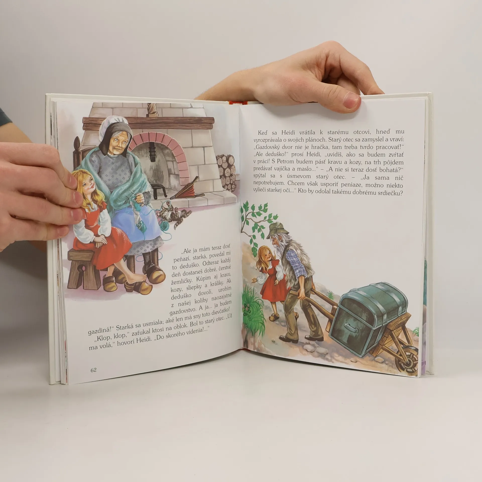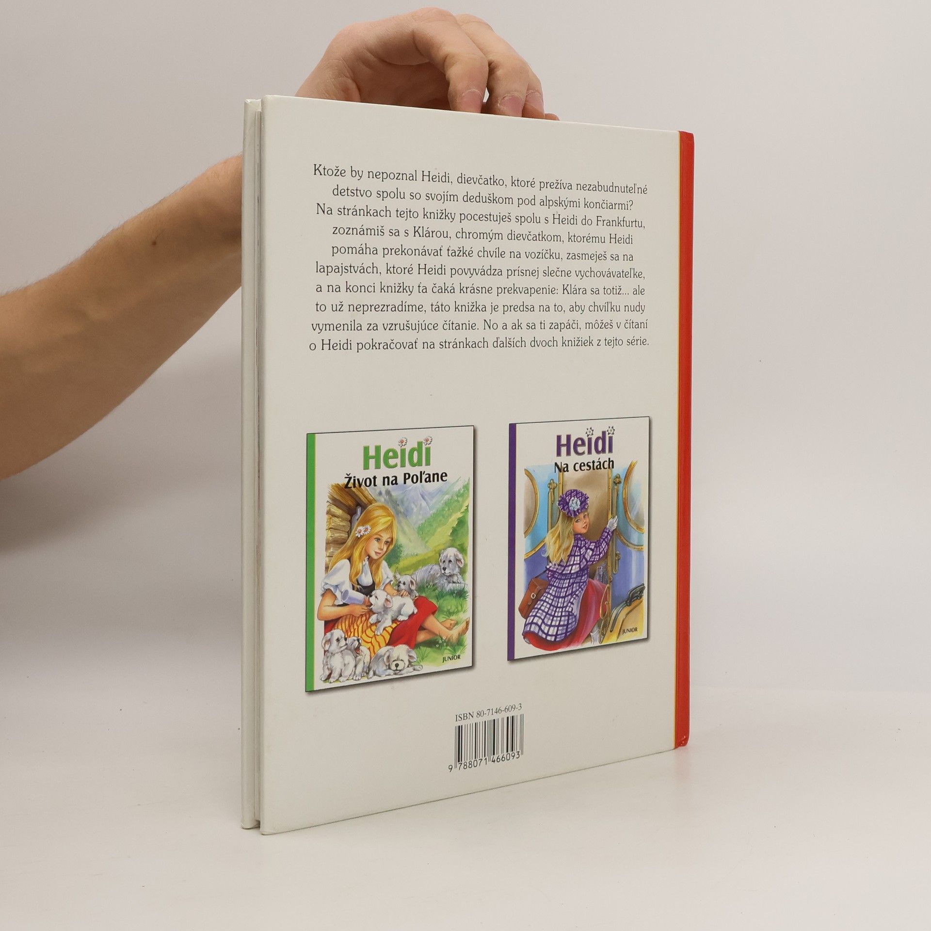 Ktože by nepoznal Heidi, dievčatko, ktoré prežíva nezabudnuteľné detstvo spolu so svojím deduškom pod alpskými končiarmi?Na stránkach tejto knižky pocestuješ spolu s Heidi do Frakfurtu, zoznámiš sa s Klárou, chromým dievčatkom, ktorému Heidi pomáha prekonávať ťažké chvíle na vozíčku, zasmeješ sa na lapajstvách, ktoré Heidi povyvádza prísnej slečne vychovávateľke, a na konci knižky ťa čaká krásne Klára sa totiž... ale to už neprezradíme, táto knižka je predsa na to, aby chvíľku nudy vymenila za vzrušujúce čítanie. A ak sa ti zapáči, môžeš v čítaní pokračovať na stránkach ďalších dvoch knižiek z tejto série.