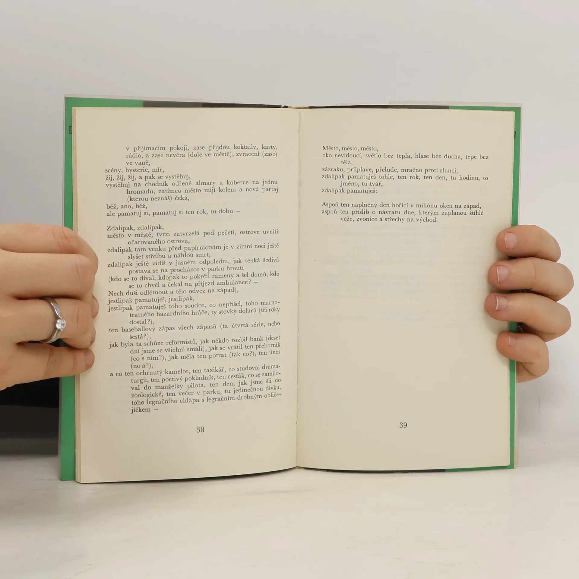 TEĎ Teď, když známe život: ráno snídani, potom kancelář, pak divadlo a potom spát, žádnou paměť, jen toužení a zisk jsou skutečné – teď, když svým způsobem život známe, není války, není smrti, není pochybnosti, není hrůzy, nedopouštíme se chyb, v zemi je prales kostí,ale nad ním je teď mír, zmizela zběsilost, zmizely cíle, na malou chvíli zmizela i muka, máme své myšlenky, život svým způsobem známe, svět je zelený a tichý – jako bubliny stoupají z vody na močále, bublina plynu stoupá a praská v rákosí, rákos je zelený a žáby kvákají, voda je teplá tam, kde stoupá bublina, rákos je tichý, rákos je zelený, voda teplá, nebe modré.