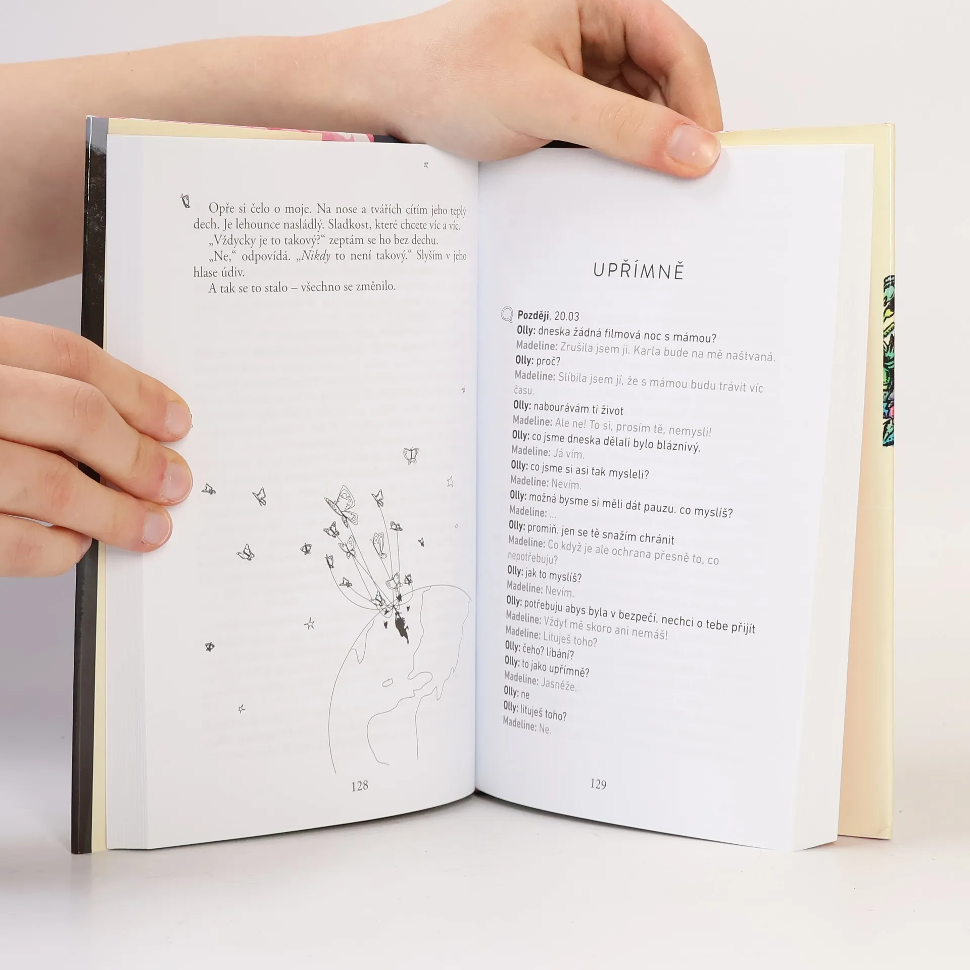 Tato originální prvotina vypráví o dívce, která je doslova a do písmene alergická na celý svět. Je zavřená doma, nikam nesmí a skoro nikdo nesmí k ní. Když se ale do sousedního domu přistěhuje nová rodina a s ní i kluk jménem Olly, začíná se odvíjet komplikovaná „lovestory“, která obrátí naruby všechno, úplně všechno, co osmnáctiletá Madeline dosud znala. Neotřelý milostný příběh je zajímavý i svým zpracováním – obsahuje Madelininy deníkové záznamy, poznámky, tabulky, seznamy či ilustrace. Ahoj. Jmenuji se Madeline Whittierová a jsem nemocná. Moje nemoc je vzácná a málo známá. Jsem totiž alergická na celý svět. Vůbec nevycházím z domu, nebyla jsem venku celých sedmnáct let. Jediní lidé, které vídám, jsou moje máma a ošetřovatelka Carla. Ale pak se jednoho dne u vedlejšího domu objevilo stěhovací auto. Vykoukla jsem z okna a uviděla ho. Byl vysoký, štíhlý a celý v černém – černé triko, černé džíny, černé tenisky a černá pletená čepice, která mu zakrývala vlasy. Zachytil můj pohled a upřeně se na mě zadíval. Já jeho upřený pohled opětovala. Jmenuje se Olly. Možná že nemůžeme předvídat budoucnost, ale některé věci přesto předpovědět můžeme. Například to, že se do Ollyho zamiluju, je jisté. A téměř jisté taky je, že to bude katastrofa. Příběh o bezmezné radosti i nekonečném smutku, které zažíváme, když prorazíme stěny své ulity a kvůli lásce uděláme něco úplně bláznivého (a smrtelně nebezpečného). (Dotisk 2017 s novou obálkou)