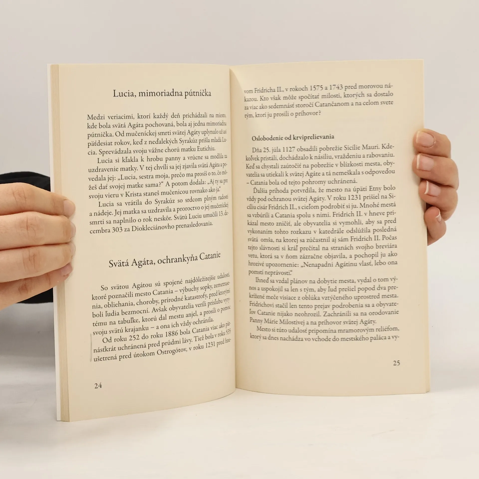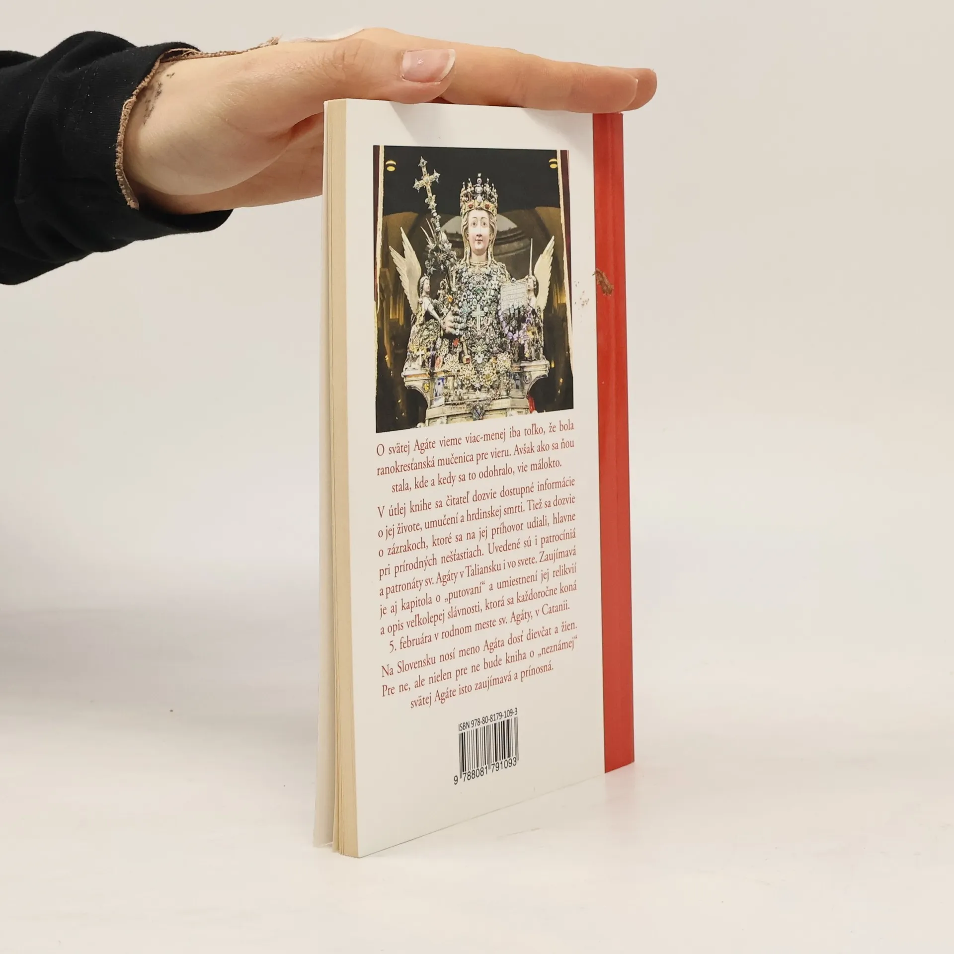 O svätej Agáte vieme viac-menej iba toľko, že bola ranokresťanská mučenica pre vieru. Avšak ako sa ňou stala, kde a kedy sa to odohralo, vie málokto. V útlej knihe sa čitateľ dozvie dostupné informácie o jej živote, umučení a hrdinskej smrti. Tiež sa dozvie o zázrakoch, ktoré sa na jej príhovor udiali, hlavne pri prírodných nešťastiach. Uvedené sú i patrocíniá a patronáty sv. Agáty v Taliansku i vo svete. Zaujímavá je aj kapitola o putovaní a umiestnení jej relikvií a opis veľkolepej slávnosti, ktorá sa každoročne koná 5. februára v rodnom meste sv. Agáty, v Catanii. Na Slovensku nosí meno Agáta dosť dievčat a žien. Pre ne, ale nielen pre ne bude kniha o neznámej svätej Agáte isto zaujímavá a prínosná.