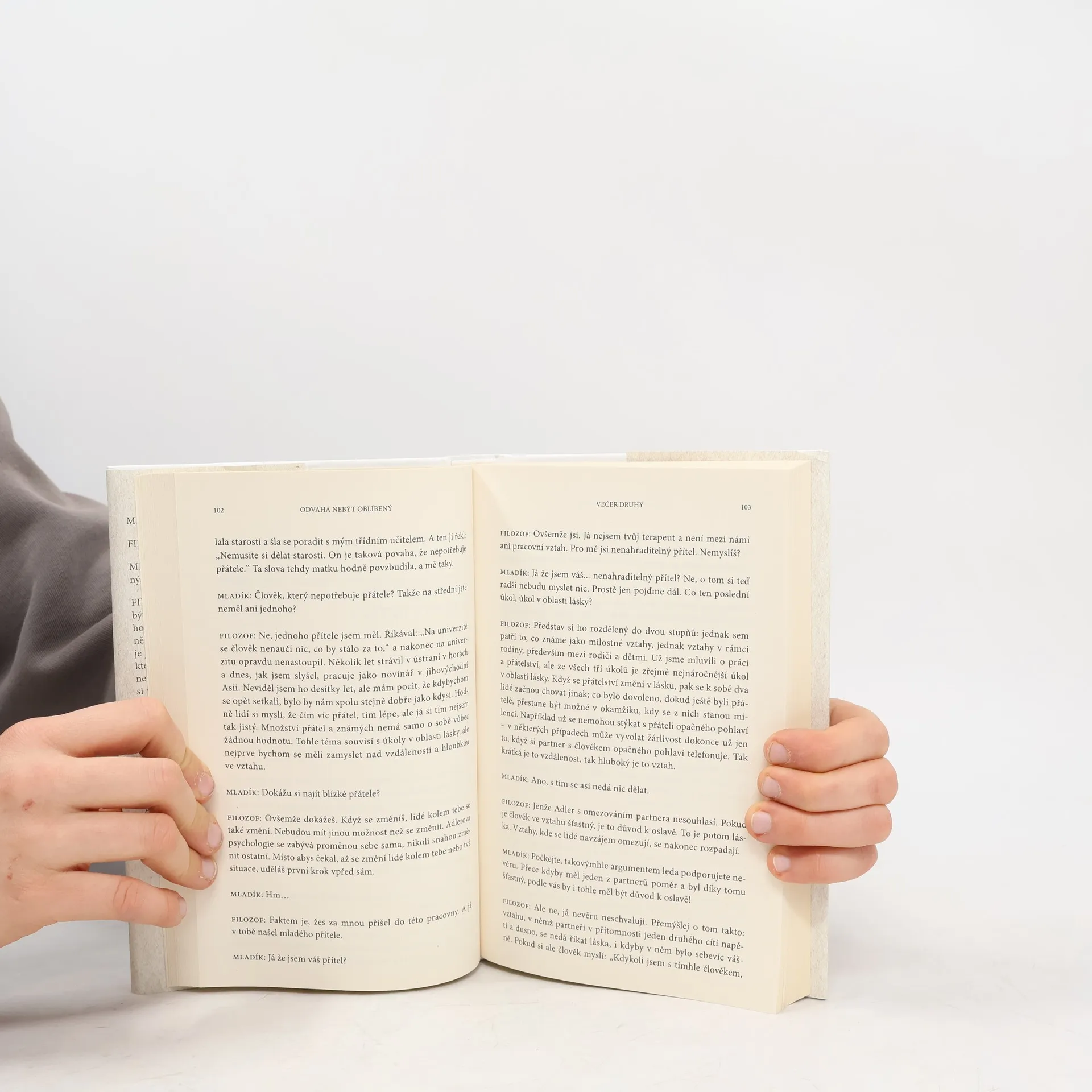 Kniha je napísaná formou dialógu medzi filozofom a mladým mužom. Žiaľ, ich rozhovor je nepresvedčivý, strojený, účelový. Nútila som sa, aby som to dočítala. Kniha obsahuje aj zaujímavé postrehy, ale to slabé spracovanie ich dokonale prehluší, Navyše sa tu opakovane popiera existencia traumy, pričom bolo už aj vedecky dokázané, že emocionálne silne negatívny zážitok zanechá stopy nie len na psychike človeka, ale mení aj biochemické parametre a epigenetické procesy, ktoré perzistujú roky po traumatizujúcom zážitku. Celkovo tento literárny počin neodporúčam.