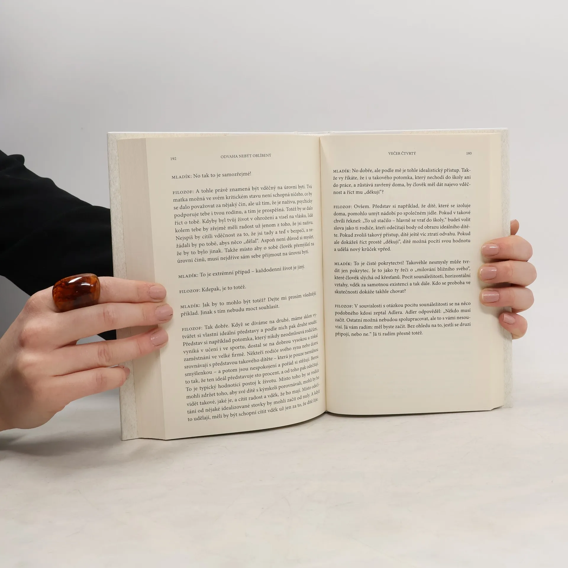 Kniha je napísaná formou dialógu medzi filozofom a mladým mužom. Žiaľ, ich rozhovor je nepresvedčivý, strojený, účelový. Nútila som sa, aby som to dočítala. Kniha obsahuje aj zaujímavé postrehy, ale to slabé spracovanie ich dokonale prehluší, Navyše sa tu opakovane popiera existencia traumy, pričom bolo už aj vedecky dokázané, že emocionálne silne negatívny zážitok zanechá stopy nie len na psychike človeka, ale mení aj biochemické parametre a epigenetické procesy, ktoré perzistujú roky po traumatizujúcom zážitku. Celkovo tento literárny počin neodporúčam.