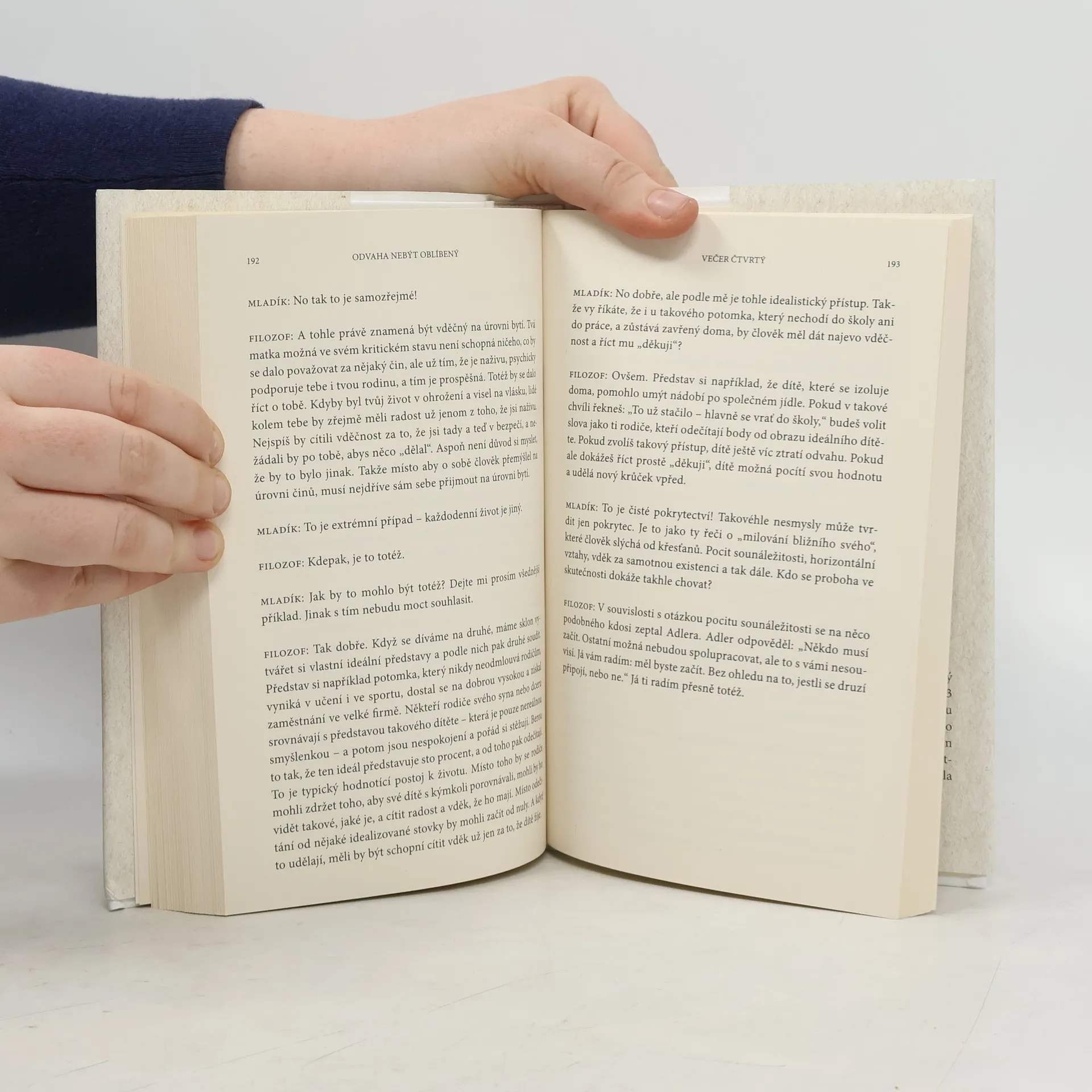 Kniha je napísaná formou dialógu medzi filozofom a mladým mužom. Žiaľ, ich rozhovor je nepresvedčivý, strojený, účelový. Nútila som sa, aby som to dočítala. Kniha obsahuje aj zaujímavé postrehy, ale to slabé spracovanie ich dokonale prehluší, Navyše sa tu opakovane popiera existencia traumy, pričom bolo už aj vedecky dokázané, že emocionálne silne negatívny zážitok zanechá stopy nie len na psychike človeka, ale mení aj biochemické parametre a epigenetické procesy, ktoré perzistujú roky po traumatizujúcom zážitku. Celkovo tento literárny počin neodporúčam.