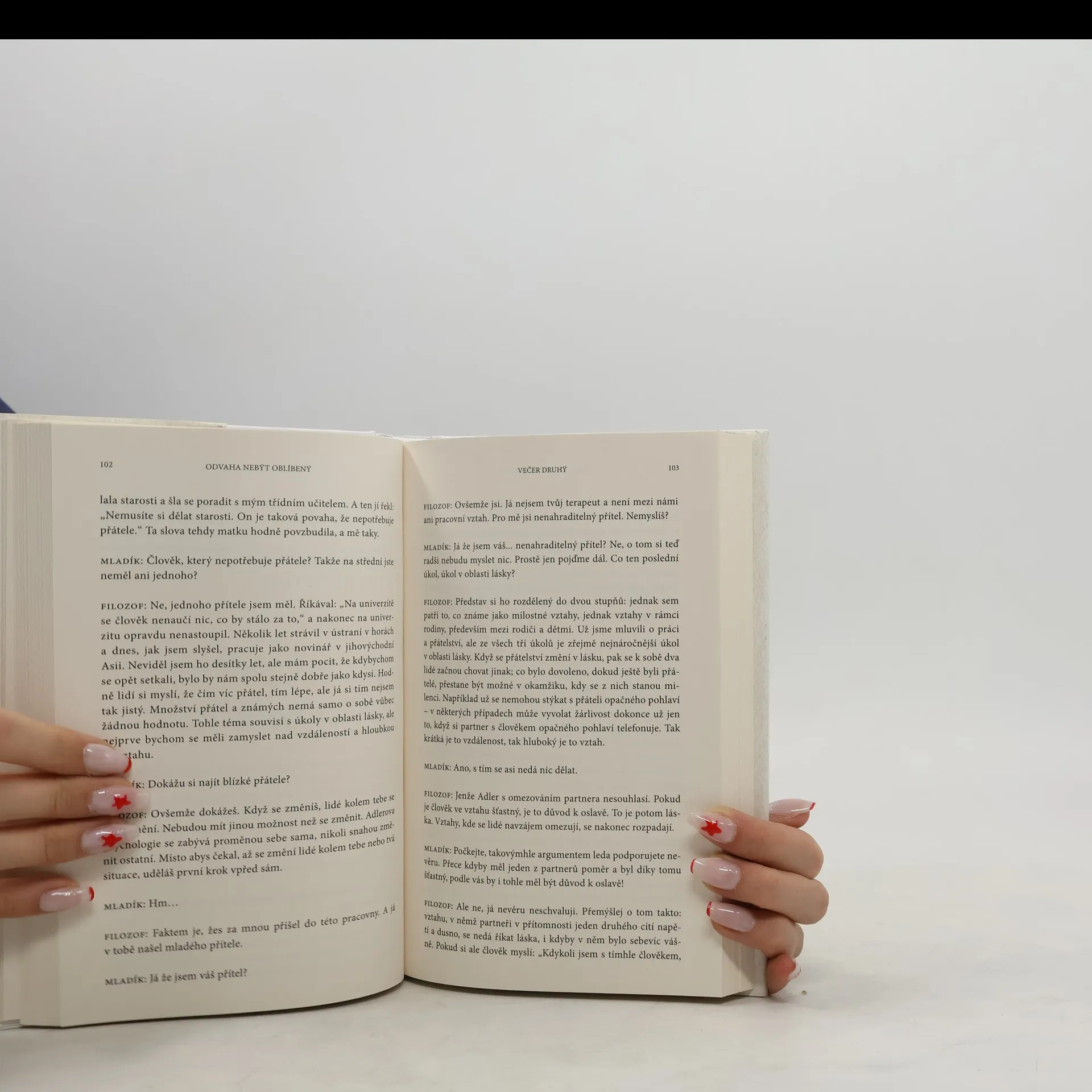 Kniha je napísaná formou dialógu medzi filozofom a mladým mužom. Žiaľ, ich rozhovor je nepresvedčivý, strojený, účelový. Nútila som sa, aby som to dočítala. Kniha obsahuje aj zaujímavé postrehy, ale to slabé spracovanie ich dokonale prehluší, Navyše sa tu opakovane popiera existencia traumy, pričom bolo už aj vedecky dokázané, že emocionálne silne negatívny zážitok zanechá stopy nie len na psychike človeka, ale mení aj biochemické parametre a epigenetické procesy, ktoré perzistujú roky po traumatizujúcom zážitku. Celkovo tento literárny počin neodporúčam.