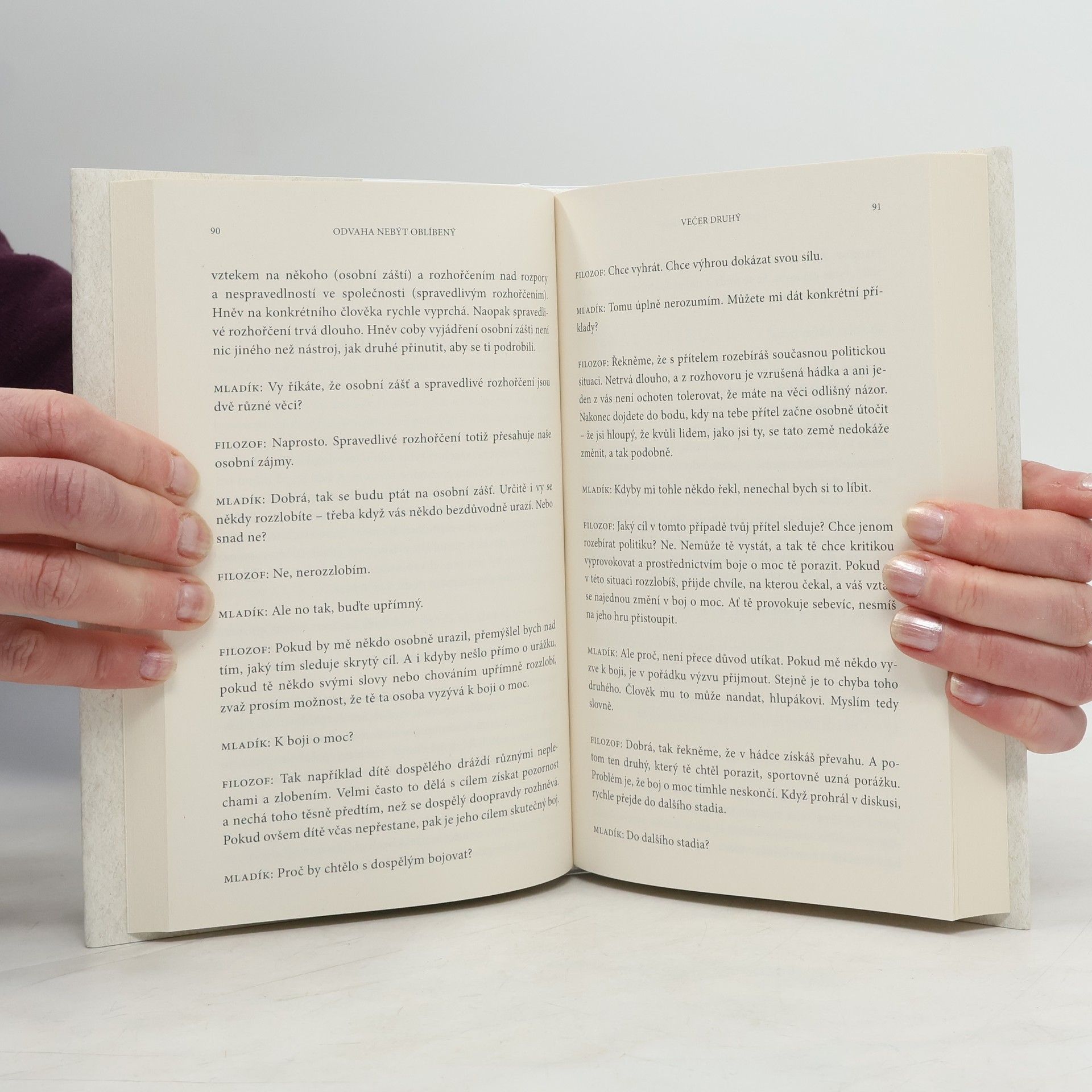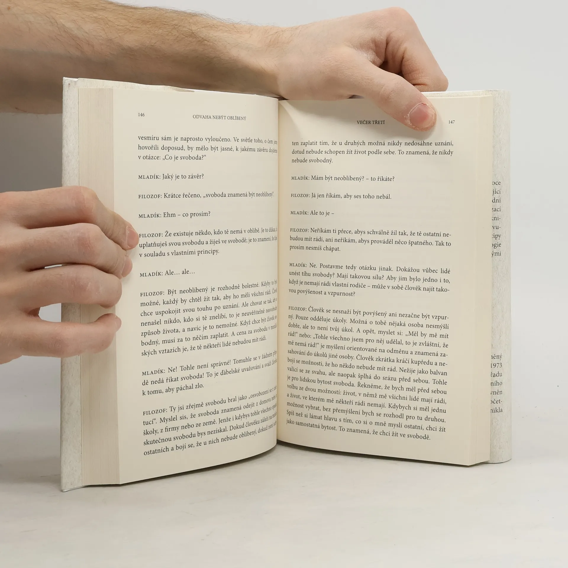 Kniha je napísaná formou dialógu medzi filozofom a mladým mužom. Žiaľ, ich rozhovor je nepresvedčivý, strojený, účelový. Nútila som sa, aby som to dočítala. Kniha obsahuje aj zaujímavé postrehy, ale to slabé spracovanie ich dokonale prehluší, Navyše sa tu opakovane popiera existencia traumy, pričom bolo už aj vedecky dokázané, že emocionálne silne negatívny zážitok zanechá stopy nie len na psychike človeka, ale mení aj biochemické parametre a epigenetické procesy, ktoré perzistujú roky po traumatizujúcom zážitku. Celkovo tento literárny počin neodporúčam.
