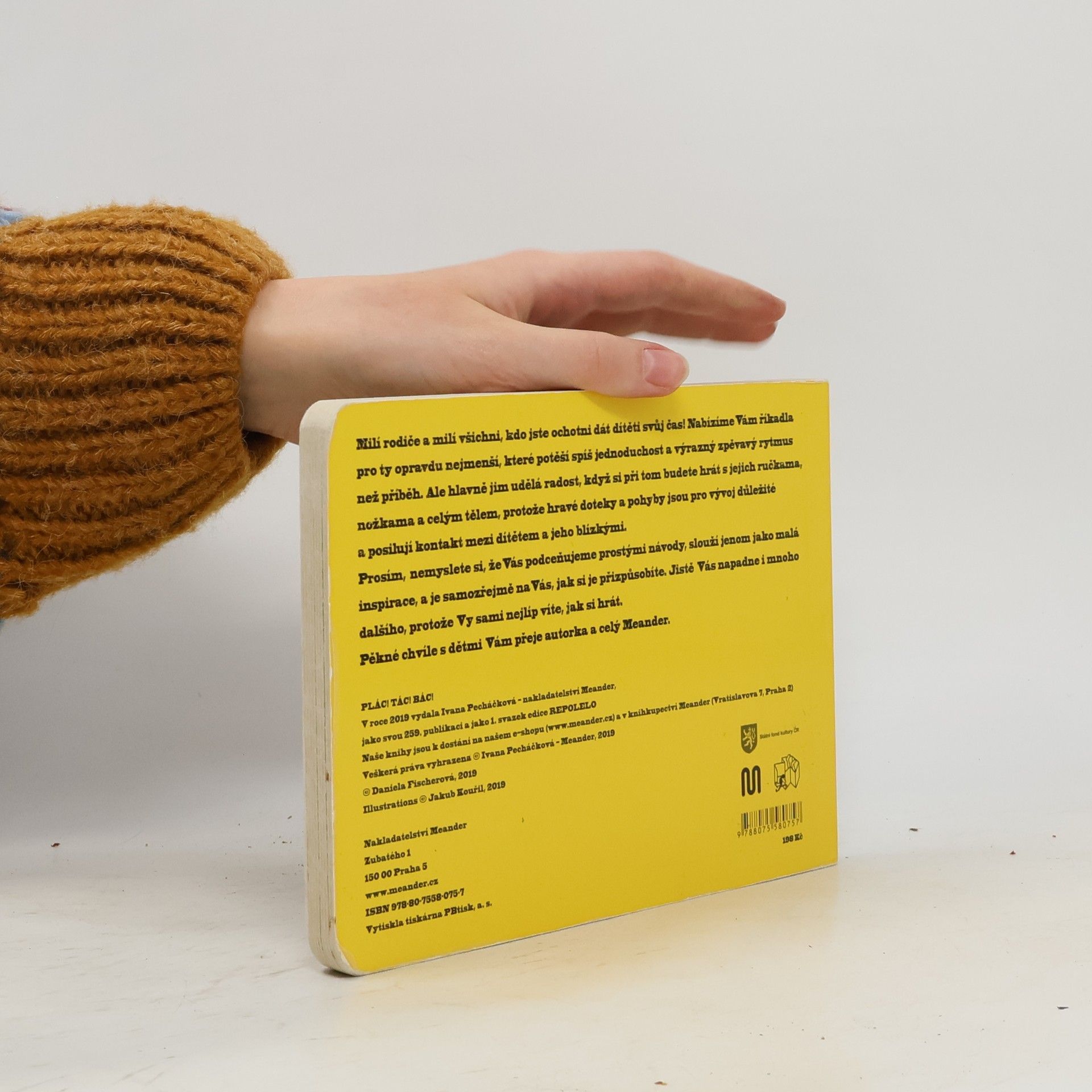 V nové edici nabízíme říkadla pro ty opravdu nejmenší, které potěší spíš jednoduchost a výrazný zpěvavý rytmus než složitý příběh. Ale hlavně jim udělá radost, když si při tom budete hrát s jejich ručkama, nožkama a celým tělem, protože hravé doteky a pohyby jsou pro vývoj důležité a posilují kontakt mezi dítětem a jeho blízkými. Prosím nemyslete si, že vás podceňujeme prostými návody, slouží jenom jako malá inspirace, a je samozřejmě na vás, jak si je přizpůsobíte. Jistě vás napadne i mnoho dalšího, protože vy sami nejlíp víte, jak si hrát. Pěkné chvíle s dětmi nad knihou vám přeje Daniela Fischerová a tvůrčí tým Meandru.