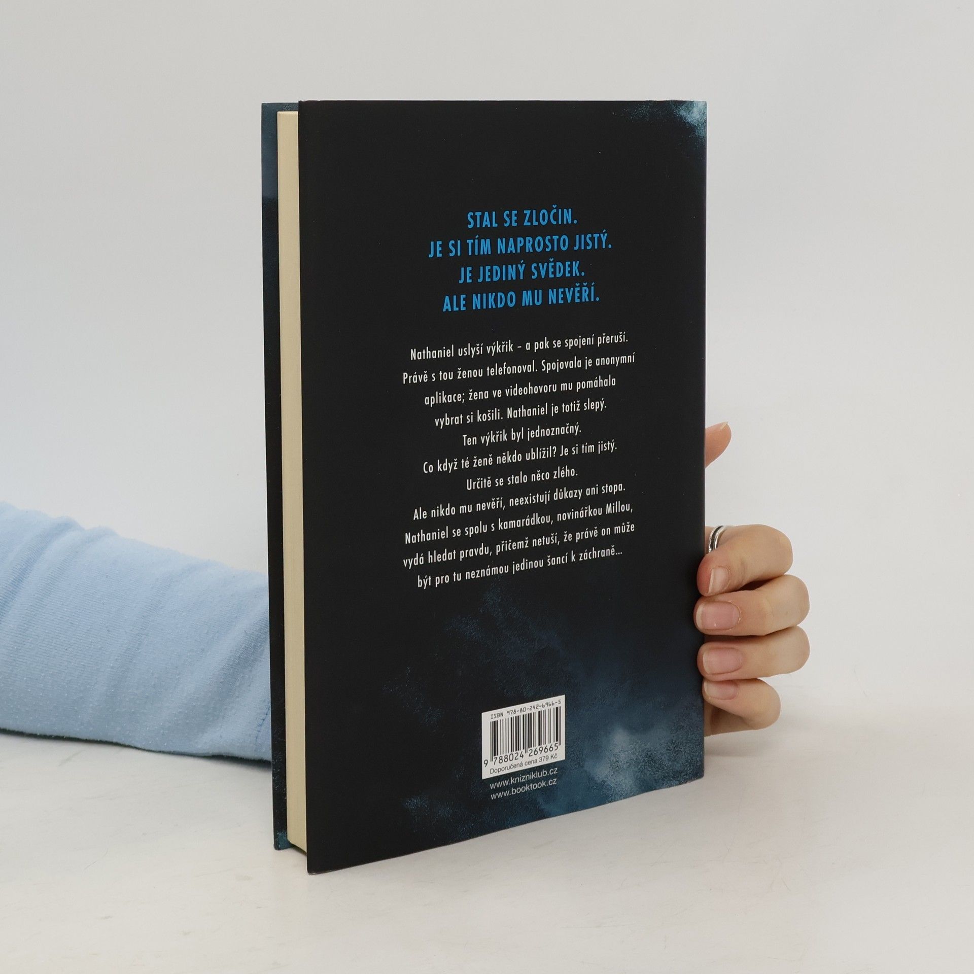 Jeho svět je tma. Je slepý. Ale uslyšel výkřik – a jeho smysly ho dosud nikdy nezklamaly. Právě s tou ženou telefonoval, když náhle vykřikla a vzápětí se spojení přerušilo. Někdo té ženě ublížil. Nathaniel je si tím naprosto jistý. Je jediný svědek, ale nikdo mu nevěří. Neexistují důkazy ani stopa. Nathaniel se spolu s kamarádkou, novinářkou Millou, vydá hledat pravdu, přičemž netuší, že zrovna on může být pro tu neznámou jedinou šancí k záchraně…