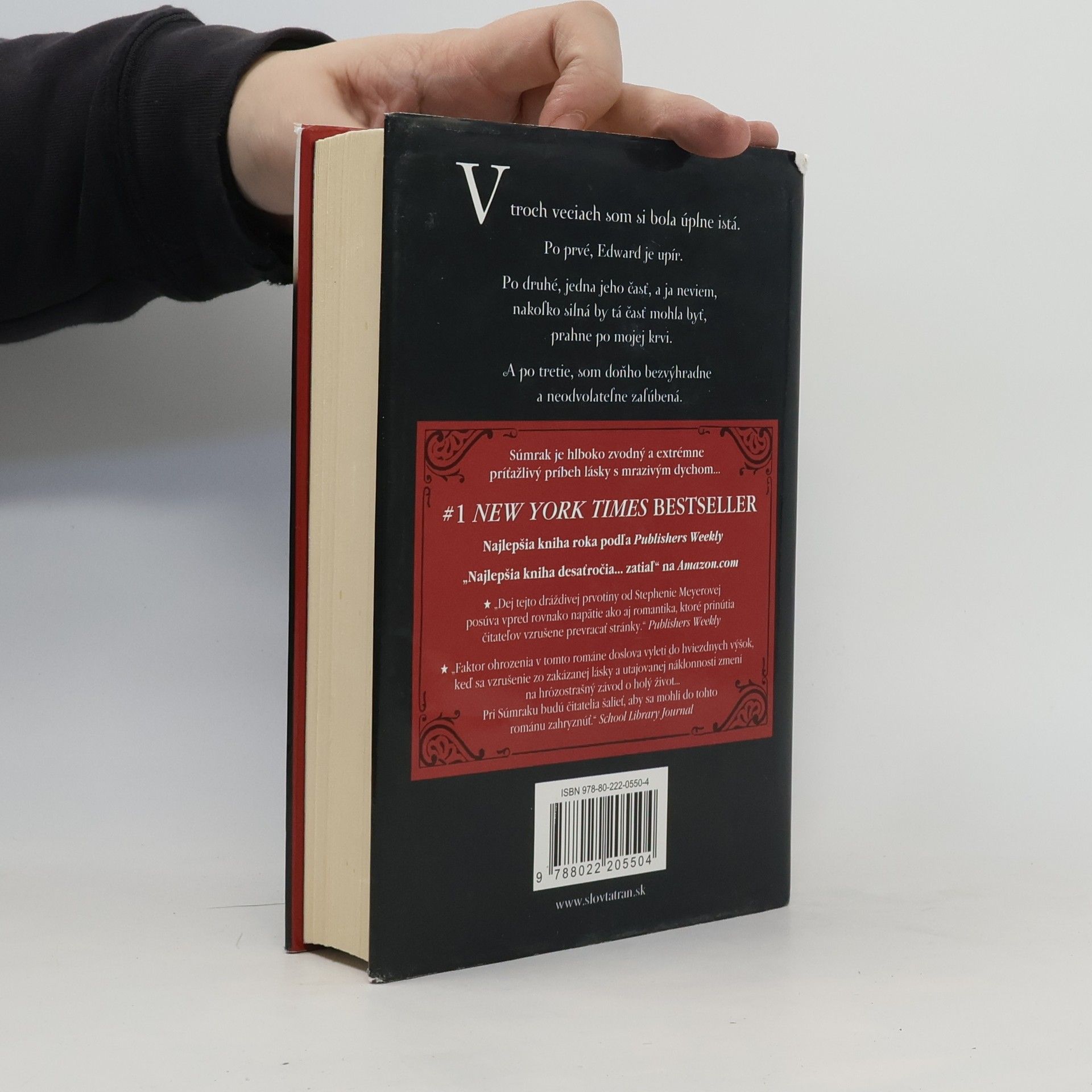 Súmrak od Stephenie Meyerovej bol po svojom vydaní mimoriadne úspešný a prilákal množstvo nadšených čitateľov. Hoci je určený mladšej vekovej kategórii, román si získal aj staršie generácie, pričom sa dostal až k babičkám. Publishers Weekly ho označil za najlepšiu knihu roka, získal ocenenie Editor's Choice v New York Times a na Amazon.com bol vyhlásený za najlepšiu knihu desaťročia. Príťažlivosť tohto diela spočíva v kombinácii shakespearovskej lásky a faktora ohrozenia, ktorý sa zintenzívňuje, keď sa zakázaná láska a utajovaná náklonnosť menia na hrôzostrašný závod o prežitie. Napätie a romantika posúvajú dej vpred a nútia čitateľov neustále otáčať stránky. Keď sa Isabella Swanová presťahuje do zamračeného Forks, stretáva záhadného Edwarda Cullena, ktorého porcelánová pokožka a nadprirodzené schopnosti ju fascinujú. Edward sa snaží skrývať svoju pravú identitu, no Bella je odhodlaná odhaliť jeho temné tajomstvo. Čím bližšie sa k nemu dostáva, tým väčšiemu riziku vystavuje seba aj svojich blízkych. Na návrat už môže byť neskoro… Súmrak je zvodný a napínavý román, ktorý čitateľa doslova priklincuje, až kým neotočí poslednú stránku.