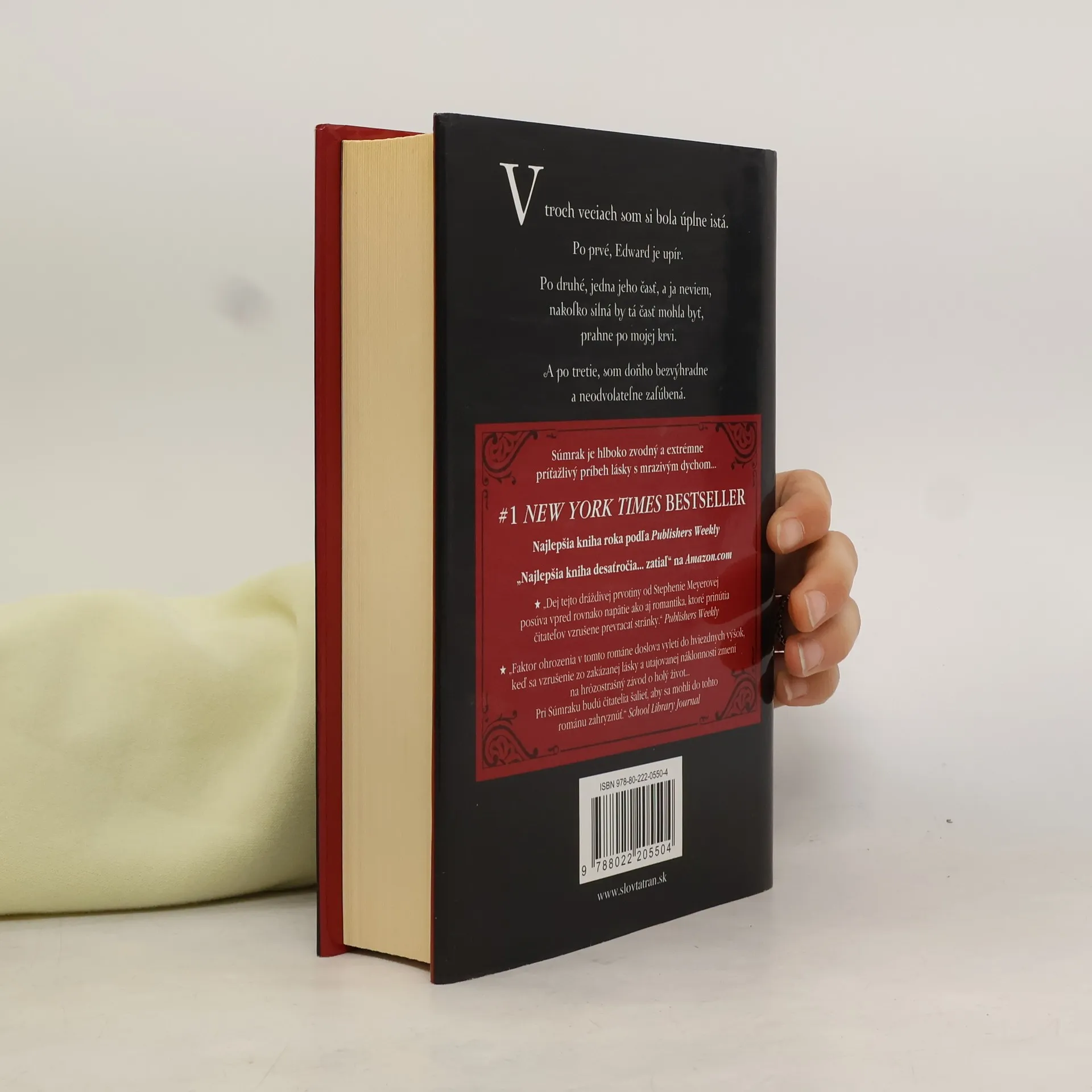Súmrak od Stephenie Meyerovej bol po svojom vydaní mimoriadne úspešný a prilákal množstvo nadšených čitateľov. Hoci je určený mladšej vekovej kategórii, román si získal aj staršie generácie, pričom sa dostal až k babičkám. Publishers Weekly ho označil za najlepšiu knihu roka, získal ocenenie Editor's Choice v New York Times a na Amazon.com bol vyhlásený za najlepšiu knihu desaťročia. Príťažlivosť tohto diela spočíva v kombinácii shakespearovskej lásky a faktora ohrozenia, ktorý sa zintenzívňuje, keď sa zakázaná láska a utajovaná náklonnosť menia na hrôzostrašný závod o prežitie. Napätie a romantika posúvajú dej vpred a nútia čitateľov neustále otáčať stránky. Keď sa Isabella Swanová presťahuje do zamračeného Forks, stretáva záhadného Edwarda Cullena, ktorého porcelánová pokožka a nadprirodzené schopnosti ju fascinujú. Edward sa snaží skrývať svoju pravú identitu, no Bella je odhodlaná odhaliť jeho temné tajomstvo. Čím bližšie sa k nemu dostáva, tým väčšiemu riziku vystavuje seba aj svojich blízkych. Na návrat už môže byť neskoro… Súmrak je zvodný a napínavý román, ktorý čitateľa doslova priklincuje, až kým neotočí poslednú stránku.