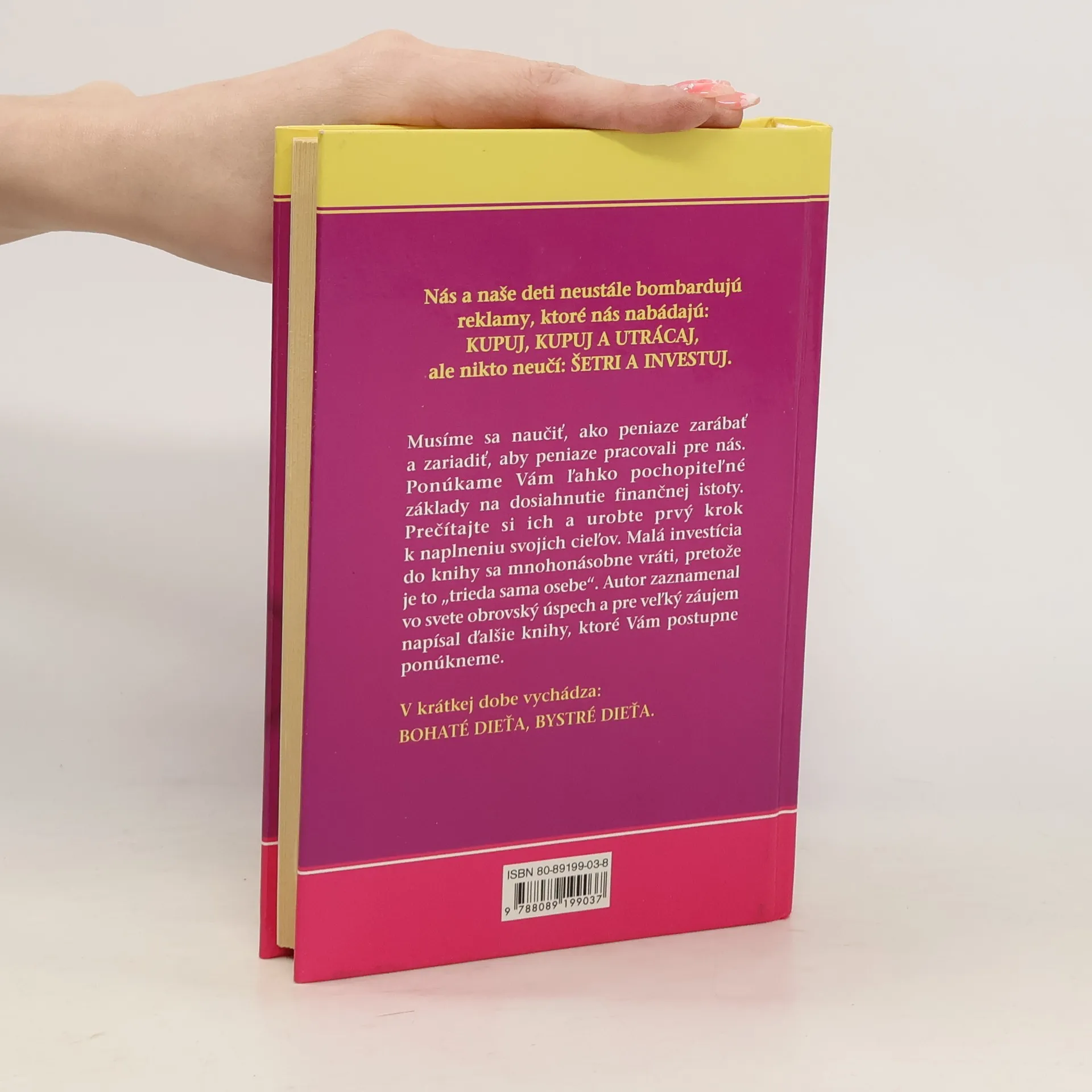 Musíme sa naučiť, ako peniaze zarábať a zariadiť, aby peniaze pracovali pre nás. Ponúkame vám ľahko pochopiteľné základy na dosiahnutie finančnej istoty. Prečítajte si ich a urobte prvý krok k naplneniu svojich cieľov. Malá investícia do knihy sa mnohonásobne vráti, pretože je to "trieda sama o sebe". Autor zaznamenal vo svete obrovský úspech a pre veľký záujem napísal ďalšie knihy, ktoré vám postupne ponúkneme.