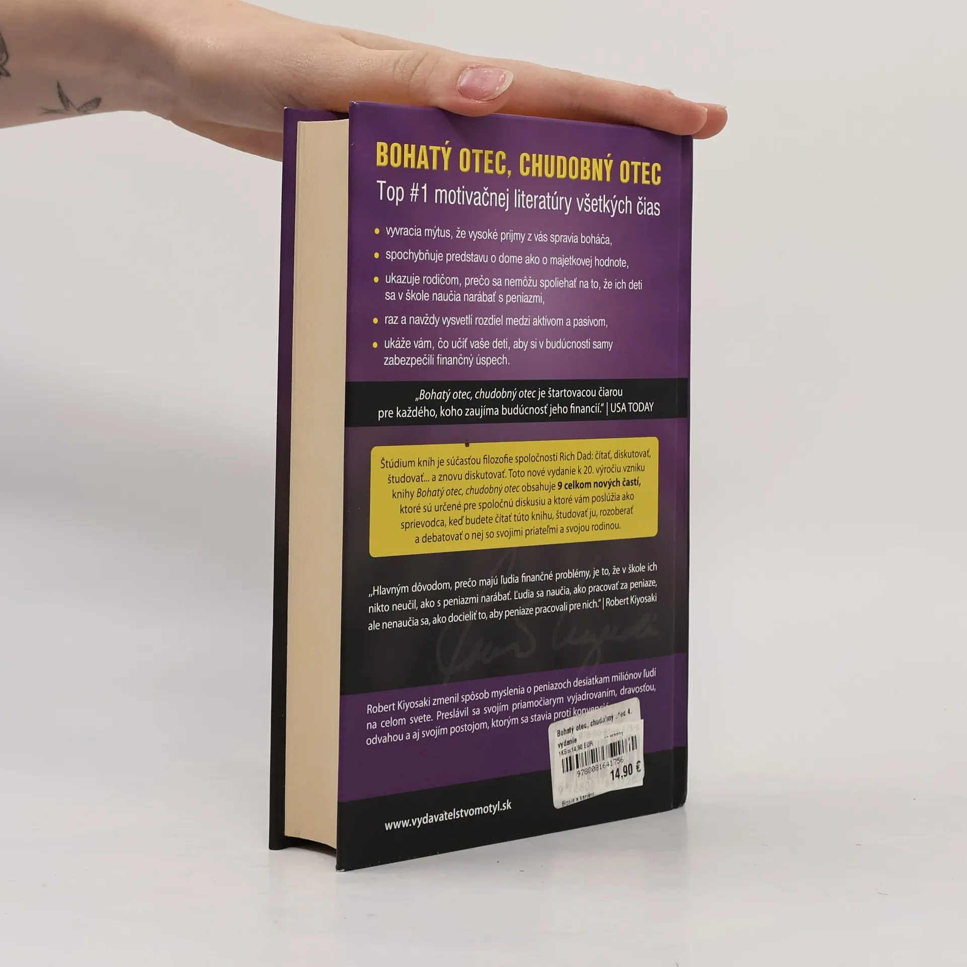 BOHATÝ OTEC, CHUDOBNÝ OTEC vyvracia mýtus, že vysoké príjmy z vás spravia boháča, spochybňuje predstavu o dome ako o majetkovej hodnote, ukazuje rodičom, prečo sa nemôžu spoliehať na to, že ich deti sa v škole naučia narábať s peniazmi, raz a navždy vysvetlí rozdiel medzi aktívom a pasívom, ukáže vám, čo učiť vaše deti, aby si v budúcnosti samy zabezpečili finančný úspech. Štúdium kníh je súčasťou filozofie spoločnosti Rich Dad: čítať, diskutovať, študovať... a znovu diskutovať. Toto nové, štvrté, vydanie k 20. výročiu vzniku knihy Bohatý otec, chudobný otec obsahuje 9 celkom nových častí, ktoré sú určené pre spoločnú diskusiu a ktoré vám poslúžia ako sprievodca, keď budete čítať túto knihu, študovať ju, rozoberať a debatovať o nej so svojimi priateľmi a svojou rodinou. Robert Kiyosaki zmenil spôsob myslenia o peniazoch desiatkam miliónov ľudí na celom svete. Preslávil sa svojím priamočiarym vyjadrovaním, dravosťou, odvahou a aj svojím postojom, ktorým sa stavia proti konvenciám.