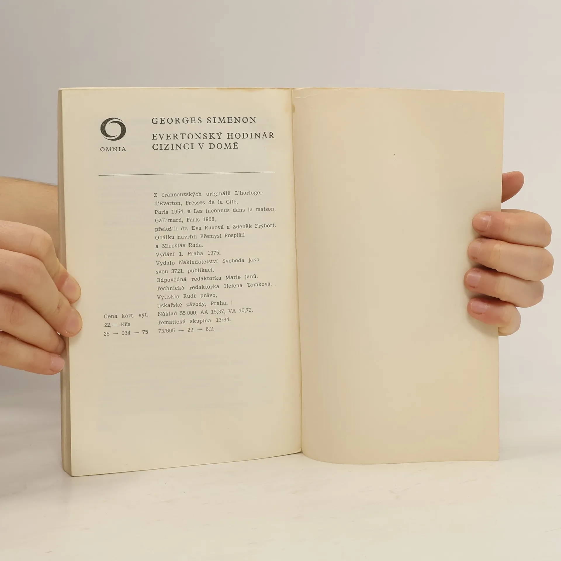 Ve svazku jsou spojeny dva psychologické romány, z nichž každý nazírá z jiného hlediska podobné téma: případ mladistvého zločince a poměr otce k provinilému dítěti.Evertonský hodinář je hluboké drama jednoho lidského typu, odrůdy slabých a ponížených, u nichž pod spořádaným povrchem dříme věčná vzpoura. Příběh je zasazen do malého amerického městečka, kde se po jediné hlavní ulici pohybují stále tíž lidé s pravidelností panáků na orloji. Hodinář Dave Galloway patří k těm nejtypičtějším a nejnenápadnějším. A přece právě u něho začně příběh, o který se bude zajímat celá Amerika a který vyřadí otce i syna z obce „slušných lidí“.Advokát Loursat z Cizinců v domě se z obce těch „slušných lidí“ vyřadil dávno a dobrovolně. A přece bývaly časy, kdy patřil ke smetánce velkého francouzského města. Co ho však opustila žena, nevychází z domu, a dospívající dcera Nicole ho vídá, jak bloudí po chodbách s lahví burgundského v ruce. V tom chátrajícím domě se jednou v noci ozve výstřel a starý advokát najde v podkroví mrtvolu neznámého muže. Loursat býval nejlepším obhájcem v kraji a proces, který ohrožuje i jeho dceru, probudí jeho ve víně utopené nadání.Eva Ruxová přeložila Evertonský hodinář a Zdeněk Frýbort přeložil Cizinci v domě.Obálku navrhli Přemysl Pospíšil a Miroslav Rada.Náklad 55 000 výtisků.ISBN 2503475.