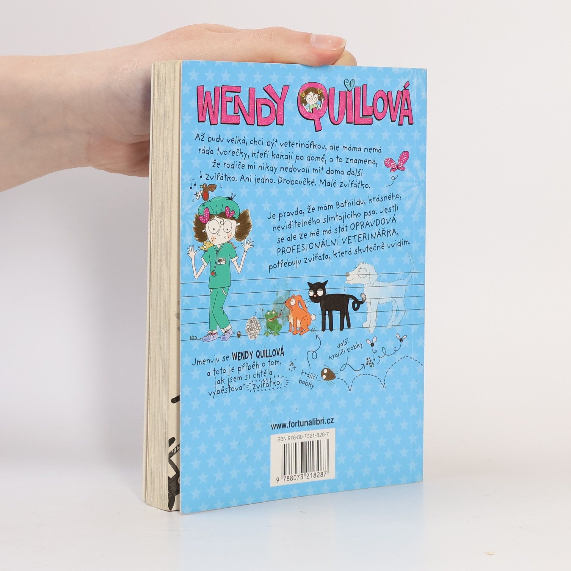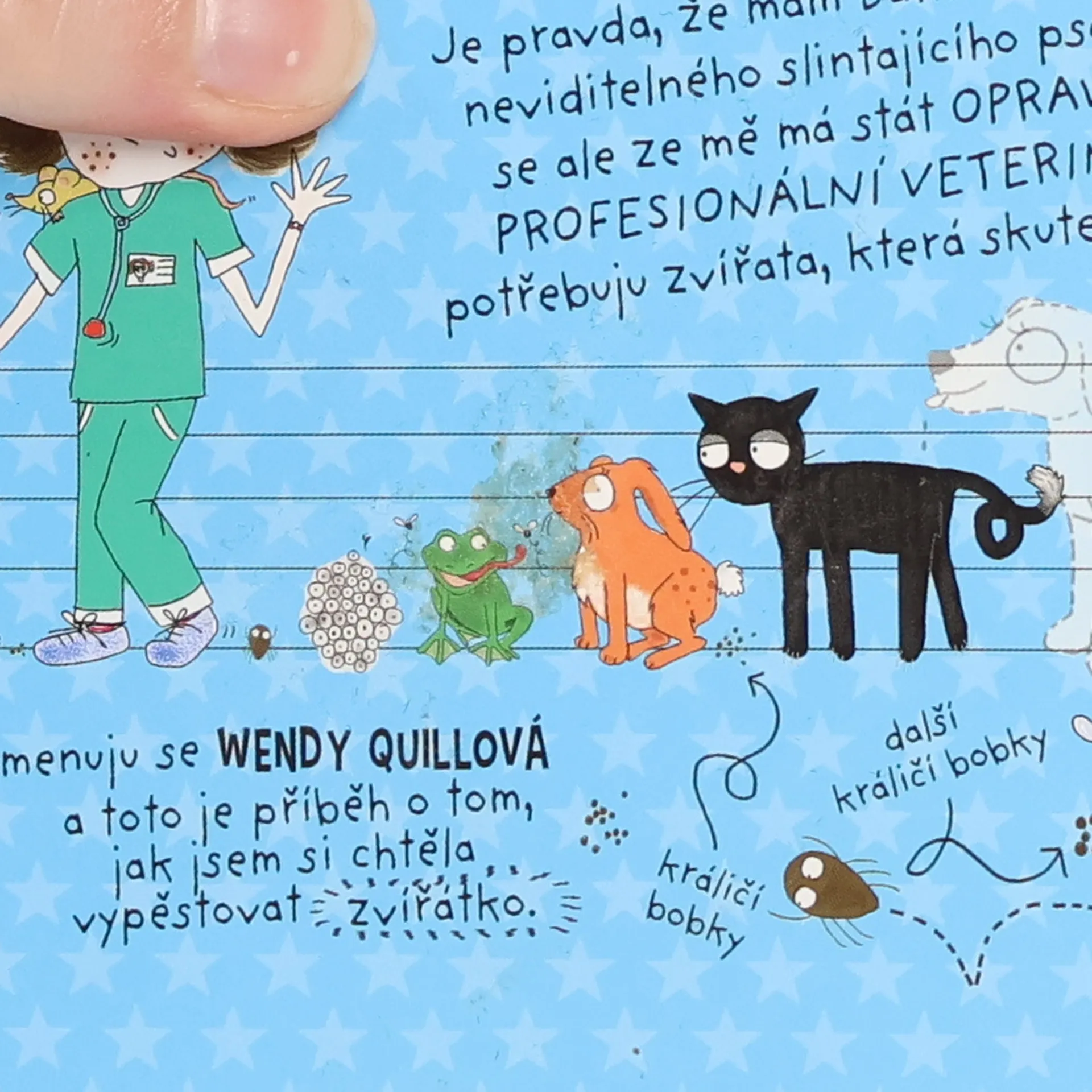 Jmenuju se Wendy Quillová a toto je příběh o tom, jak jsem si chtěla vypěstovat zvířátko. Až budu velká, chci být veterinářkou, ale máma nemá ráda tvorečky, kteří kakají po domě, a to znamená, že rodiče mi nikdy nedovolí mít doma další zvířátko. Ani jedno. Droboučké. Malé zvířátko. Je pravda, že mám Bathildu, krásného, neviditelného slintajícího psa. Jestli se ale ze mě má stát OPRAVDOVÁ PROFESIONÁLNÍ VETERINÁŘKA, potřebuju zvířata, která skutečně uvidím.