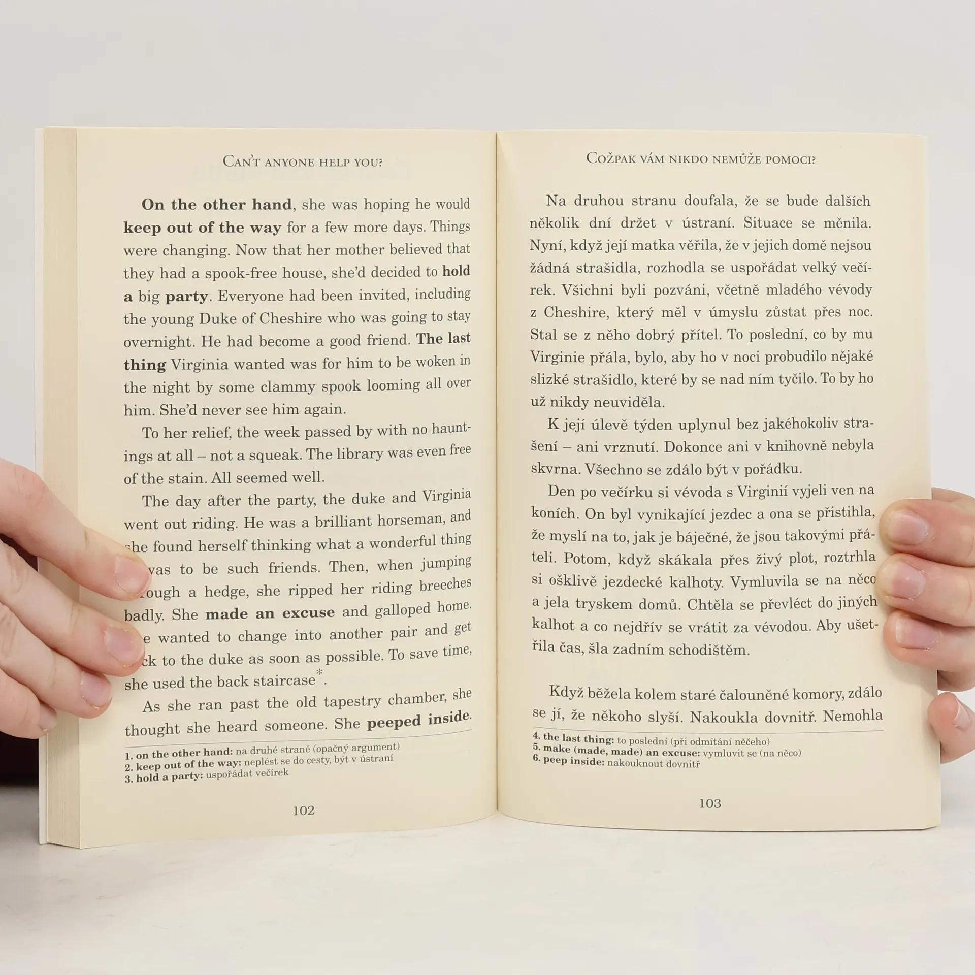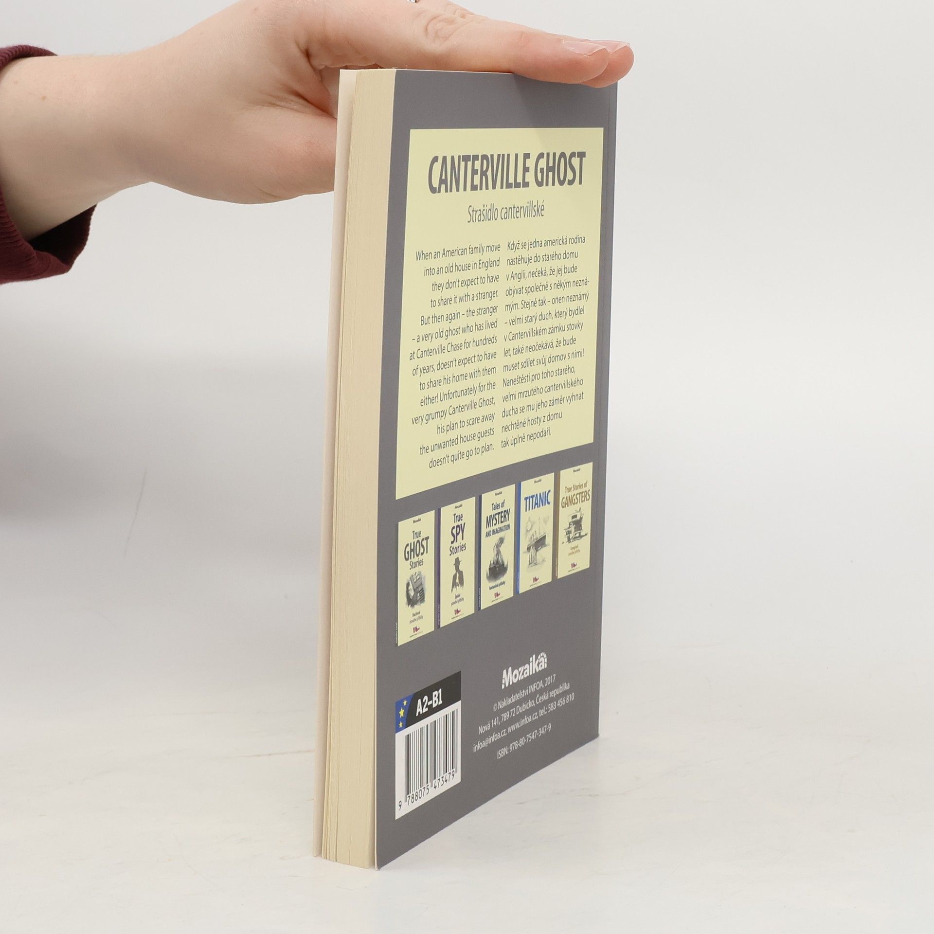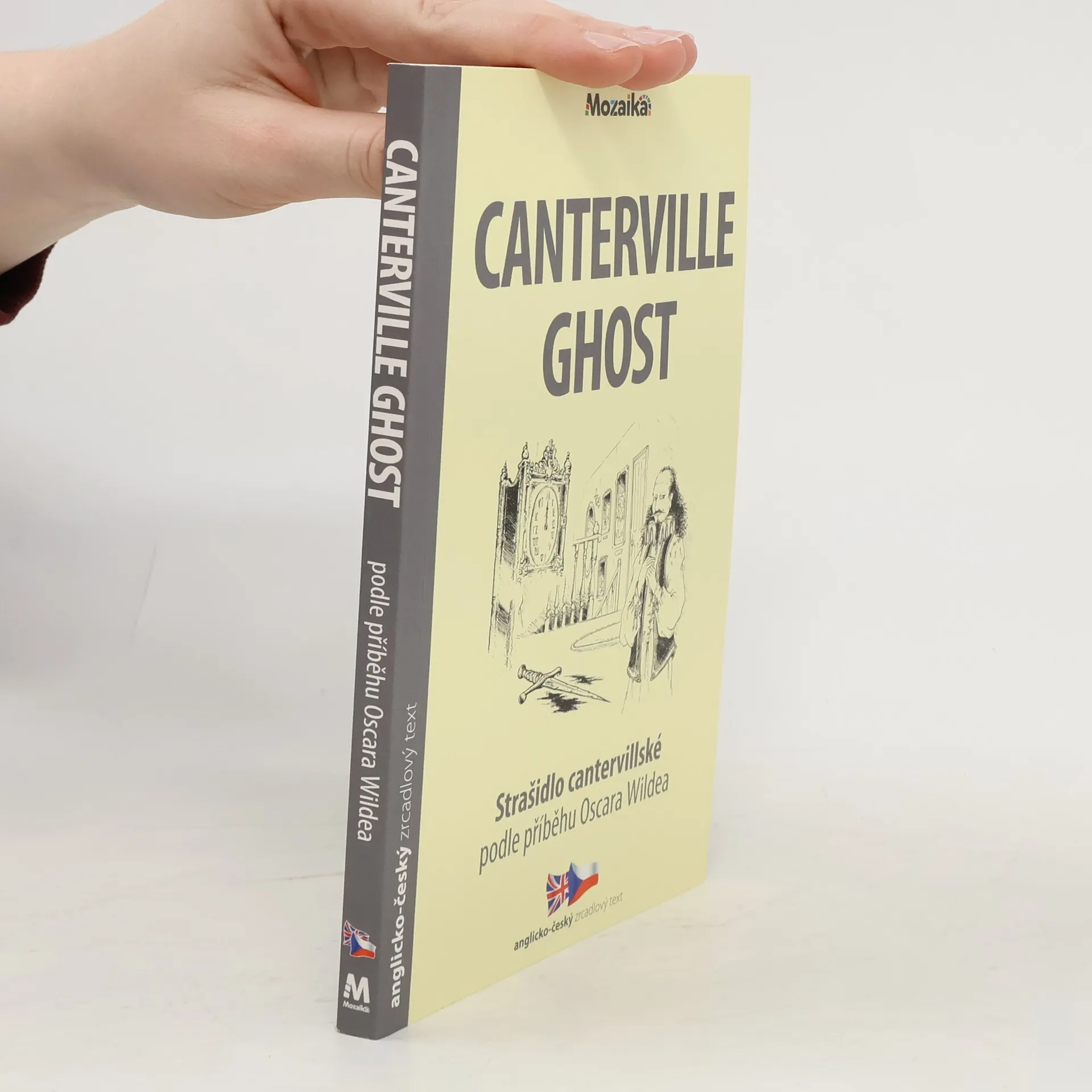 Známý příběh ve dvojjazyčné zrcadlové verzi. Adaptace. Podle příběhu Oscara Wildea. Zjednodušená četba. Rodina Otisových se nastěhuje do strašidelného domu, Cantervillského zámku. Duch, který v domě sídlí, sir Simon de Canterville, tam zavraždil v roce 1575 svou manželku, a za svou vinu je potrestán tak, že musí v domě strašit. Sir Simon straší pomocí krvavých skvrn různých barev, které se každý den objevují na podlaze. Všechno je to k ničemu, protože Otisovu rodinu nic nevystraší. Virginii Otisové je sira Simona líto, a když jí řekne, že smrt jeho ženy zavinila nehoda a jak moc je nešťastný a osamělý, dožene ji to k slzám...