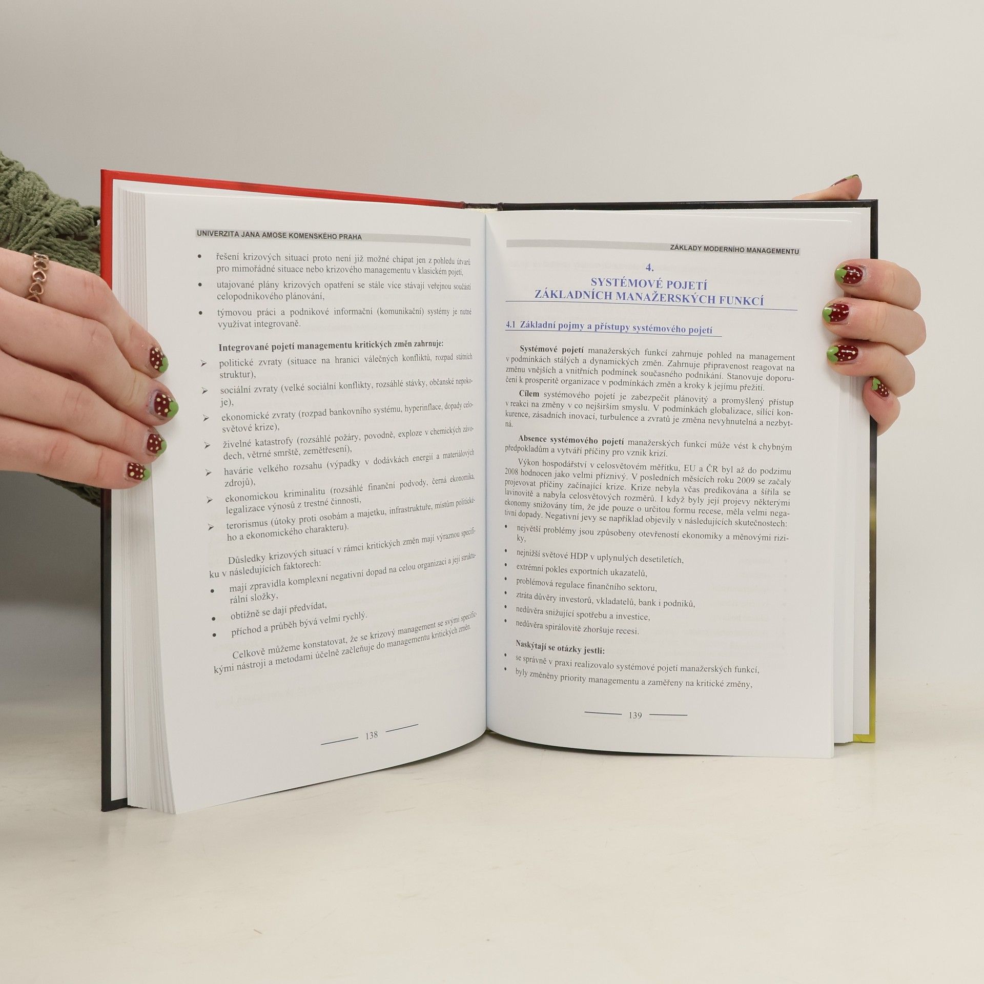 Publikace zkušeného odborníka nabízí čtenářům nový metodický pohled na základy managementu. Poskytuje logicky uspořádaný výklad moderního managementu s východisky pro manažerskou praxi. Autor řeší problematiku jak z pohledu podniků, tak i veřejné správy. Takových profesionálně zpracovaných publikací je velmi málo a v ČR chybí. Poznatky managementu konce devadesátých let dvacátého století jsou již překonány. Svět neustálých změn je živým organizmem a je ho potřebné chápat systémově. To vyžaduje tvůrčí a náročnou práci managementu. Význam zpracované problematiky v předložené struktuře je velký. Pro studijní obor management bude tato publikace vkladem do jeho dalšího rozvoje. Inspiraci v ní najdou jak studenti bakalářského, tak i magisterského studia (v prezenční i kombinované formě). Řadu podnětů může přinést manažerům různých úrovní a širokého zaměření. Čtenáři v knize ocení jak podrobný výklad základů moderního managementu, tak především návody a postupy, jak management může pomoci k rozvoji podnikové sféry a veřejné správy.