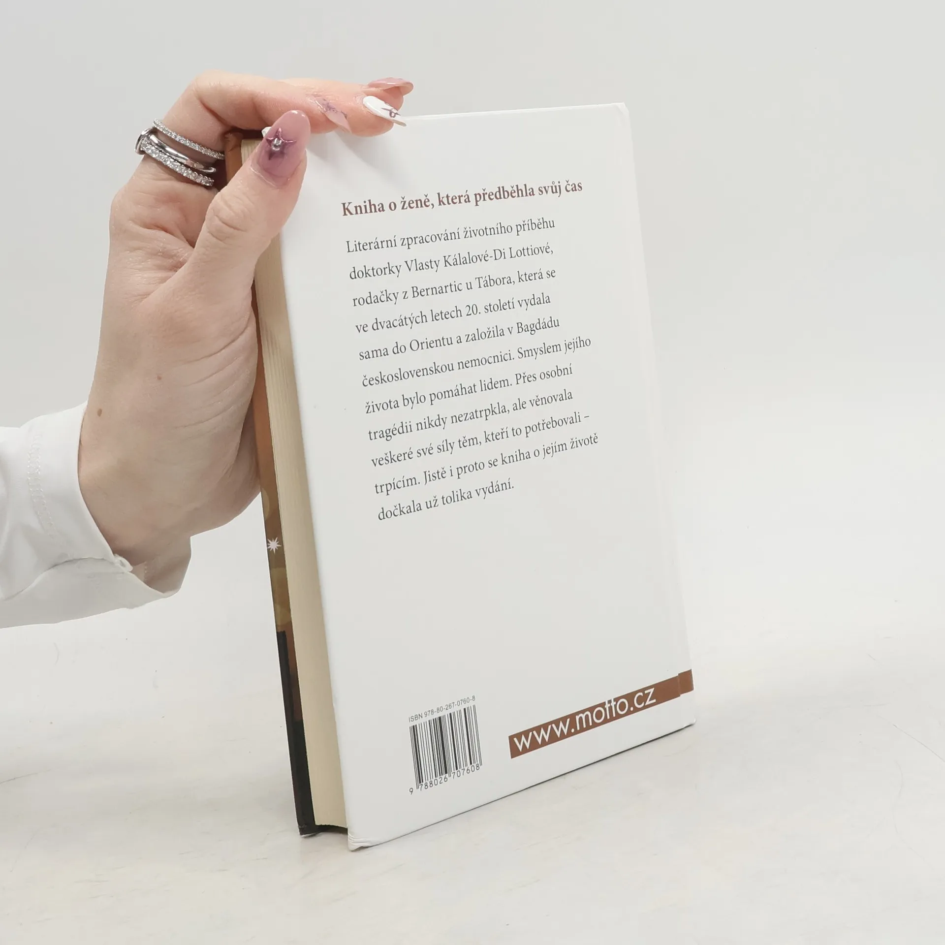 Literární zpracování životního příběhu doktorky Vlasty Kálalové-Di Lottiové, rodačky z Bernartic u Tábora, která se ve dvacátých letech minulého století vydala sama do Orientu a založila v Bagdádu československou nemocnici. Smyslem jejího života bylo pomáhat lidem. Přes osobní tragédii nikdy nezatrpkla, ale věnovala veškeré své síly těm, kteří to potřebovali – trpícím. Jistě i proto si kniha o jejím životě našla už tolik čtenářů.