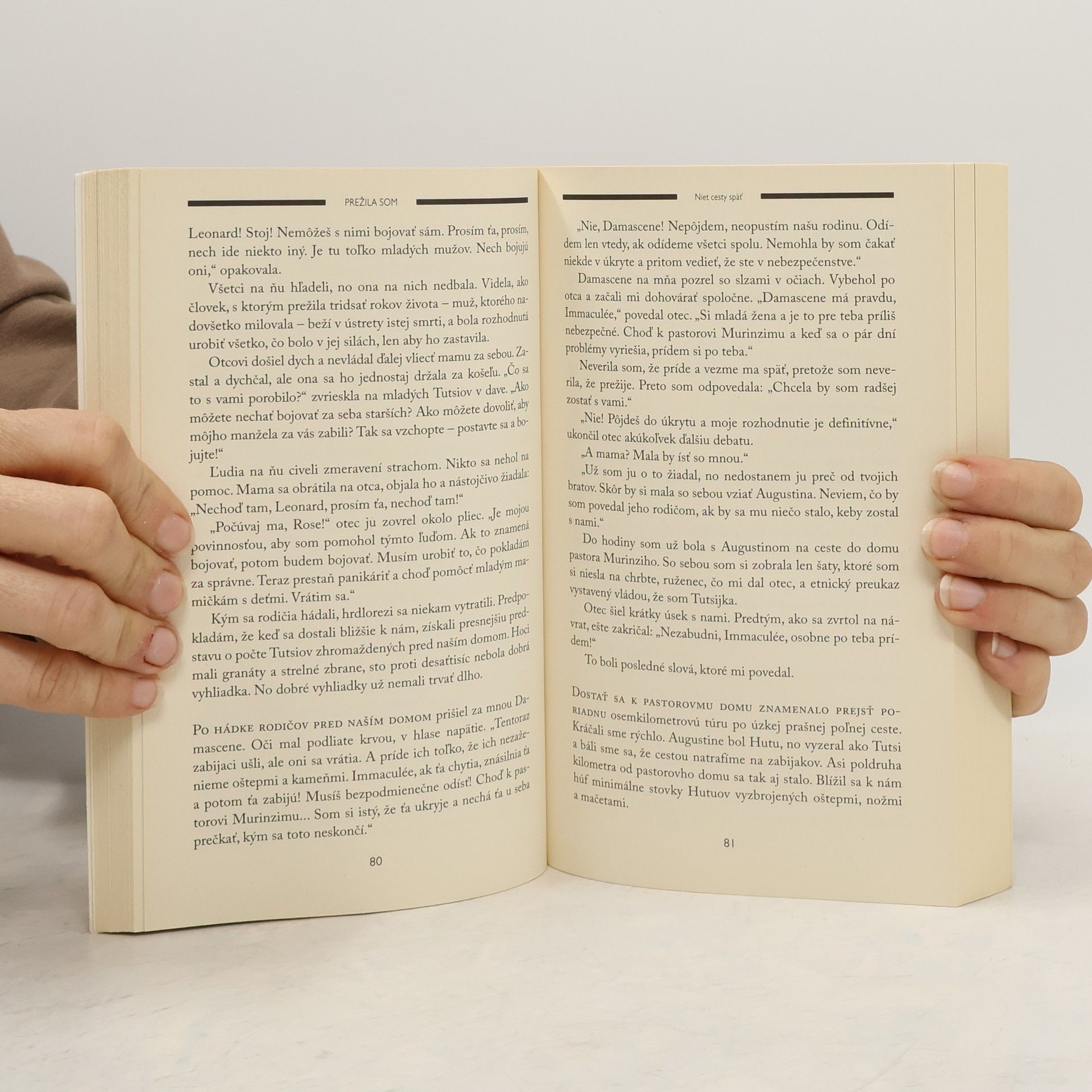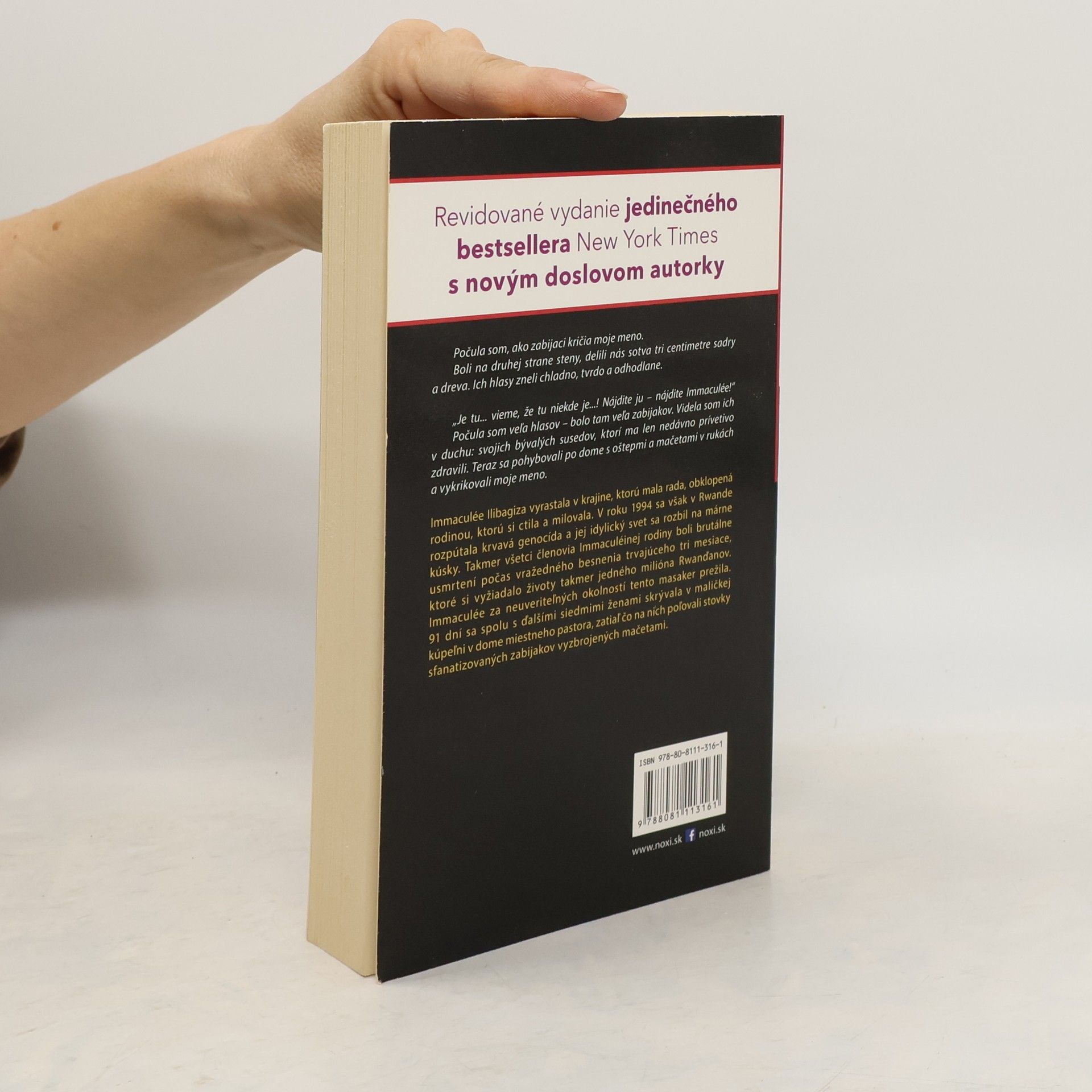 Immaculée Ilibagiza vyrastala v krajine, ktorú mala rada, s milovanou rodinou. V roku 1994 sa však v Rwande rozpútala krvavá genocída a Immaculéin dovtedajší život sa rozbil na márne kúsky. Takmer všetci členovia Immaculéinej rodiny boli brutálne zavraždení počas trojmesačného besnenia, ktoré si vyžiadalo životy asi milióna Rwanďanov. Immaculée tento masaker prežila za neuveriteľných okolností. 91 dní sa spolu s ďalšími siedmimi ženami skrývala v maličkej kúpeľni v dome miestneho pastora, zatiaľ čo na nich poľovali stovky sfanatizovaných zabijakov vyzbrojených mačetami. Pozoruhodný bestseller teraz vychádza s novým doslovom a Immaculée v ňom pridáva spomienky na dvadsať rokov, ktoré uplynuli od rwandskej genocídy. Je to pohľad nielen na zmeny v jej osobnom živote, ale aj na zmeny v živote krajiny, v ktorej sa tie strašné udalosti udiali.
