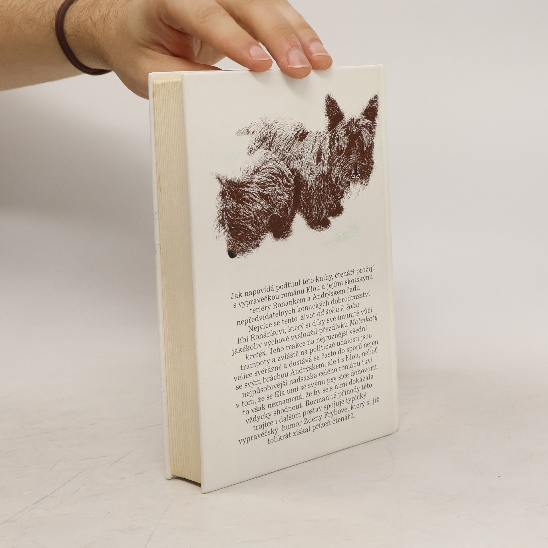 Humoristický román, v němž dva skotští teriéři Andrýsek a Ronánek přesvědčují dámu středního věku, že i po rozvodu může být život báječný a vzrušující. Vypravěčka románu Ela hned v úvodu knihy šokuje svého manžela, když jeho návrh na rozvod přijme s bohorovným klidem a okamžitě si začne plánovat život podle svého. Nečekané maléry, průšvihy a katastrofy, které život přináší, se líbí především Ronánkovi,který se díky své imunitě vůči jakékoliv výchově vysloužil přezdívku Malinkatý kretén.Jeho reakce na různé rodinné a společenské události jsou tak svérázné, že se často poštěká nejen se svým bráchou Andrýskem, ale i s Elou. Nejpůsobivější nadsázka celého románu tkví v tom, že se Ela umí se svými psy sice dohovořit, to však neznamená, že se s nimi shodne. Rozmanité příhody této trojice i dalších postav spojuje typický vypravěčský humor Zdeny Frýbové, který se již tolikrát získal srdce čtenářů.... celý text