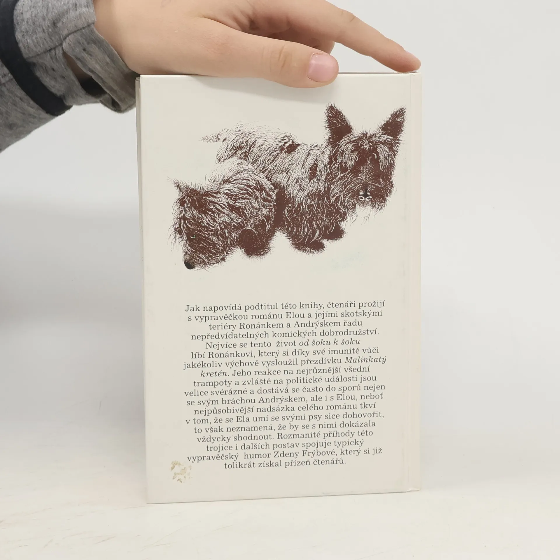 Humoristický román, v němž dva skotští teriéři Andrýsek a Ronánek přesvědčují dámu středního věku, že i po rozvodu může být život báječný a vzrušující. Vypravěčka románu Ela hned v úvodu knihy šokuje svého manžela, když jeho návrh na rozvod přijme s bohorovným klidem a okamžitě si začne plánovat život podle svého. Nečekané maléry, průšvihy a katastrofy, které život přináší, se líbí především Ronánkovi,který se díky své imunitě vůči jakékoliv výchově vysloužil přezdívku Malinkatý kretén.Jeho reakce na různé rodinné a společenské události jsou tak svérázné, že se často poštěká nejen se svým bráchou Andrýskem, ale i s Elou. Nejpůsobivější nadsázka celého románu tkví v tom, že se Ela umí se svými psy sice dohovořit, to však neznamená, že se s nimi shodne. Rozmanité příhody této trojice i dalších postav spojuje typický vypravěčský humor Zdeny Frýbové, který se již tolikrát získal srdce čtenářů.... celý text