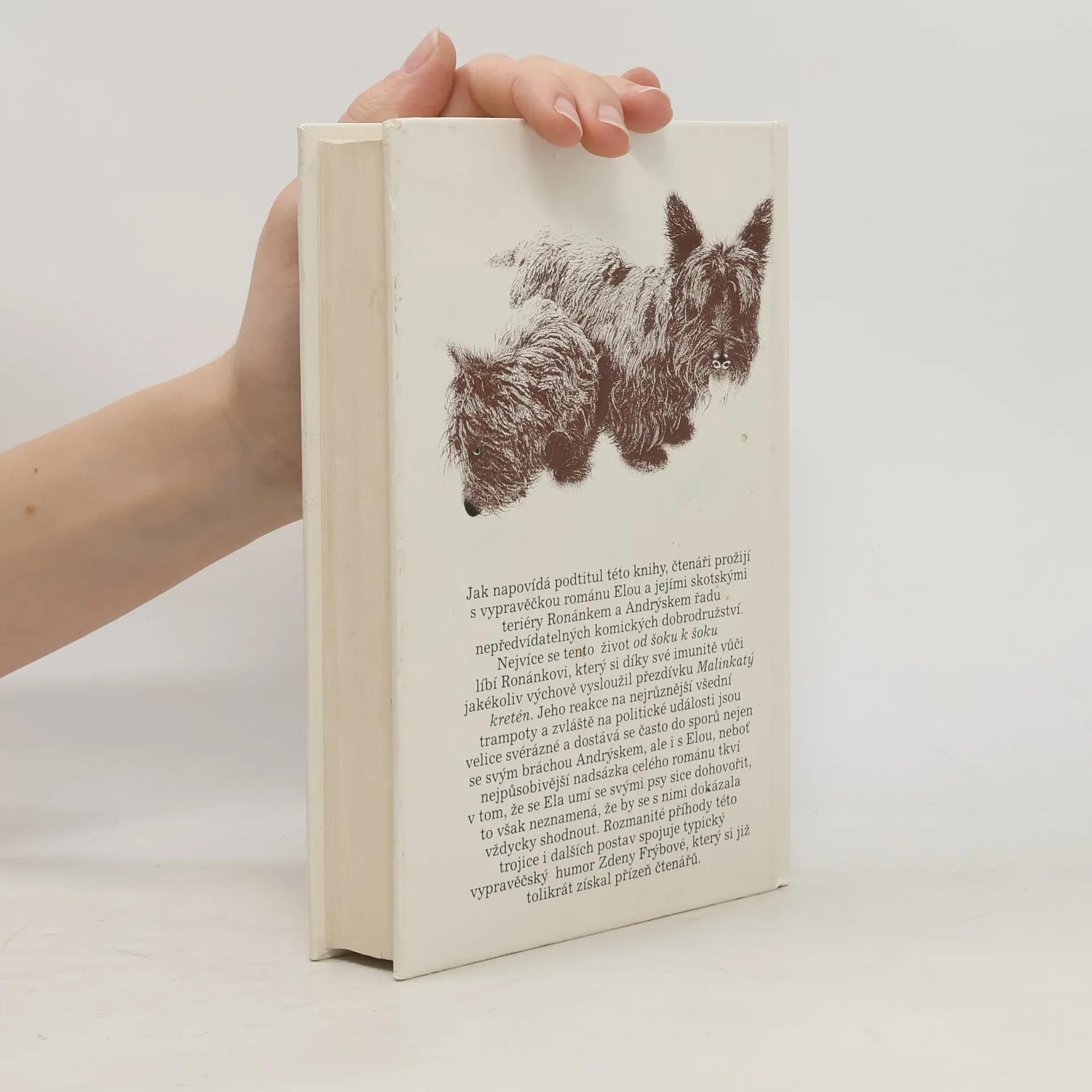 Humoristický román, v němž dva skotští teriéři Andrýsek a Ronánek přesvědčují dámu středního věku, že i po rozvodu může být život báječný a vzrušující. Vypravěčka románu Ela hned v úvodu knihy šokuje svého manžela, když jeho návrh na rozvod přijme s bohorovným klidem a okamžitě si začne plánovat život podle svého. Nečekané maléry, průšvihy a katastrofy, které život přináší, se líbí především Ronánkovi,který se díky své imunitě vůči jakékoliv výchově vysloužil přezdívku Malinkatý kretén.Jeho reakce na různé rodinné a společenské události jsou tak svérázné, že se často poštěká nejen se svým bráchou Andrýskem, ale i s Elou. Nejpůsobivější nadsázka celého románu tkví v tom, že se Ela umí se svými psy sice dohovořit, to však neznamená, že se s nimi shodne. Rozmanité příhody této trojice i dalších postav spojuje typický vypravěčský humor Zdeny Frýbové, který se již tolikrát získal srdce čtenářů.... celý text