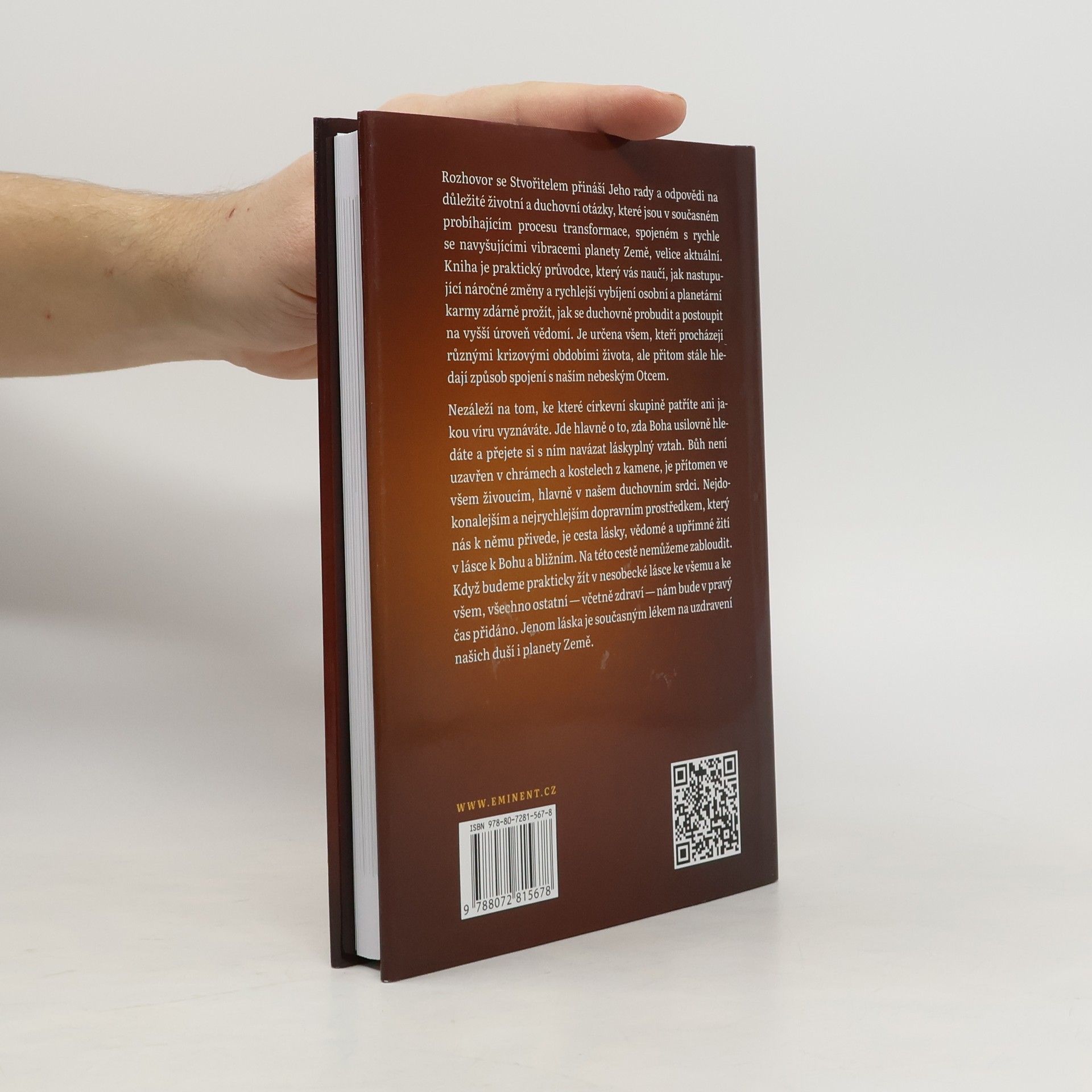 Rozhovor se Stvořitelem přináší Jeho rady a odpovědi na důležité životní a duchovní otázky, které jsou v současném probíhajícím procesu transformace, spojeném s rychle se navyšujícími vibracemi planety Země, velice aktuální. Kniha je praktický průvodce, který vás naučí, jak nastupující náročné změny a rychlejší vybíjení osobní a planetární karmy zdárně prožít, jak se duchovně probudit a postoupit na vyšší úroveň vědomí. Je určena všem, kteří procházejí různými krizovými obdobími života, ale přitom stále hledají způsob spojení s naším nebeským Otcem. Nezáleží na tom, ke které církevní skupině patříte ani jakou víru vyznáváte. Jde hlavně o to, zda Boha usilovně hledáte a přejete si s ním navázat láskyplný vztah. Bůh není uzavřen v chrámech a kostelech z kamene, je přítomen ve všem živoucím, hlavně v našem duchovním srdci. Nejdokonalejším a nejrychlejším dopravním prostředkem, který nás k němu přivede, je cesta lásky, vědomé a upřímné žití v lásce k Bohu a bližním. Na této cestě nemůžeme zabloudit. Když budeme prakticky žít v nesobecké lásce ke všemu a ke všem, všechno ostatní — včetně zdraví — nám bude v pravý čas přidáno. Jenom láska je současným lékem na uzdravení našich duší i planety Země.