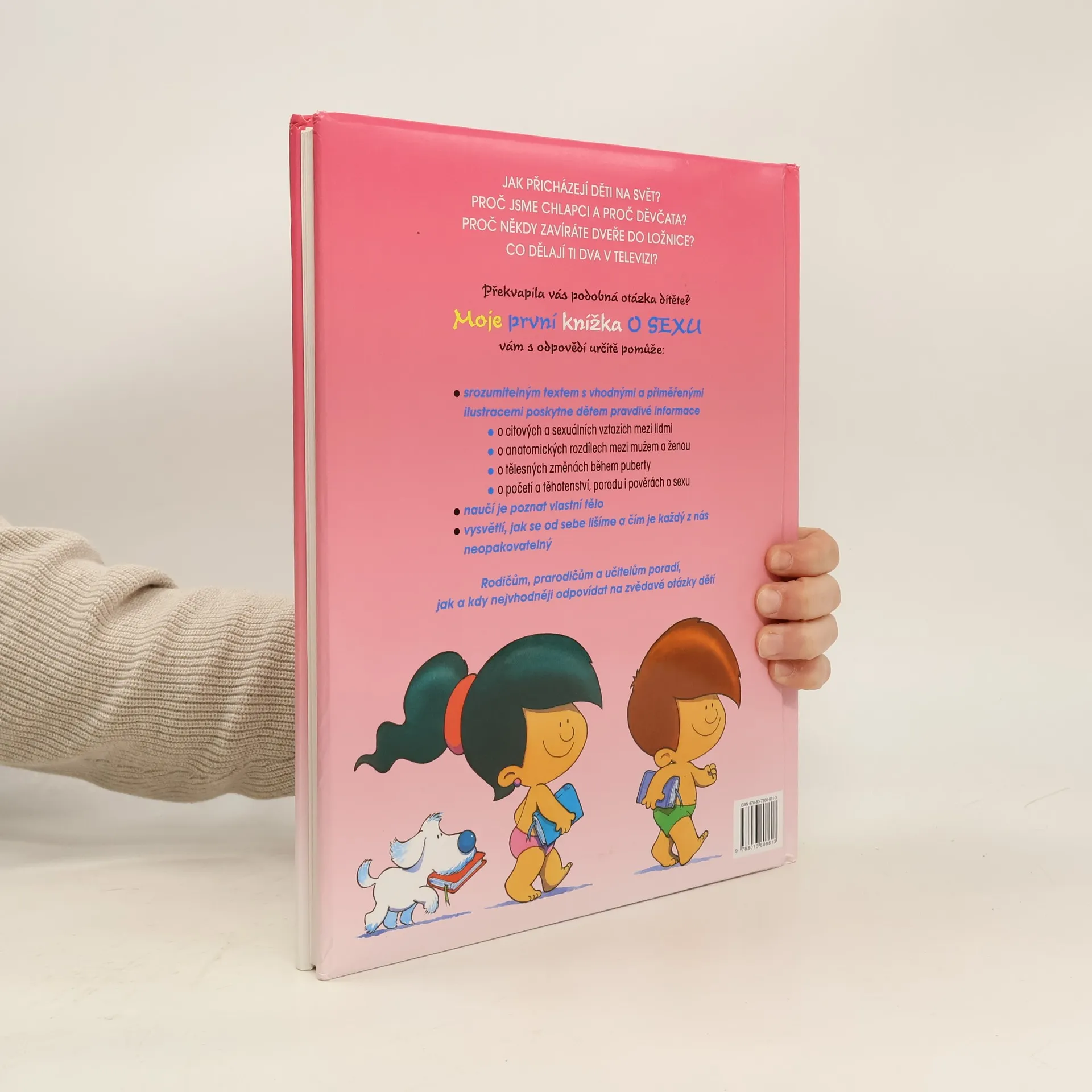 Jak přicházejí děti na svět? Proč jsme chlapci a proč děvčata? Proč někdy zavíráte dveře do ložnice? Co dělají ti dva v televizi? Překvapila vás podobná otázka dítěte? Moje první knížka o sexu vám s odpovědmi určitě pomůže: Srozumitelným textem s vhodnými a přiměřenými ilustracemi poskytne dětem pravdivé informace o citových sexuálních vztazích mezi lidmi, o anatomických rozdílech mezi mužem a ženou, o tělesných změnách během puberty, o početí a těhotenství, porodu i pověrách o sexu. Naučí je poznat vlastní tělo. Vysvětlí, jak se od sebe lišíme a čím je každý z nás neopakovatelný. Rodičům, prarodičům a učitelům poradí, lak a kdy nejvhodněji odpovídat na zvědavé otázky dětí.