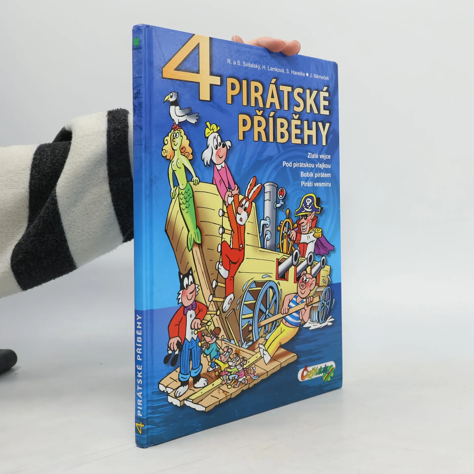 Kniha obsahuje příběhy: Zlaté vejce – Čtyřlístek na dovolené náhodou objeví poklad a podaří se mu zachránit dvě zakleté bytosti. Pod pirátskou vlajkou – Setkání s pravými středověkými piráty v časové smyčce Bermudského trojúhelníku. Bobík pirátem – Neopatrní piráti zamění Bobíka za jednoho ze svých kumpánů, a to se jim šeredně vymstí. Vesmírní piráti – Čtyřlístek se utká s novodobými piráty, které přesvědčí, že je lépe pomáhat, než škodit