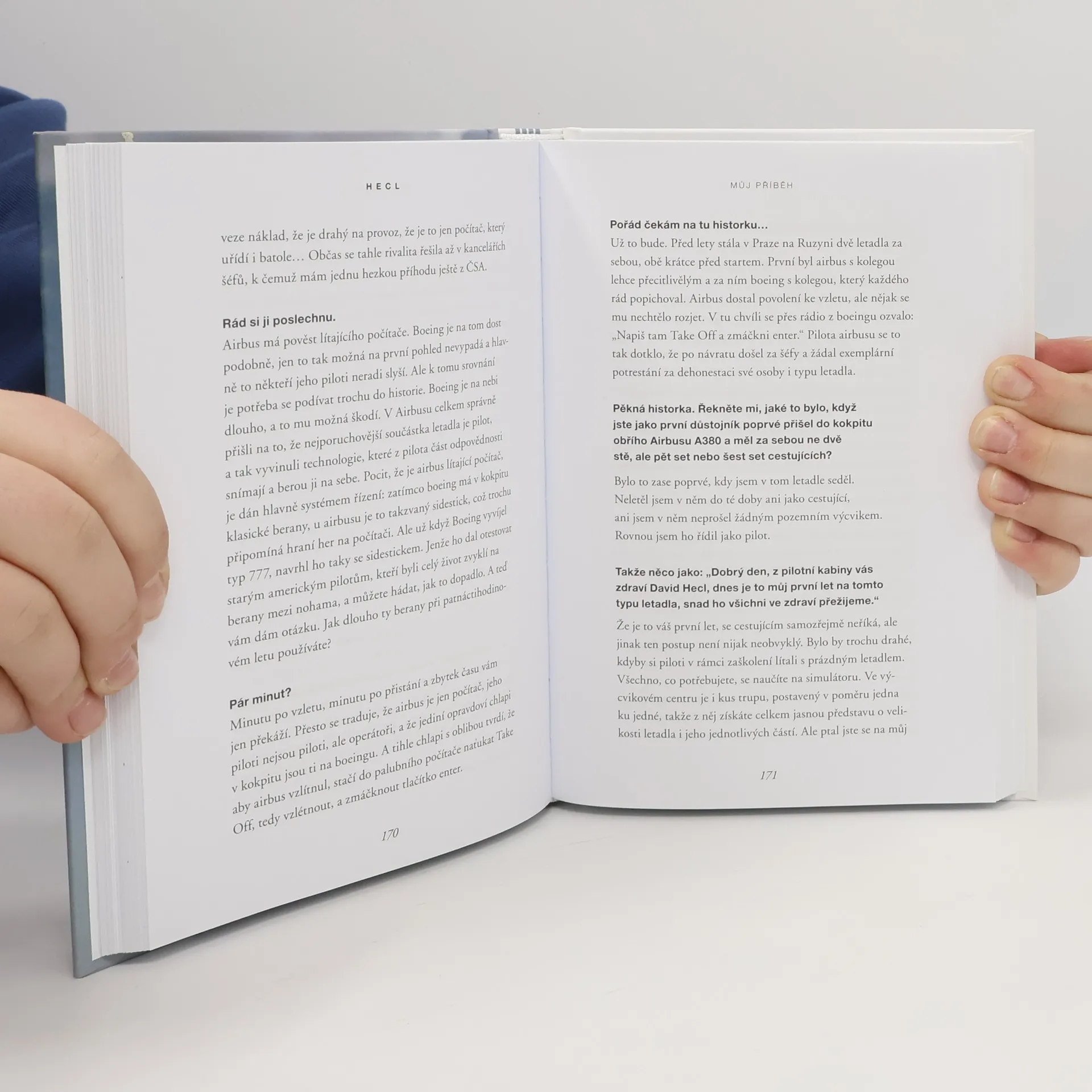 Dámy a pánové, připoutejte se, protože vás čeká opravdový zážitek. Je to už víc než třicet let, co David Hecl poprvé usedl do kokpitu. Tehdy ho trochu vylekal rámus motoru a těžko si pomyslel, že jednou to bude právě on, kdo do Prahy přiveze největší dopravní letadlo světa. Jako první Čech se stal kapitánem na Airbusu A380 ve dvou světových společnostech, v Emirates a v Korean Air. Navštívil desítky zemí, posbíral spoustu zážitků a v poutavém knižním rozhovoru se teď pokouší odpovědět na všechno, co vás kdy o létání napadlo. A možná i na to, co vás nikdy nenapadlo. Proč hladké přistání není úplně dobré? Mají piloti rádi potlesk? K čemu jsou na palubě pouta a k čemu sekyrka? Kdy se cestujícím neříká úplná pravda? Jací pasažéři byli princ Harry či Karel Gott? Jak se převážejí zvířata, orgány, zlato nebo lidské ostatky? Kde piloti při dlouhém letu spí a co jedí? Co všechno je na palubě trestné a proč se na toaletách nesmí provozovat sex? Čekají vás témata vážná i nevážná. Odborná i laická. Dojde na turbulence, nouzová přistání, únosy i zdravotní problémy na palubě. Na své si přijdou letečtí znalci i ti, které létání jen baví. A vlastně i ti, kteří se ho zatím bojí. Otázky kladl novinář Martin Moravec, jehož předchozí knižní rozhovor s neurochirurgem Vladimírem Benešem byl oceněn v anketě Kniha roku.
