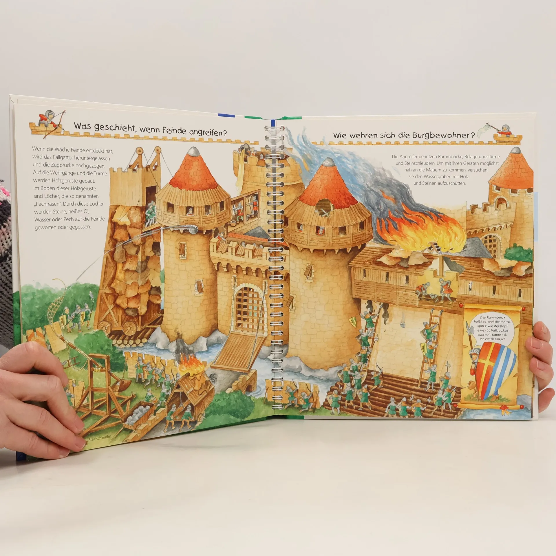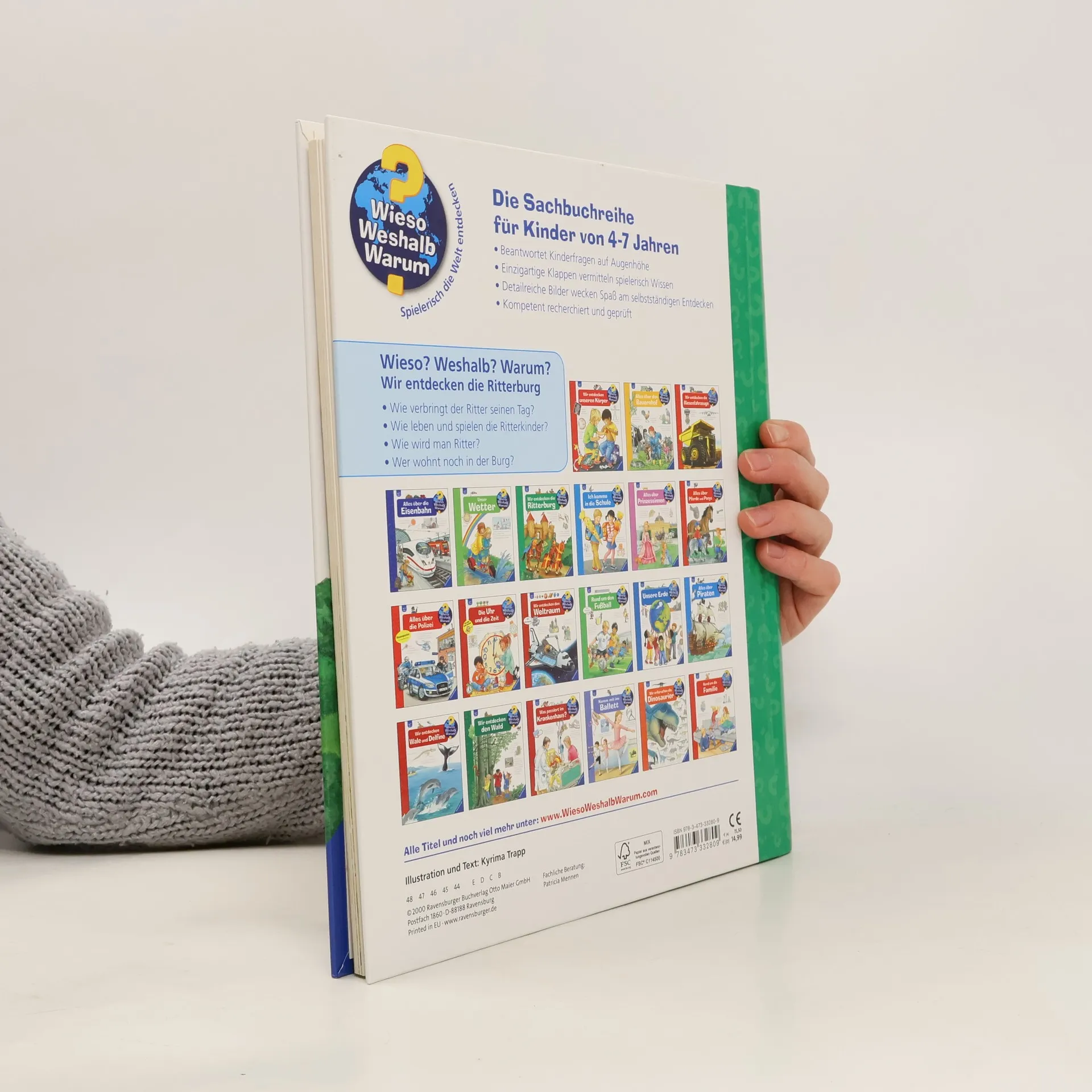 Willkommen auf der Ritterburg! Von der Spitze des höchsten Turms bis zum Verlies gibt es hier jede Menge zu entdecken: Wer lebte auf der Burg? Wie trainierten Knappe und Ritter Reiten und Schwertkampf? Was spielten Kinder im Mittelalter? Mithilfe von Klappen ziehen Kinder dem Ritter seine Rüstung an, lassen ihm beim Turnier antreten oder verteidigen die Burg gegen eine Belagerung. So wird Geschichte Kindern lebendig vermittelt. Wieso? Weshalb? Warum? Die Sachbuchreihe für Kinder von 4–7 Jahren Jeden Tag entdecken Kinder etwas Neues – da kommen viele Fragen auf. Warum sind die Dinosaurier ausgestorben? Wo ist die Sonne in der Nacht? Wozu brauchen wir das Blut? Die beliebte Sachbuchreihe Wieso? Weshalb? Warum? gibt Kindern Antworten auf Augenhöhe. Dabei werden die unterschiedlichsten Themen aus der Alltags- und Interessenswelt der Kinder altersgerecht und mit viel Liebe zum Detail unter die Lupe genommen. Detailreiche Bilder, verständliche Sachtexte und überraschende Klappen, die Bewegungen oder Abläufe veranschaulichen und hinter die Dinge blicken lassen, ermöglichen Kindern, sich ihre Themen selbst zu erschließen. Der Spaß am eigenhändigen Entdecken, die liebevolle Umsetzung und die qualitativ hochwertige Ausstattung garantieren langanhaltende Freude an jedem einzelnen Buch.