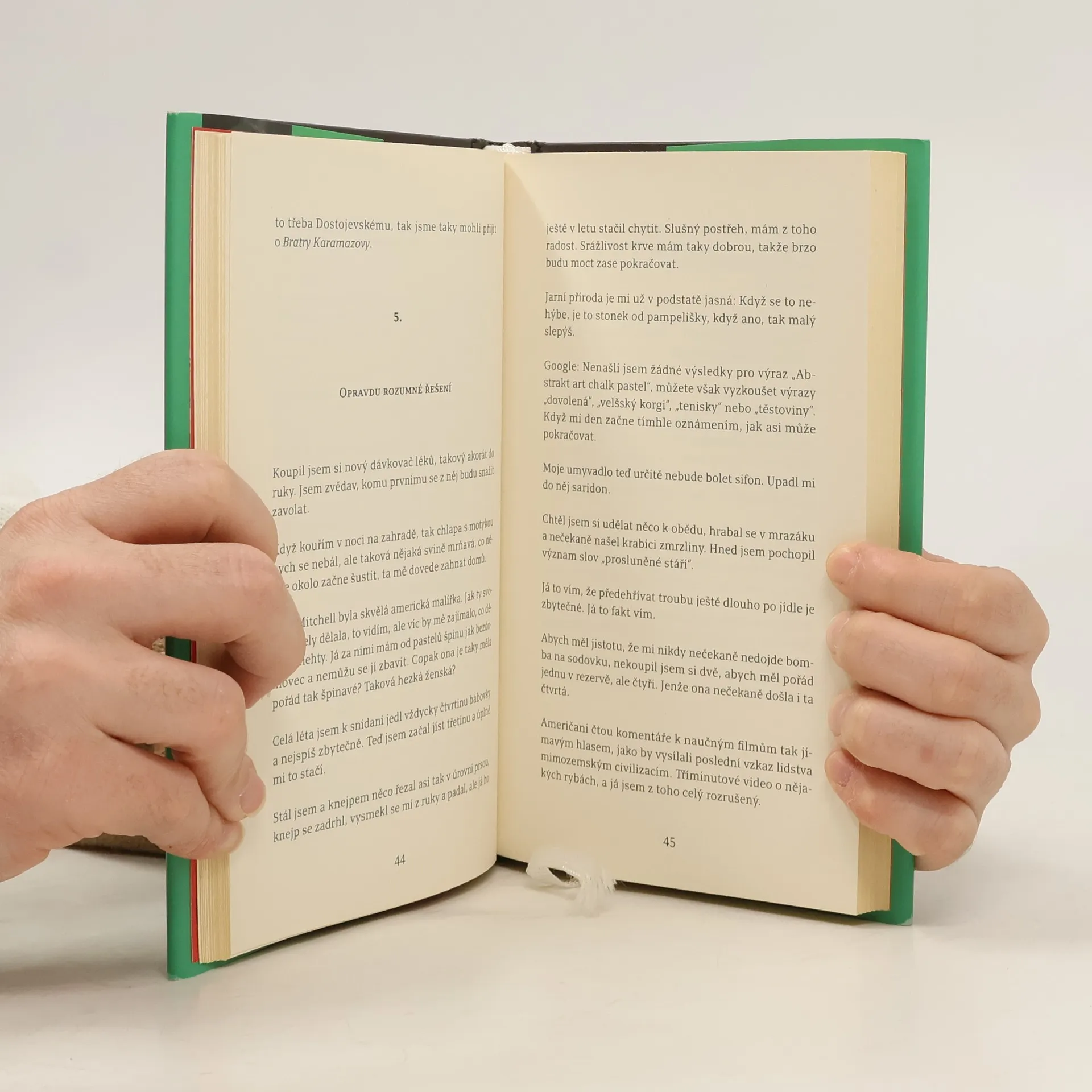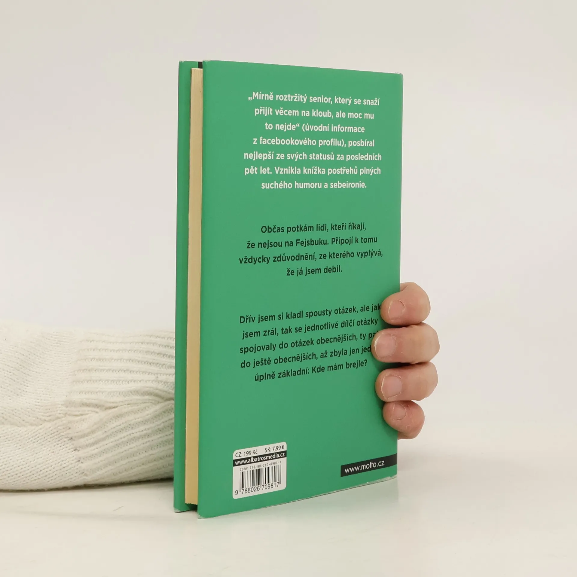 Občas potkám lidi, kteří říkají, že nejsou na Fejsbuku. Připojí k tomu vždycky zdůvodnění, ze kterého vyplývá, že já jsem debil. Co já už přečetl knih o duševní práci. Jak má být optimistické prostředí, ergonomicky správné sezení, čistý vzduch a kdo ví co ještě, a stejně všechno důležité jsem zatím vymyslel při cigáru zmáčknutý na stoličce mezi zdí a vanou v koupelně. Dřív jsem si kladl spousty otázek, ale jak jsem zrál, tak se jednotlivé dílčí otázky spojovaly do otázek obecnějších, ty pak do ještě obecnějších, až zbyla jen jedna úplně základní: Kde mám brejle?